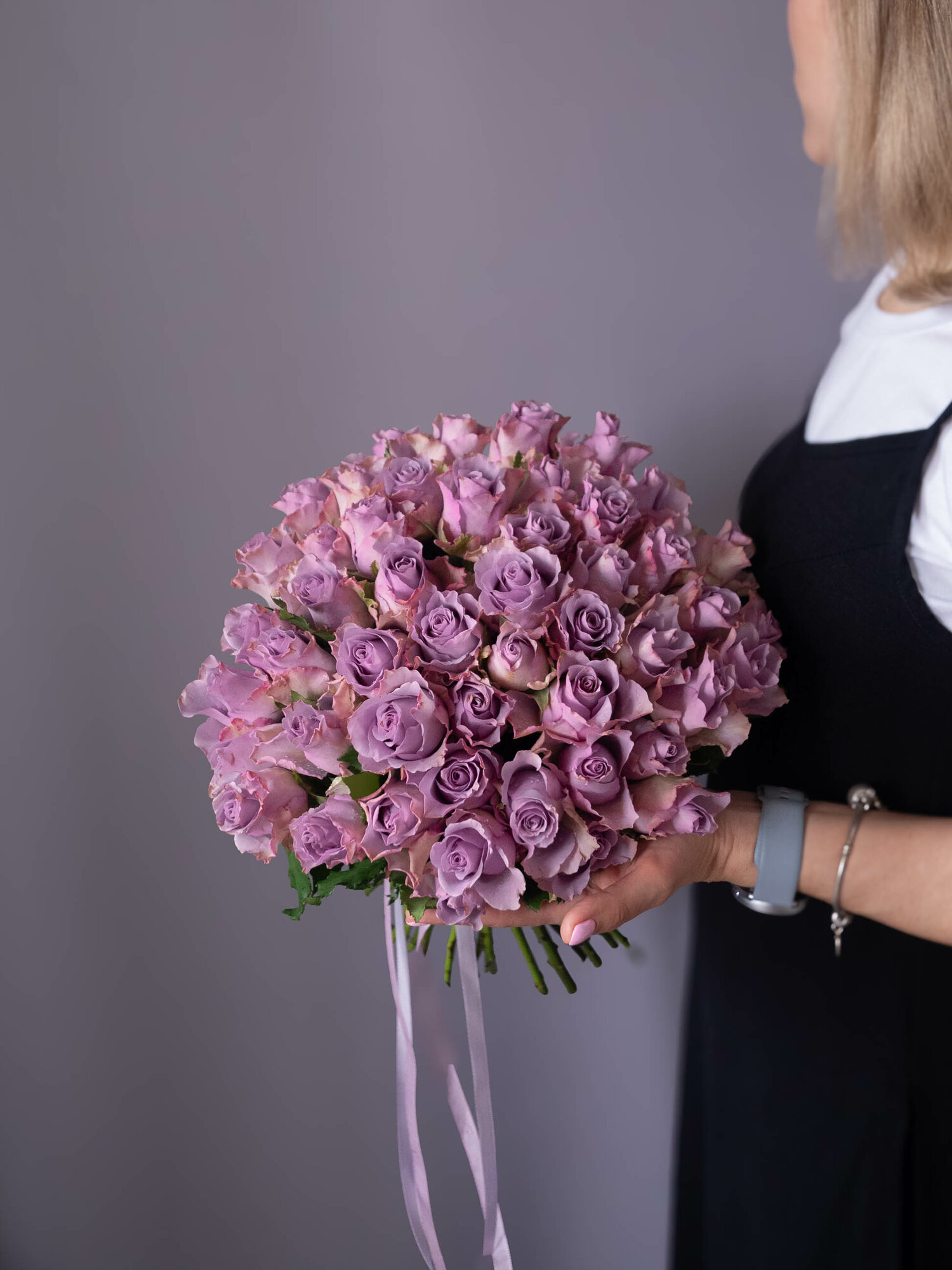 Купить Букет живых цветов из 49 розы сиреневого цвета с изящными зелеными прожилками