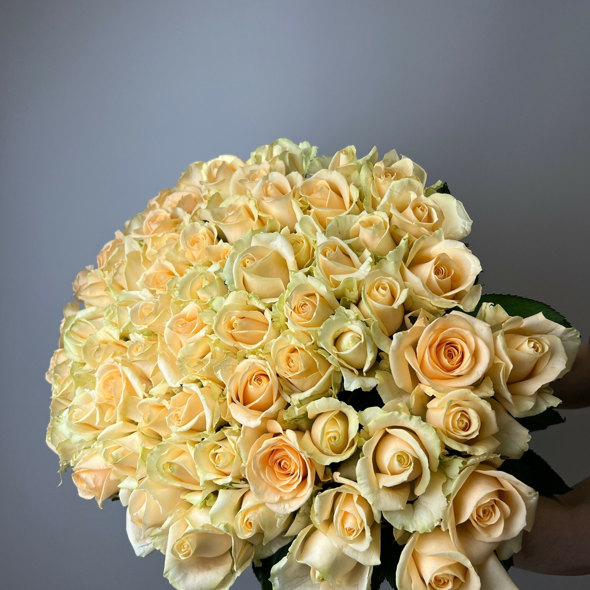 Живые цветы букет из 101 кремовой розы 60 см "Цветочный Потоп", сорт - "Пич Аваланж"