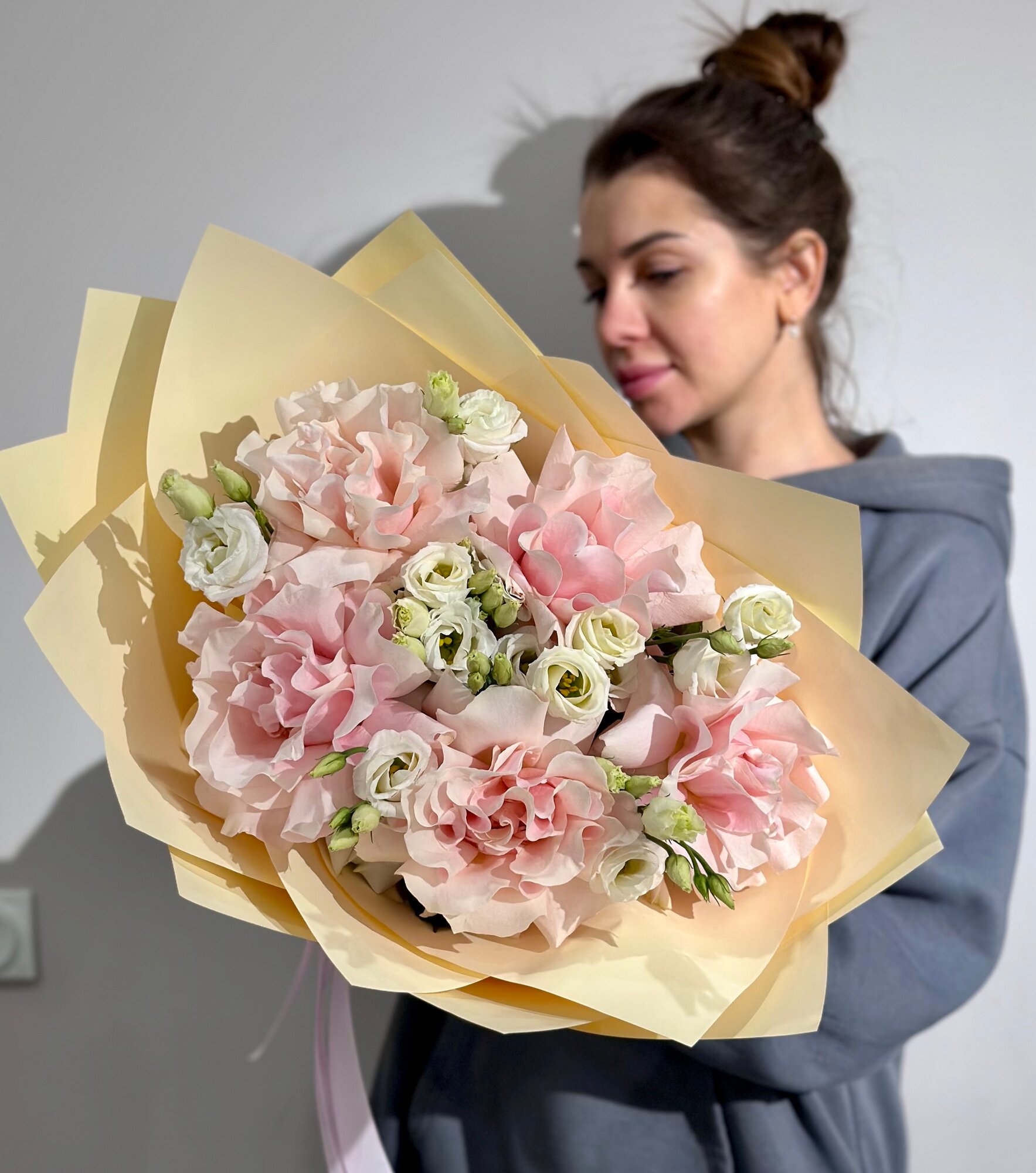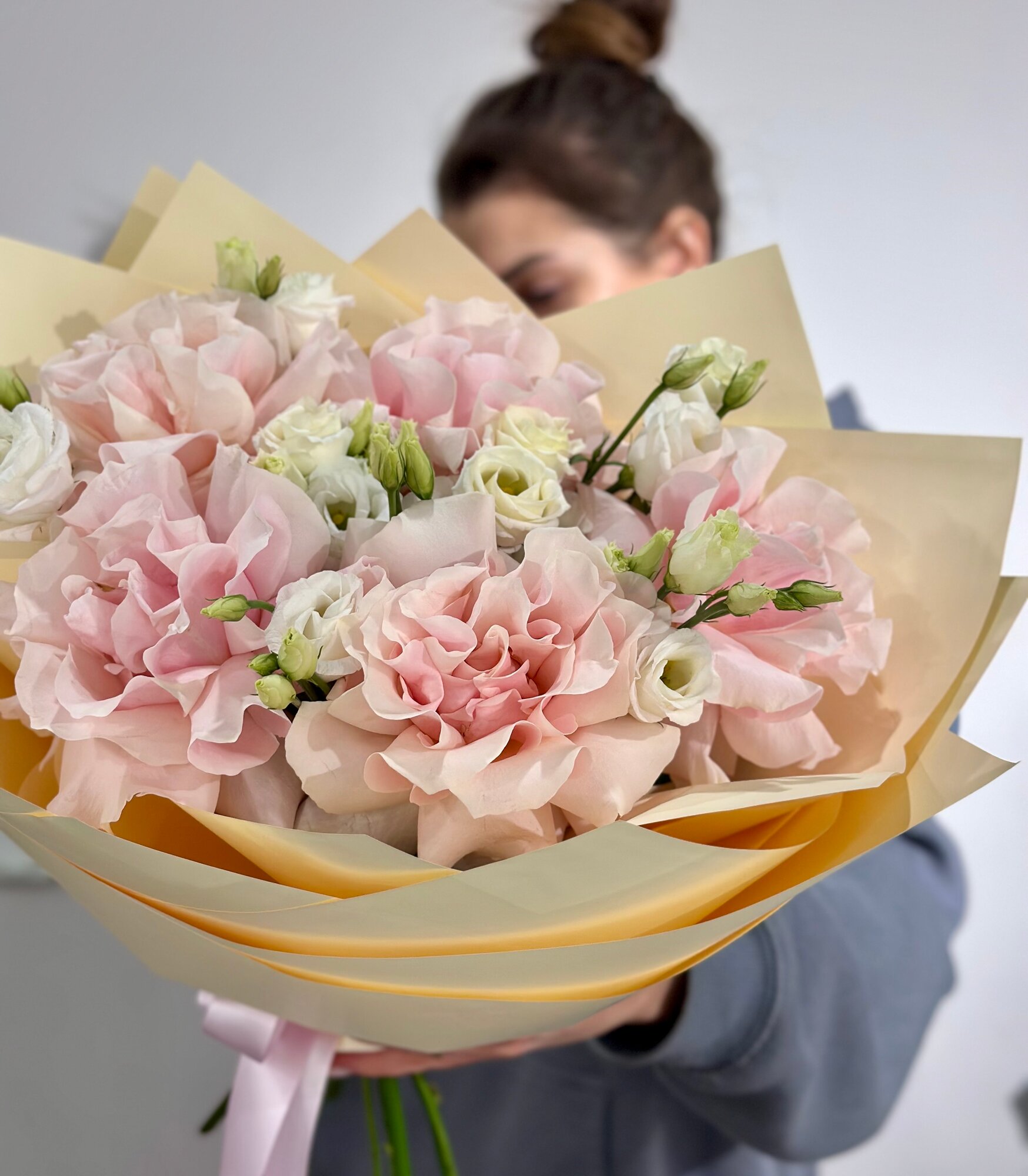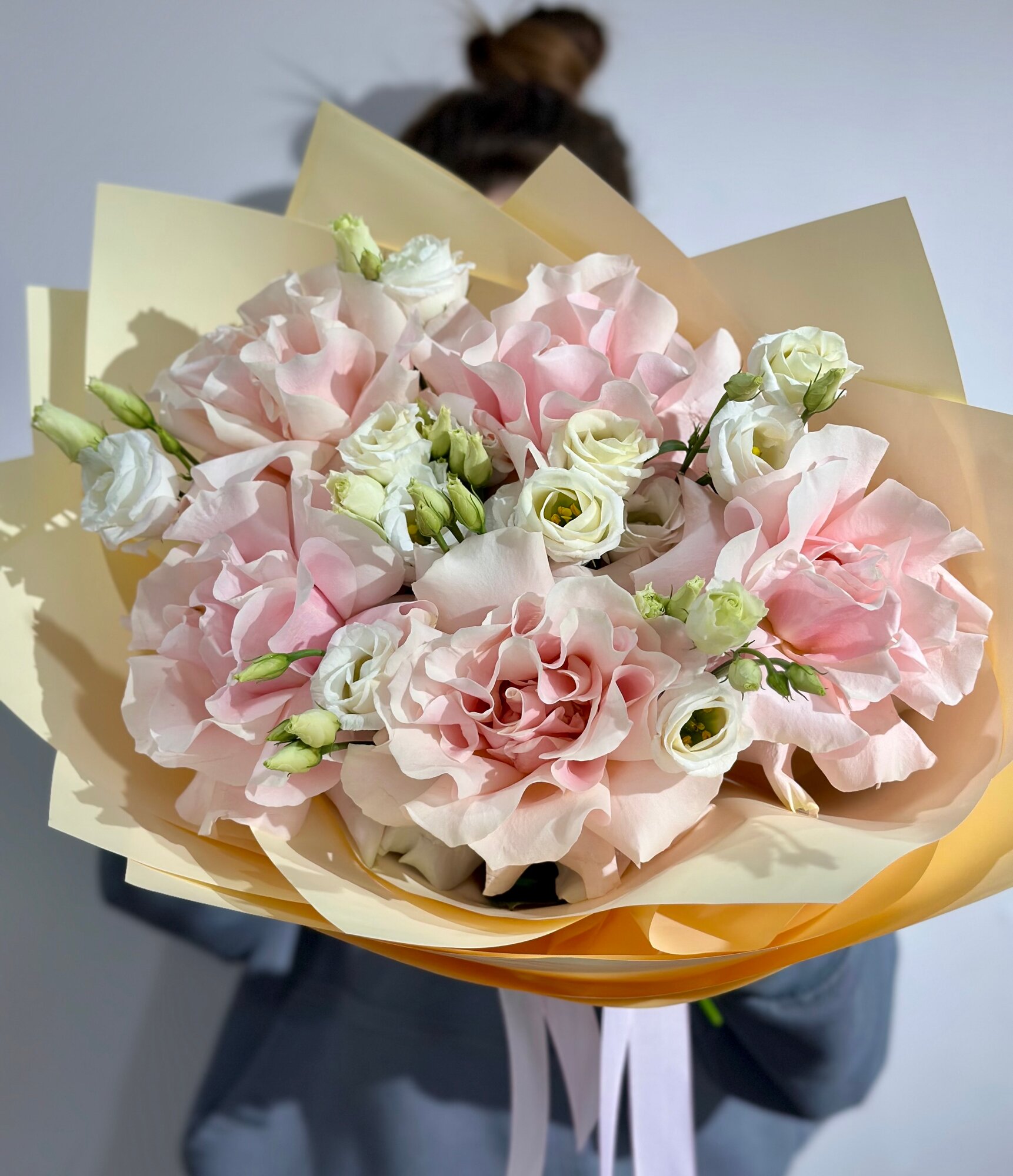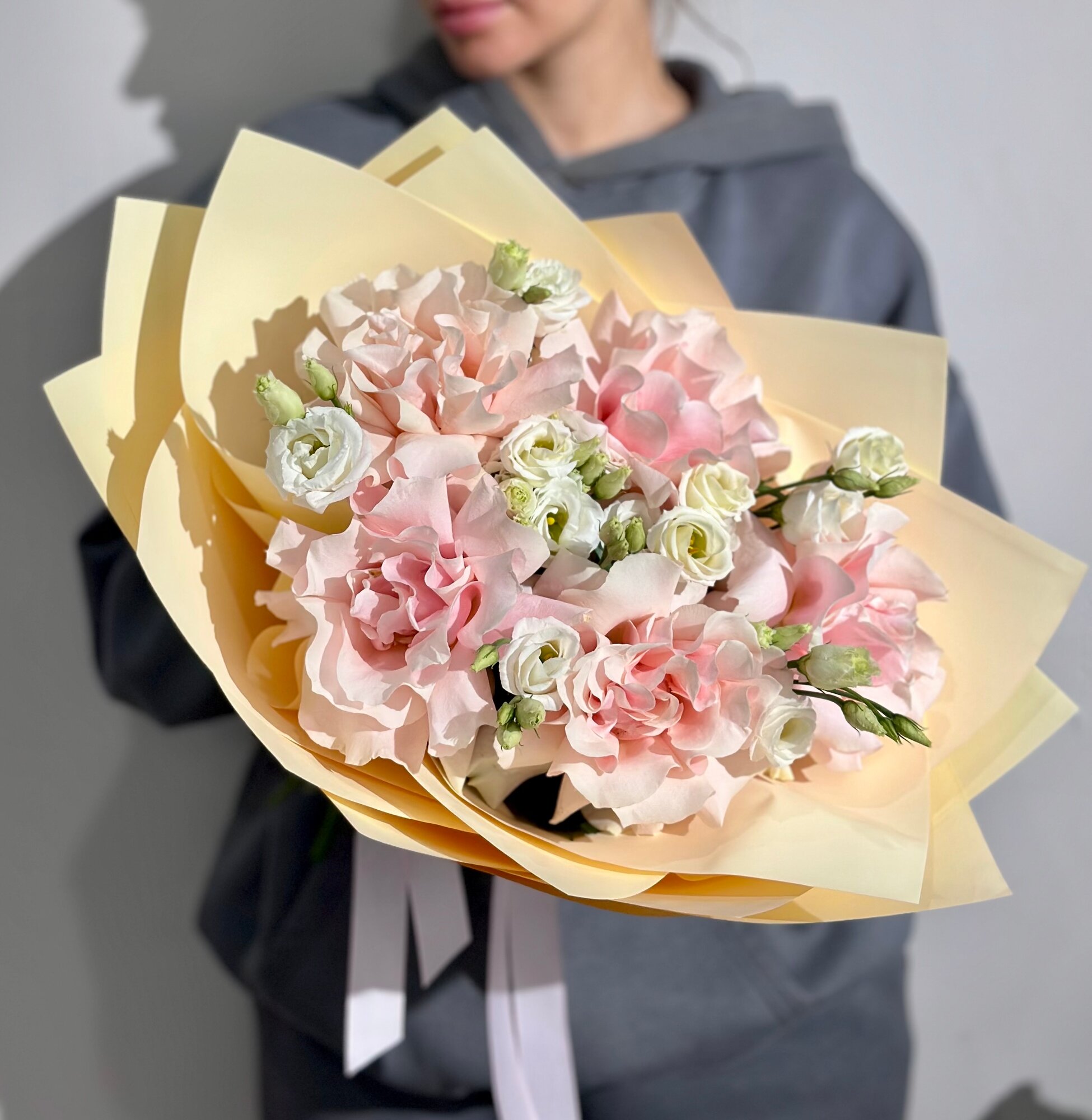 Купить Сборный букет из розовых французских роз и эустомы c открыткой в нежной упаковке, высота 50см, живые цветы с доставкой