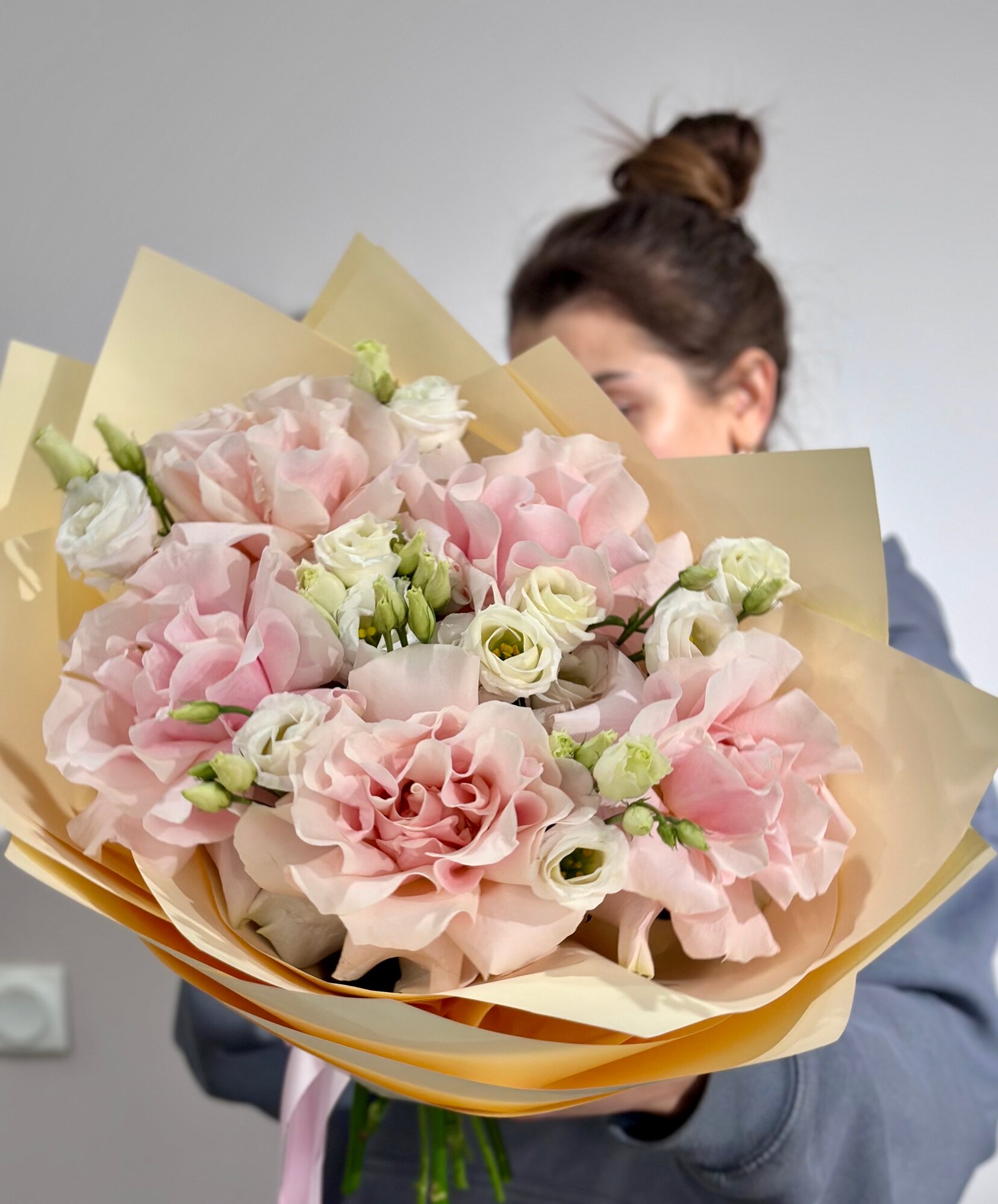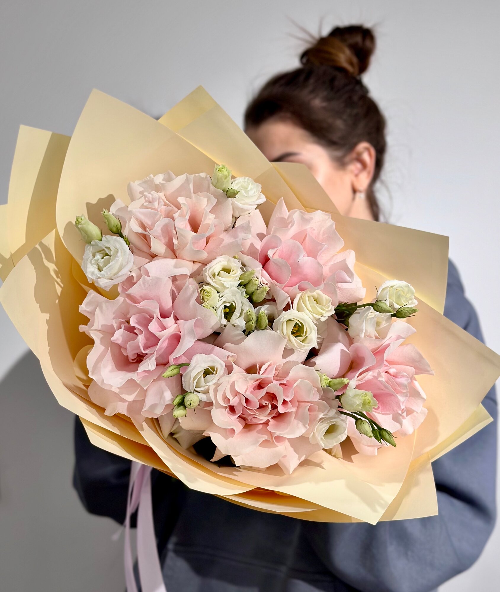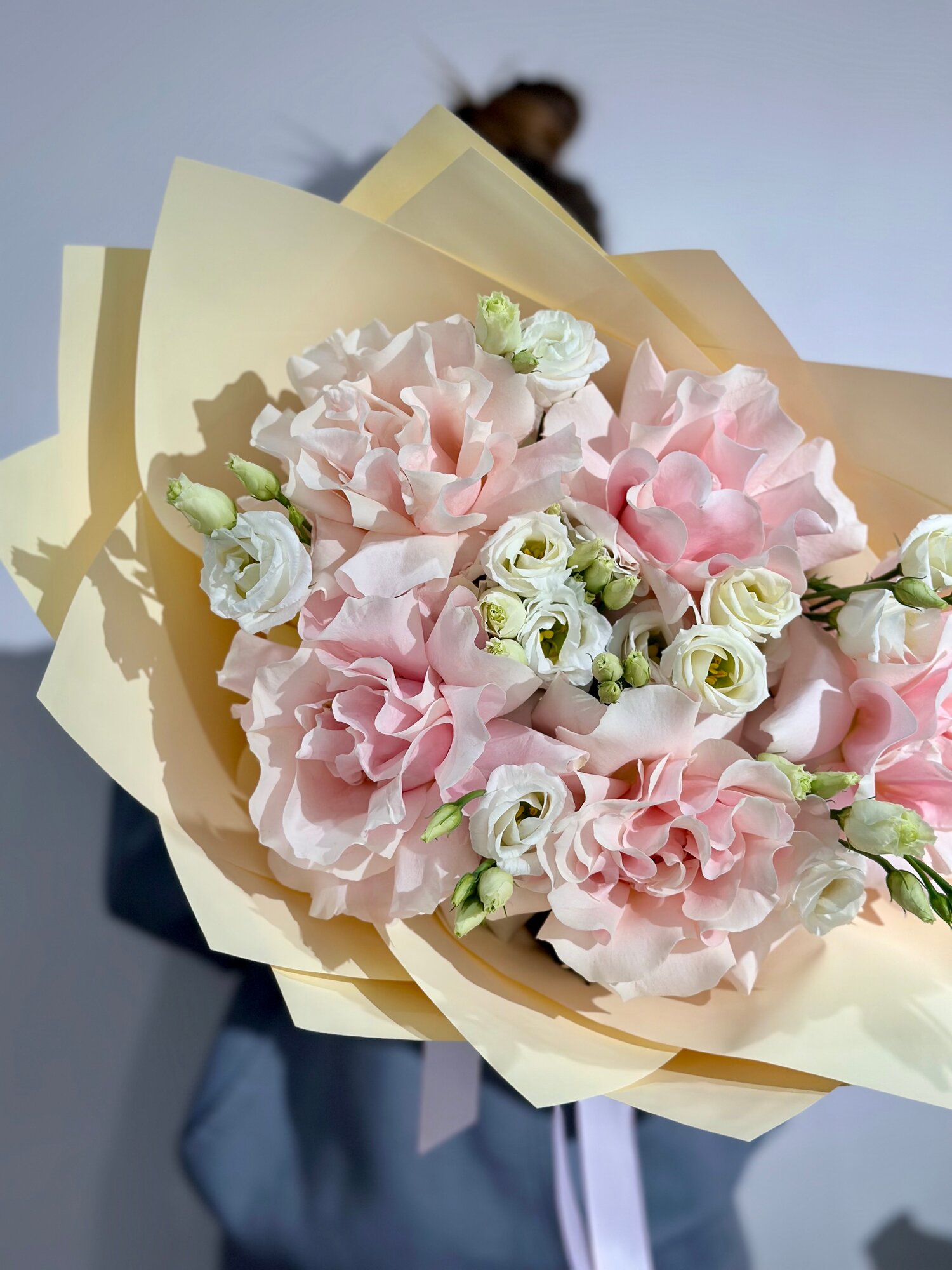 Купить Сборный букет из розовых французских роз и эустомы c открыткой в нежной упаковке, высота 50см, живые цветы с доставкой