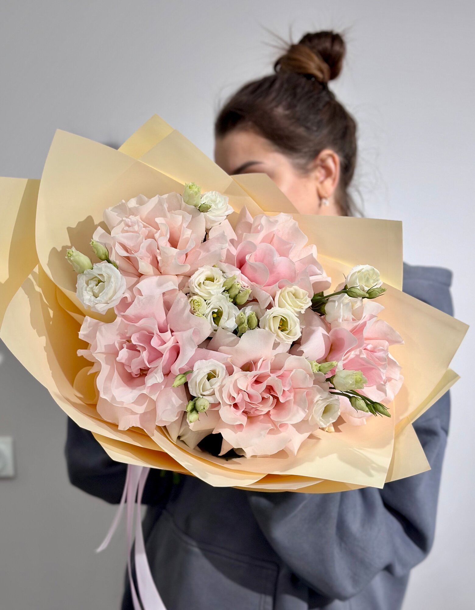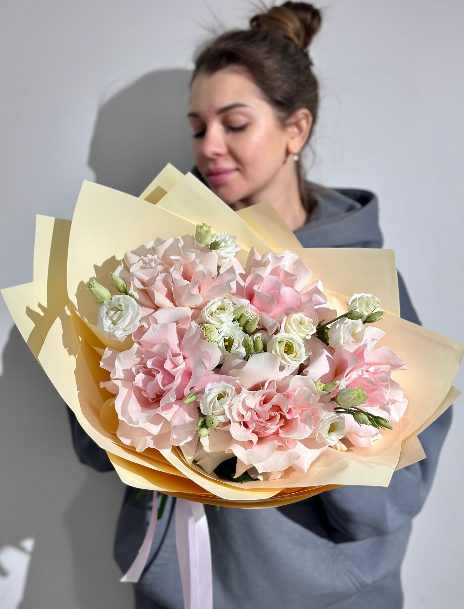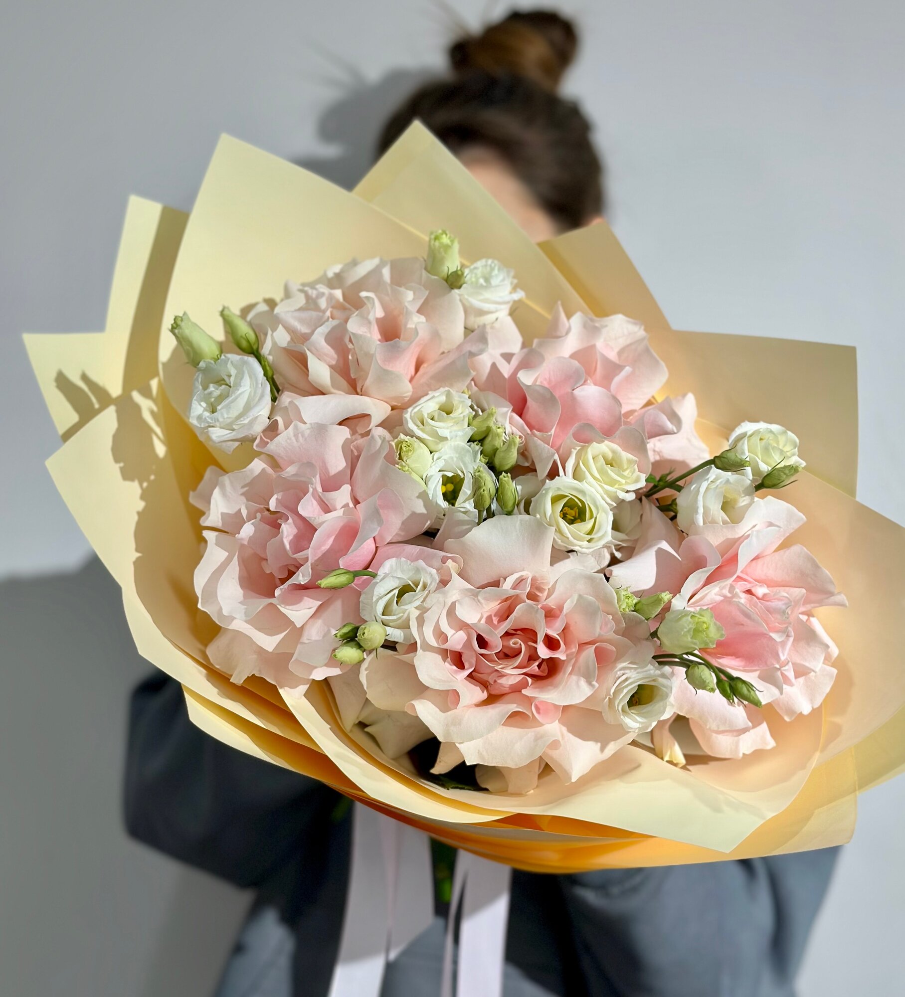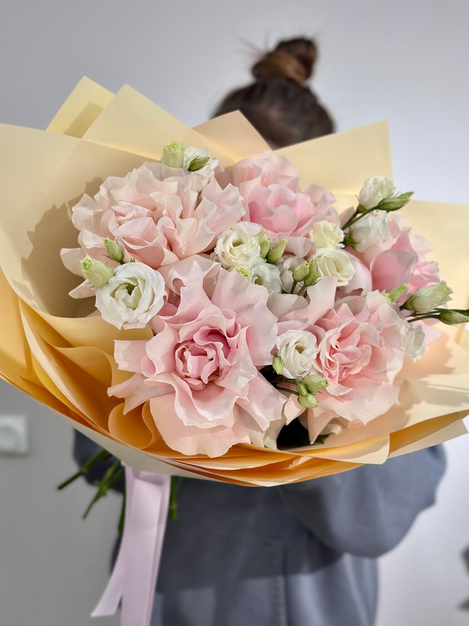 Купить Сборный букет из розовых французских роз и эустомы c открыткой в нежной упаковке, высота 50см, живые цветы с доставкой