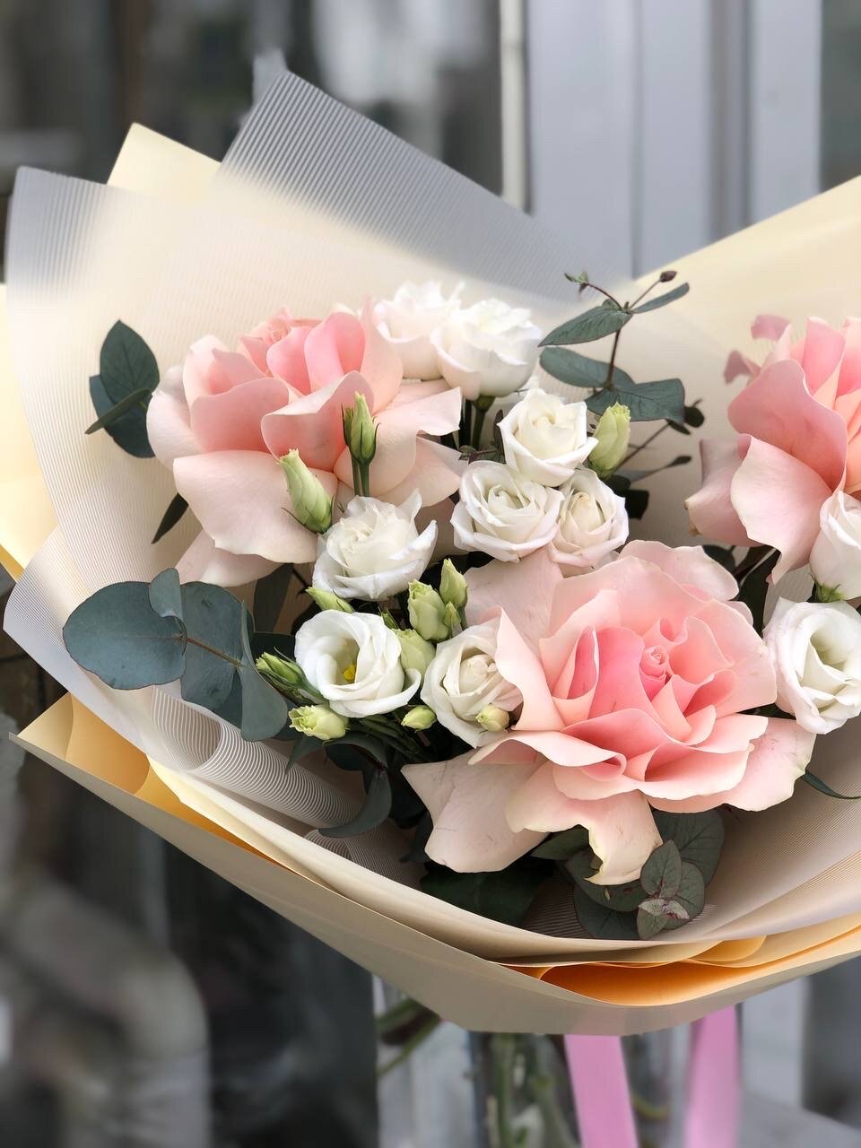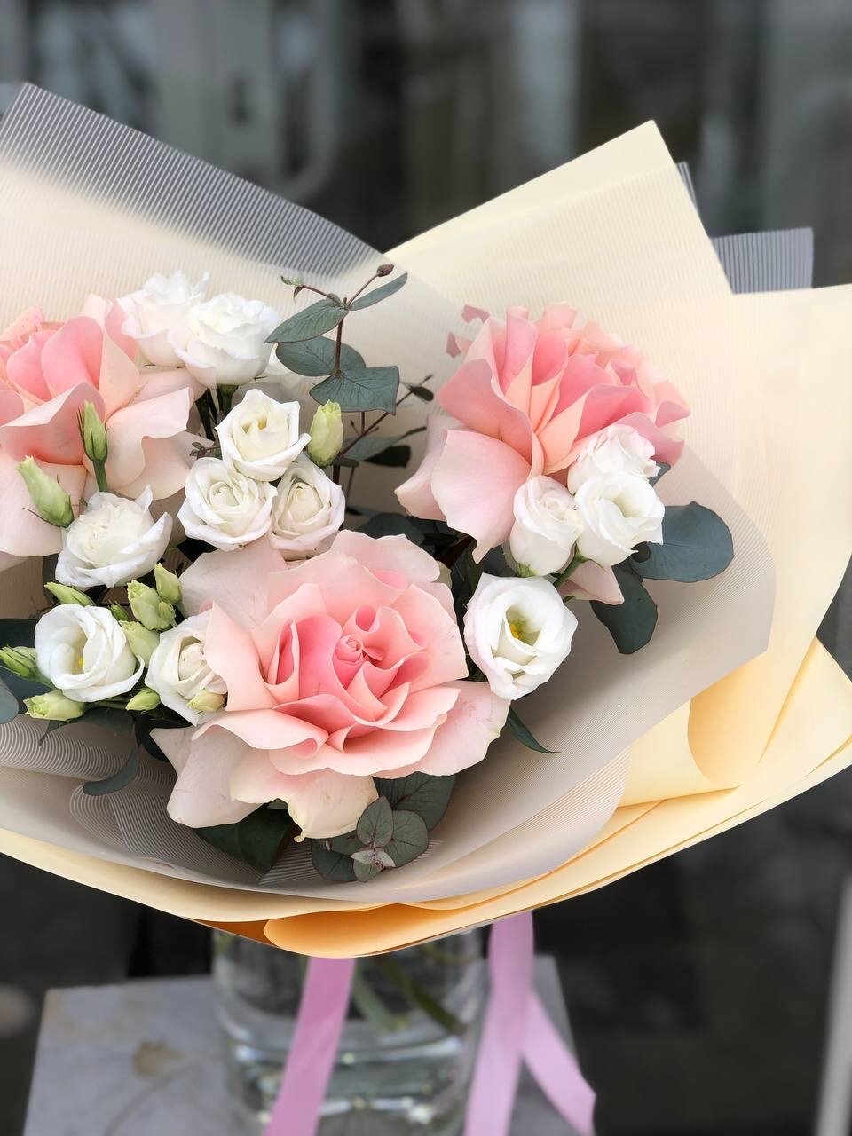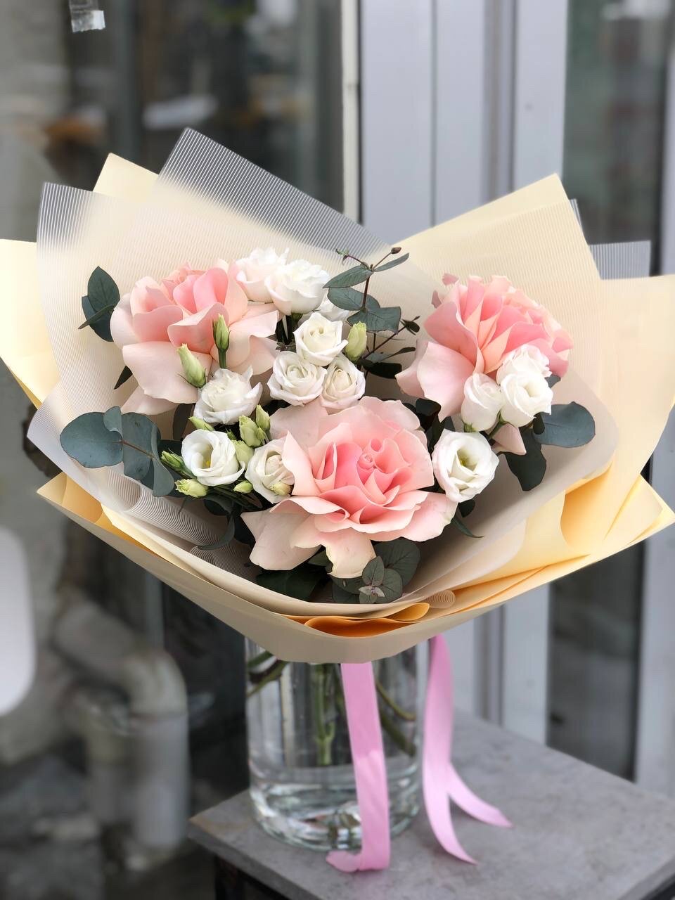 Купить Букет из розовых французских роз с белой эустомой и веточками эвкалипта букет 45 см размер S