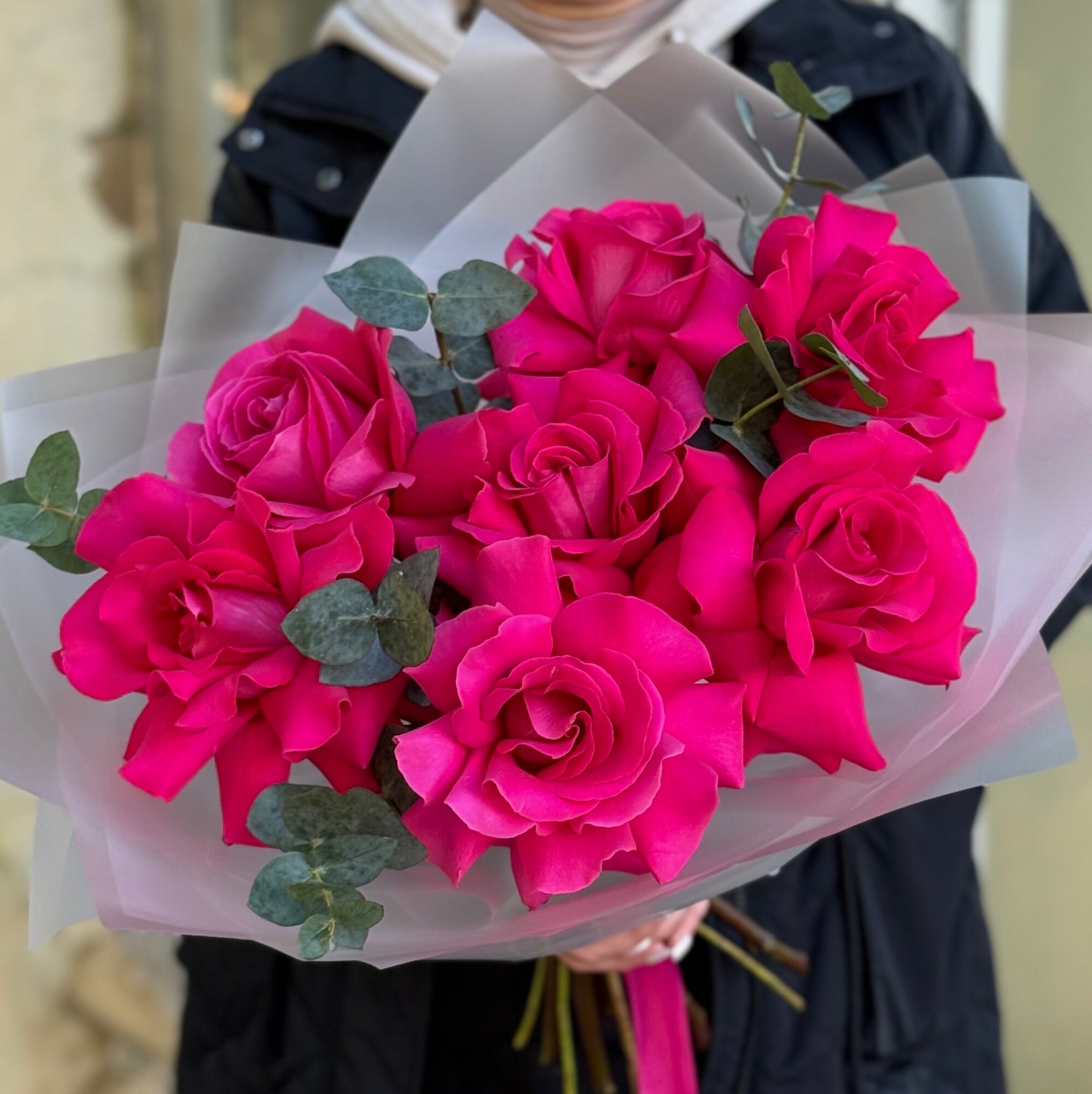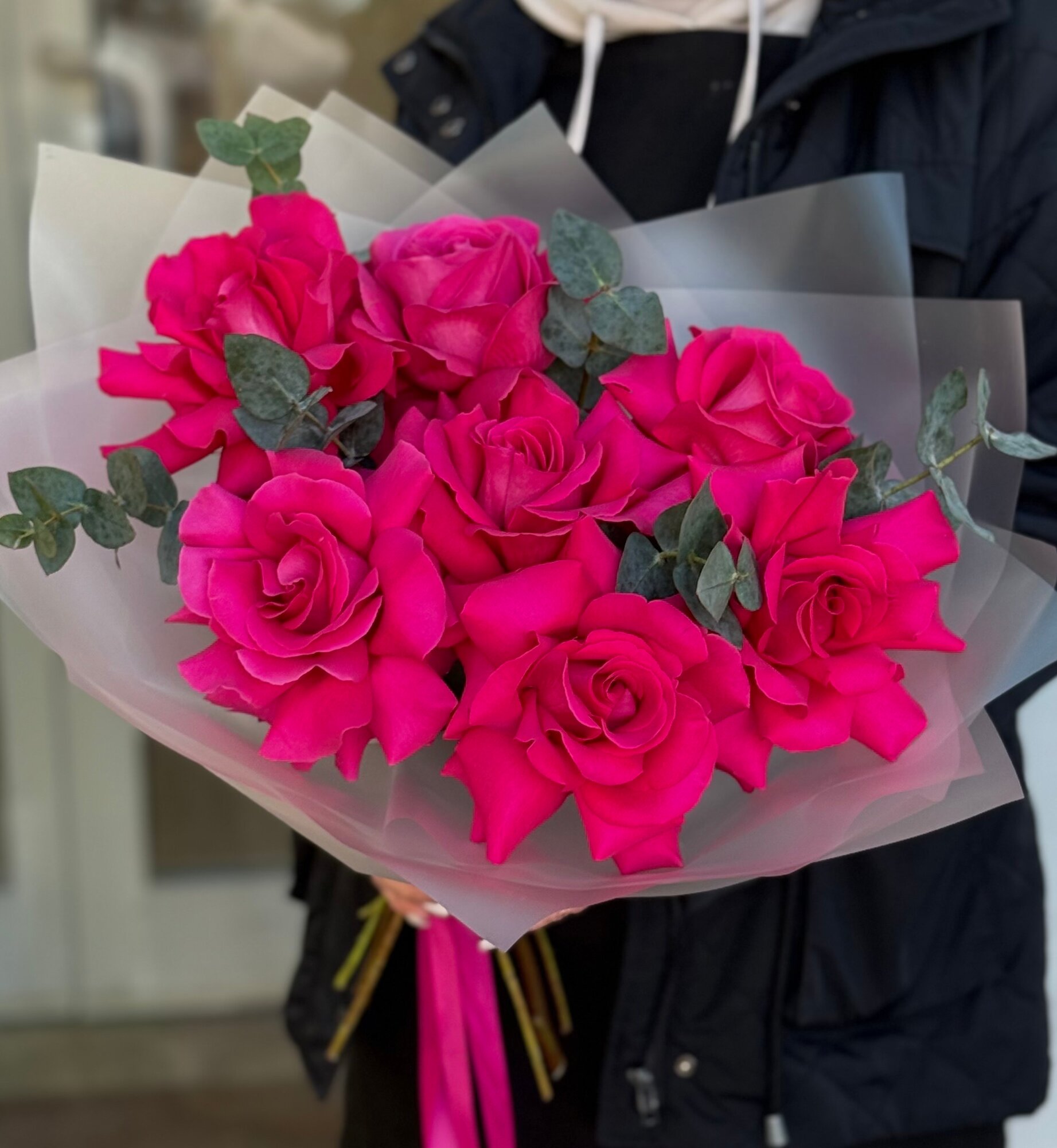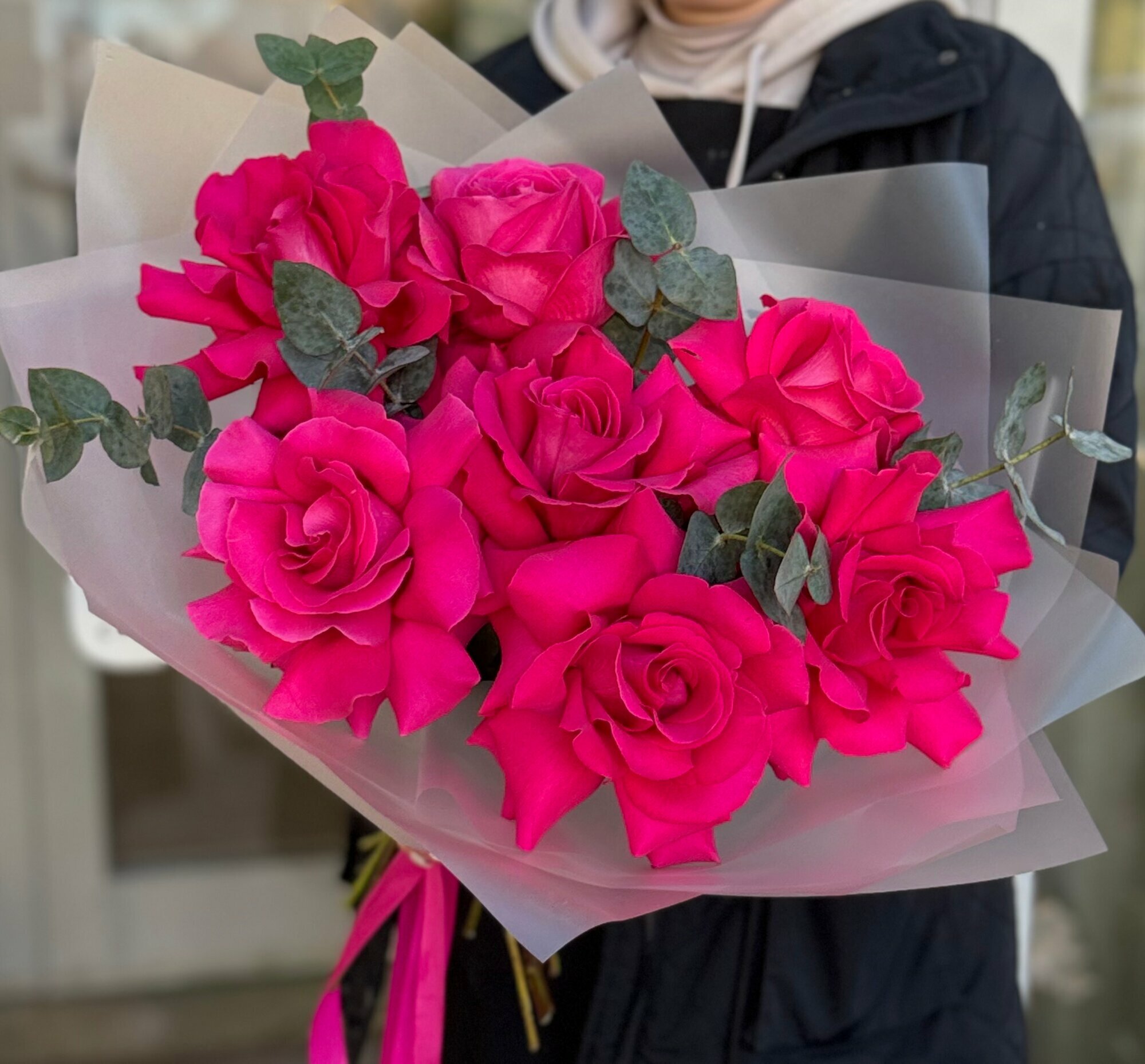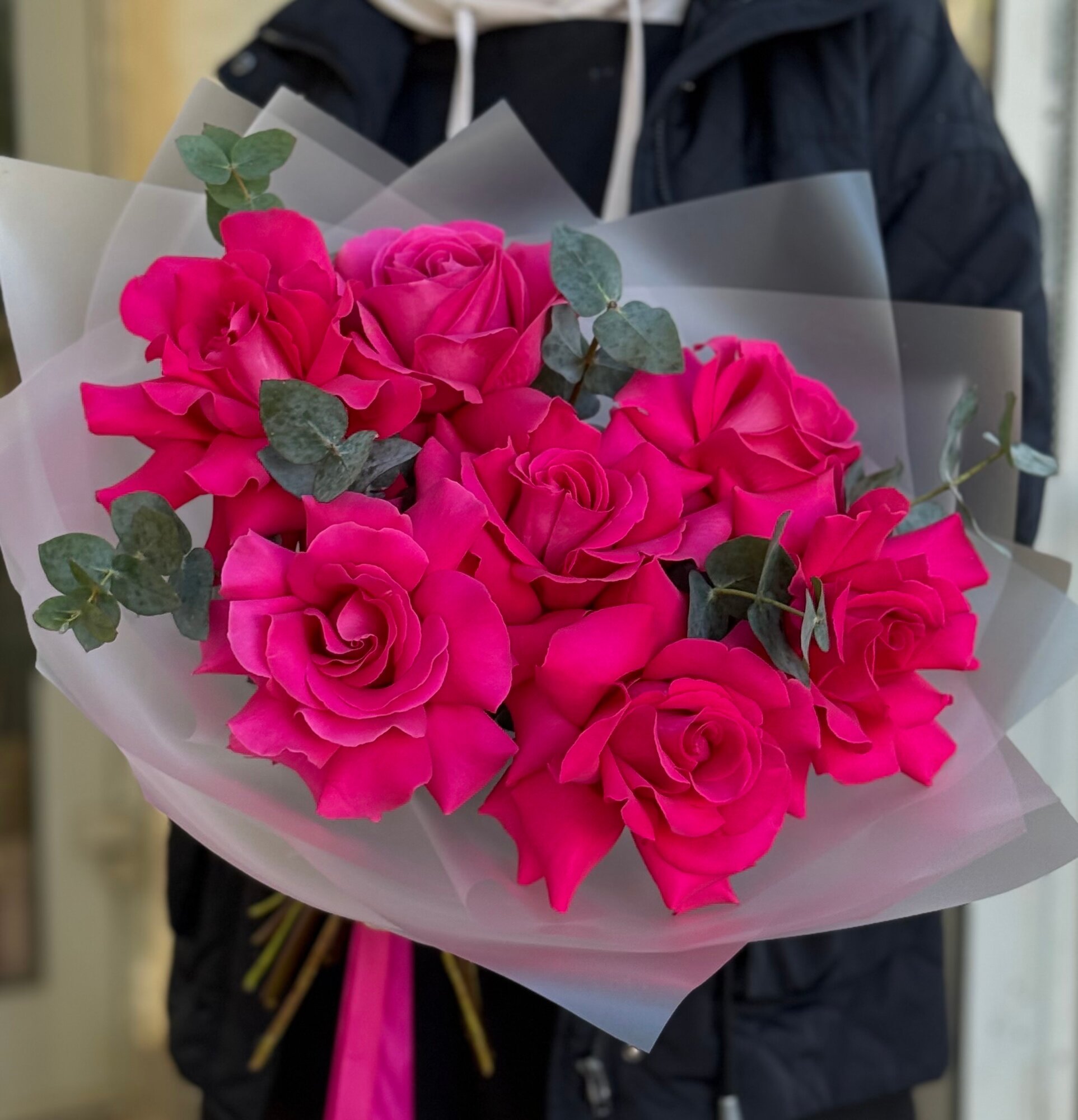 Купить Букет ароматных малиновых французских роз с веточками эвкалипта в упаковке с атласными лентами, букет 45см, 7 шт