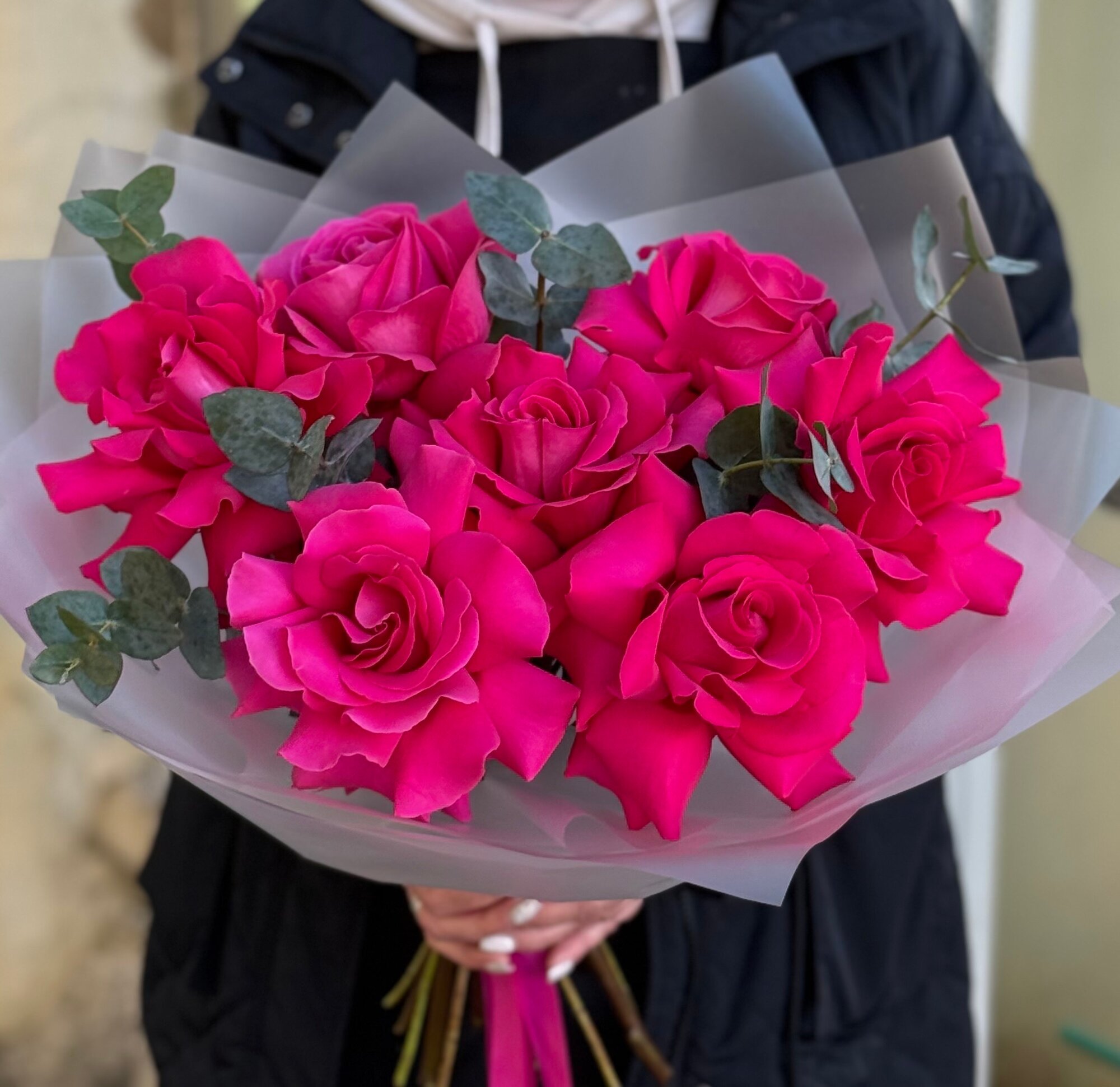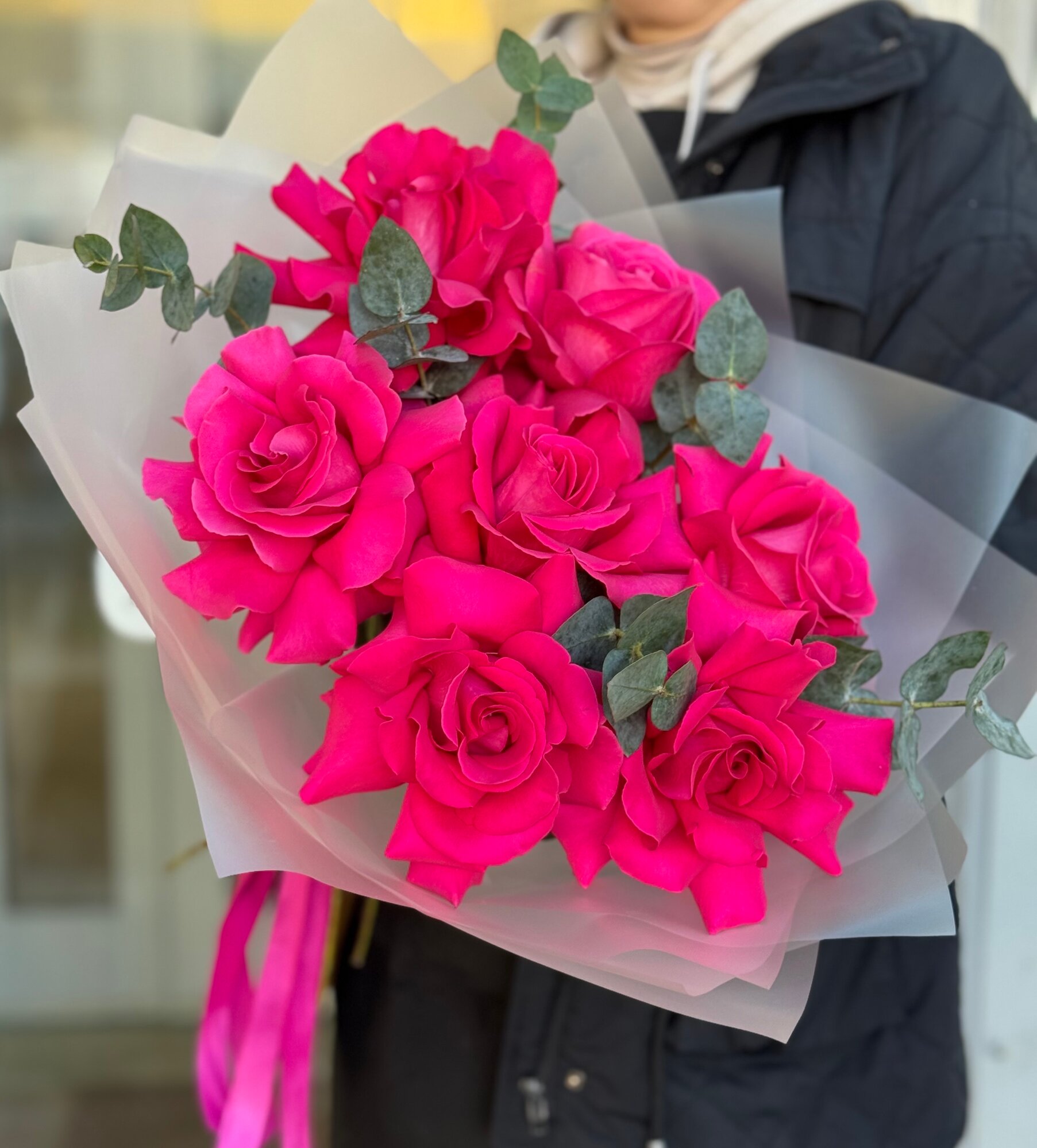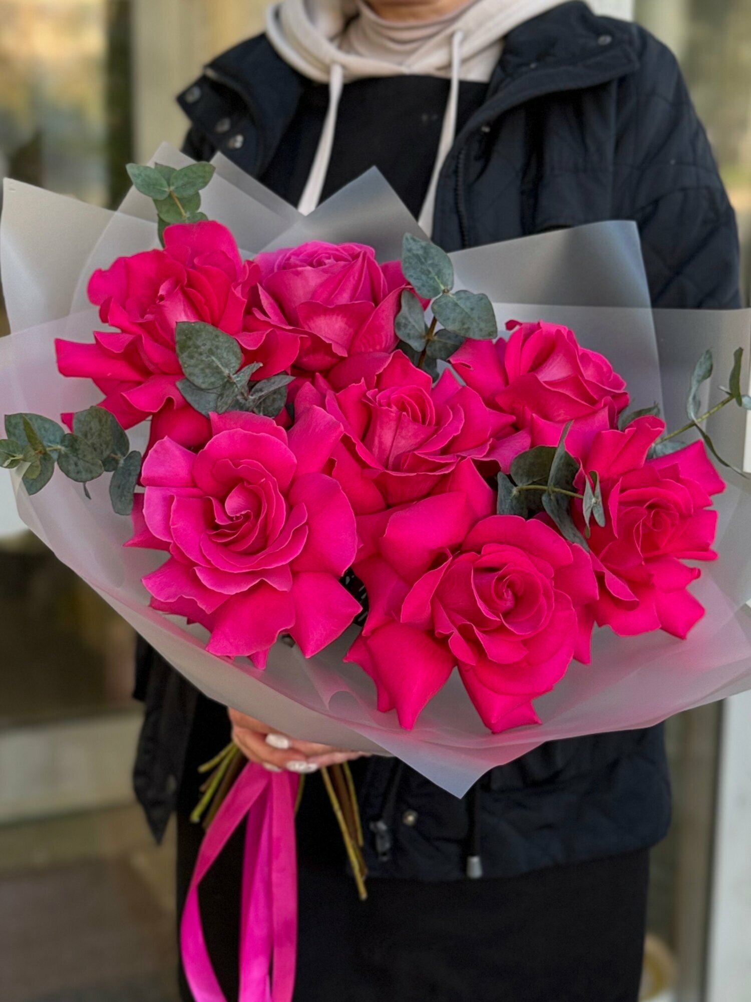 Купить Букет ароматных малиновых французских роз с веточками эвкалипта в упаковке с атласными лентами, букет 45см, 7 шт