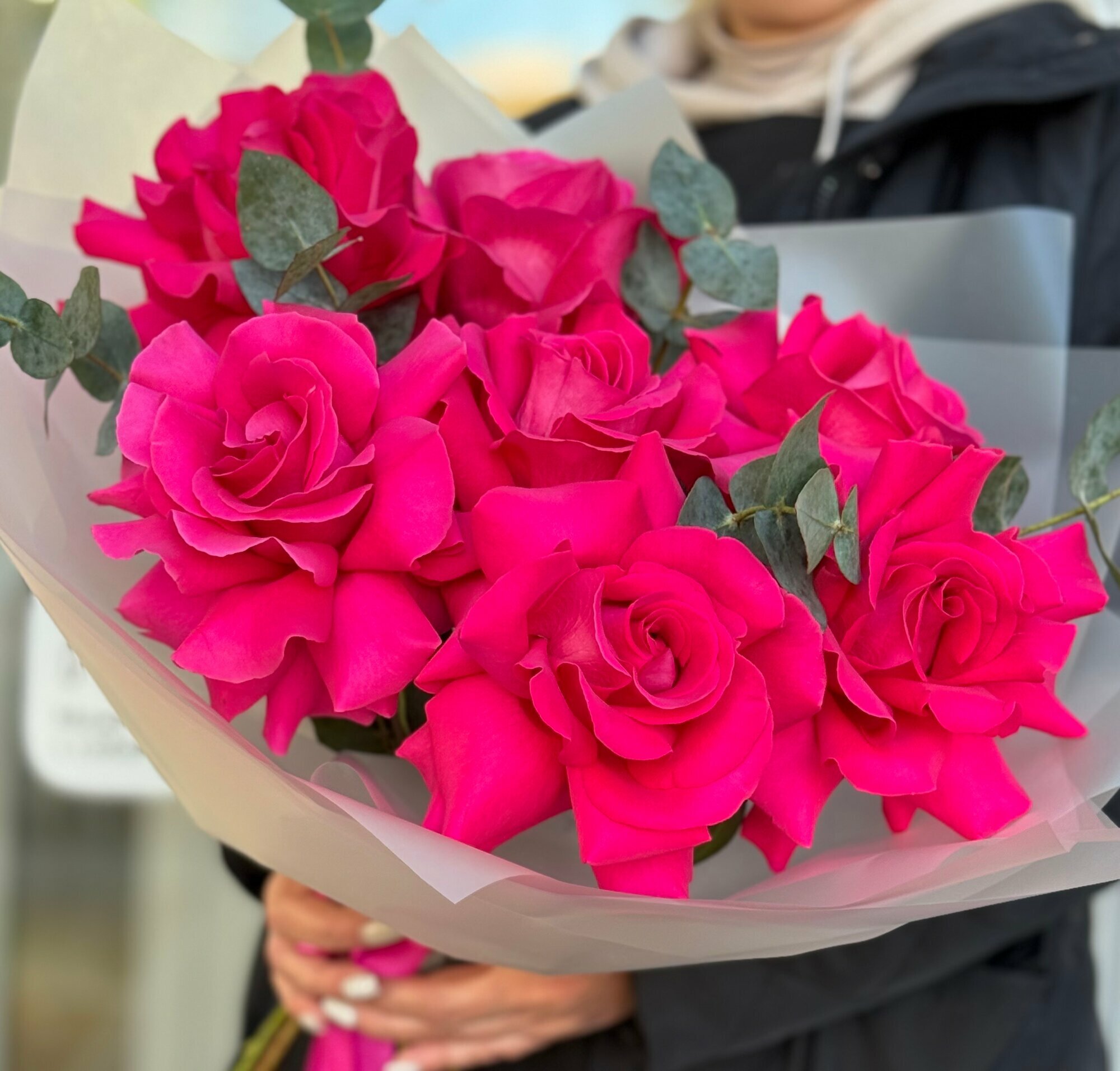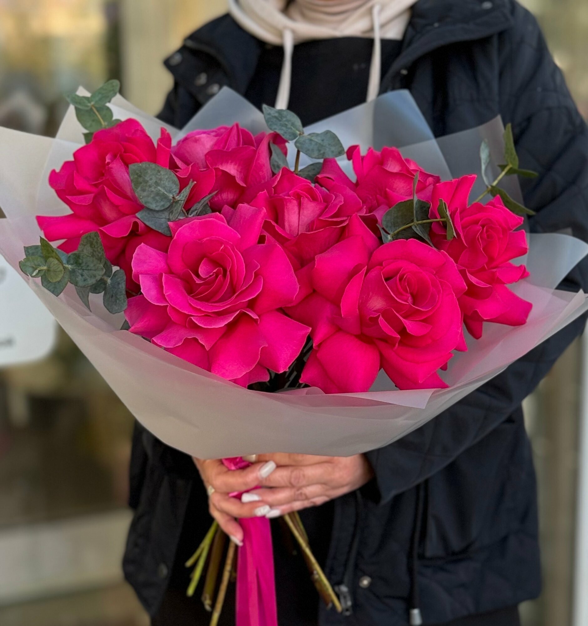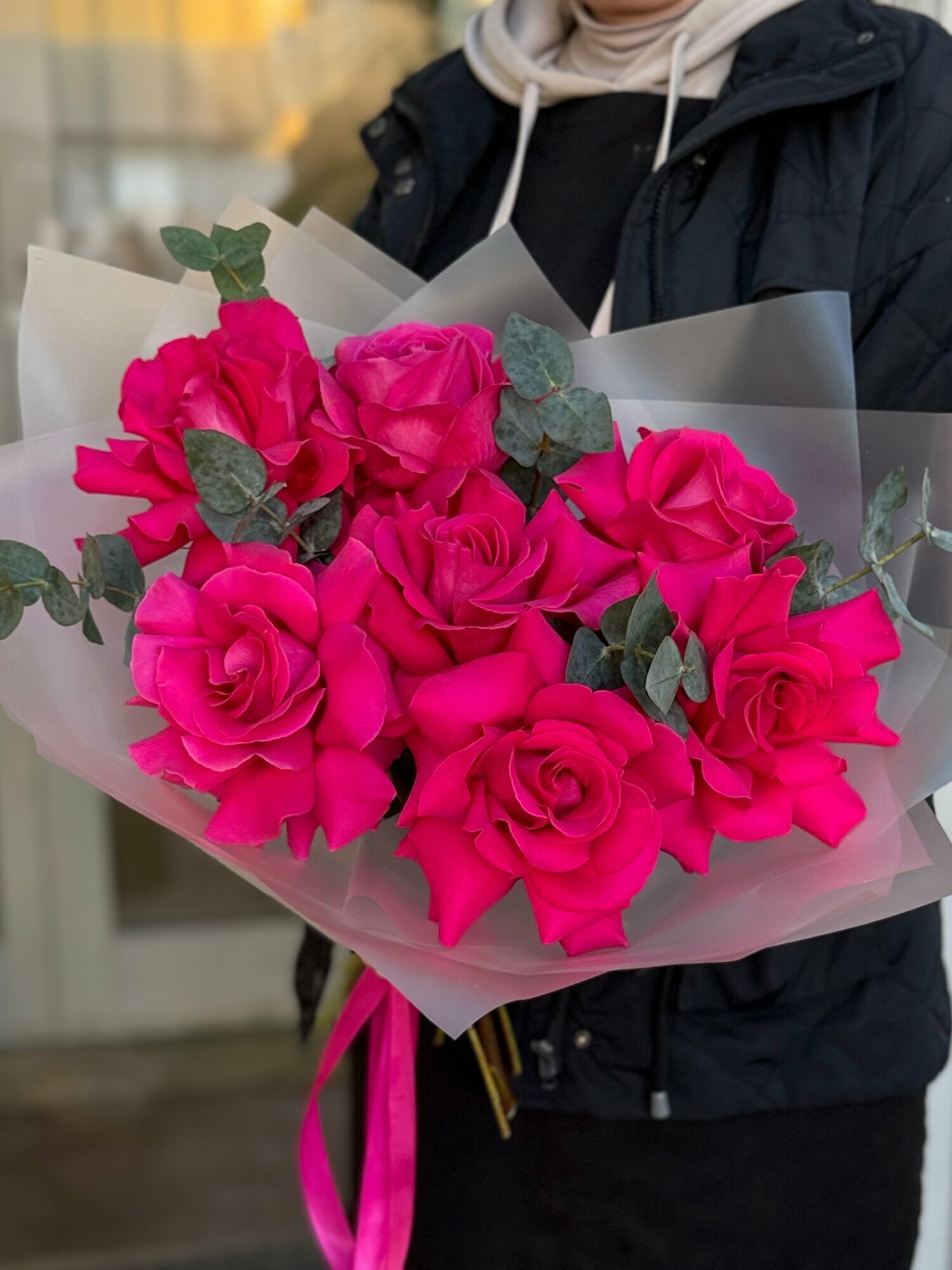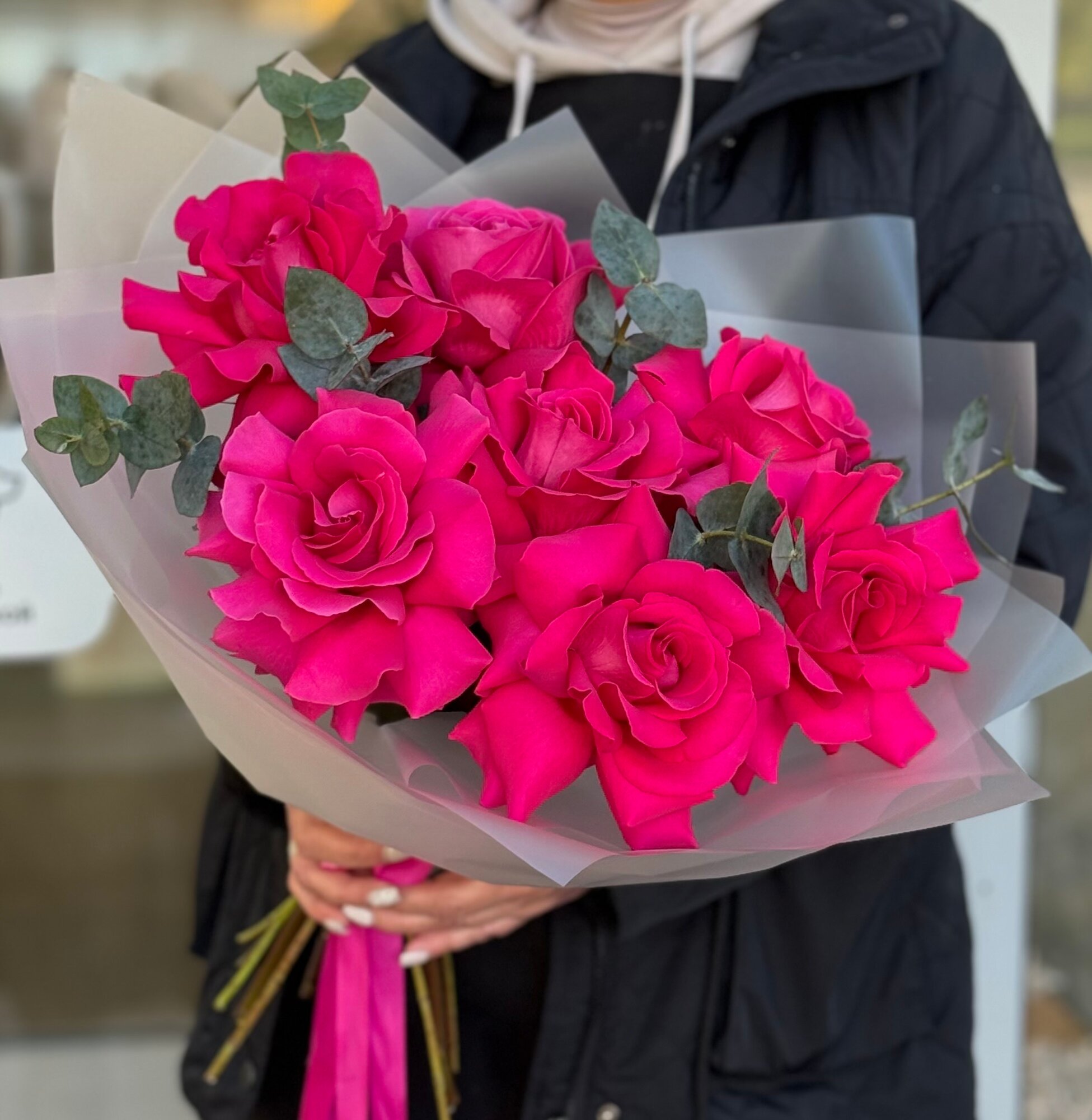 Купить Букет ароматных малиновых французских роз с веточками эвкалипта в упаковке с атласными лентами, букет 45см, 7 шт
