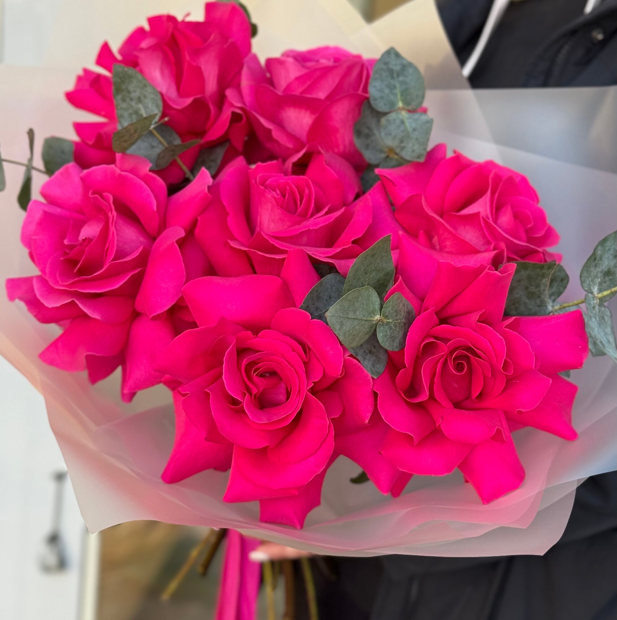 СохранитьБукет ароматных малиновых французских роз с веточками эвкалипта в упаковке с атласными лентами, букет 45см, 7 шт интересное: