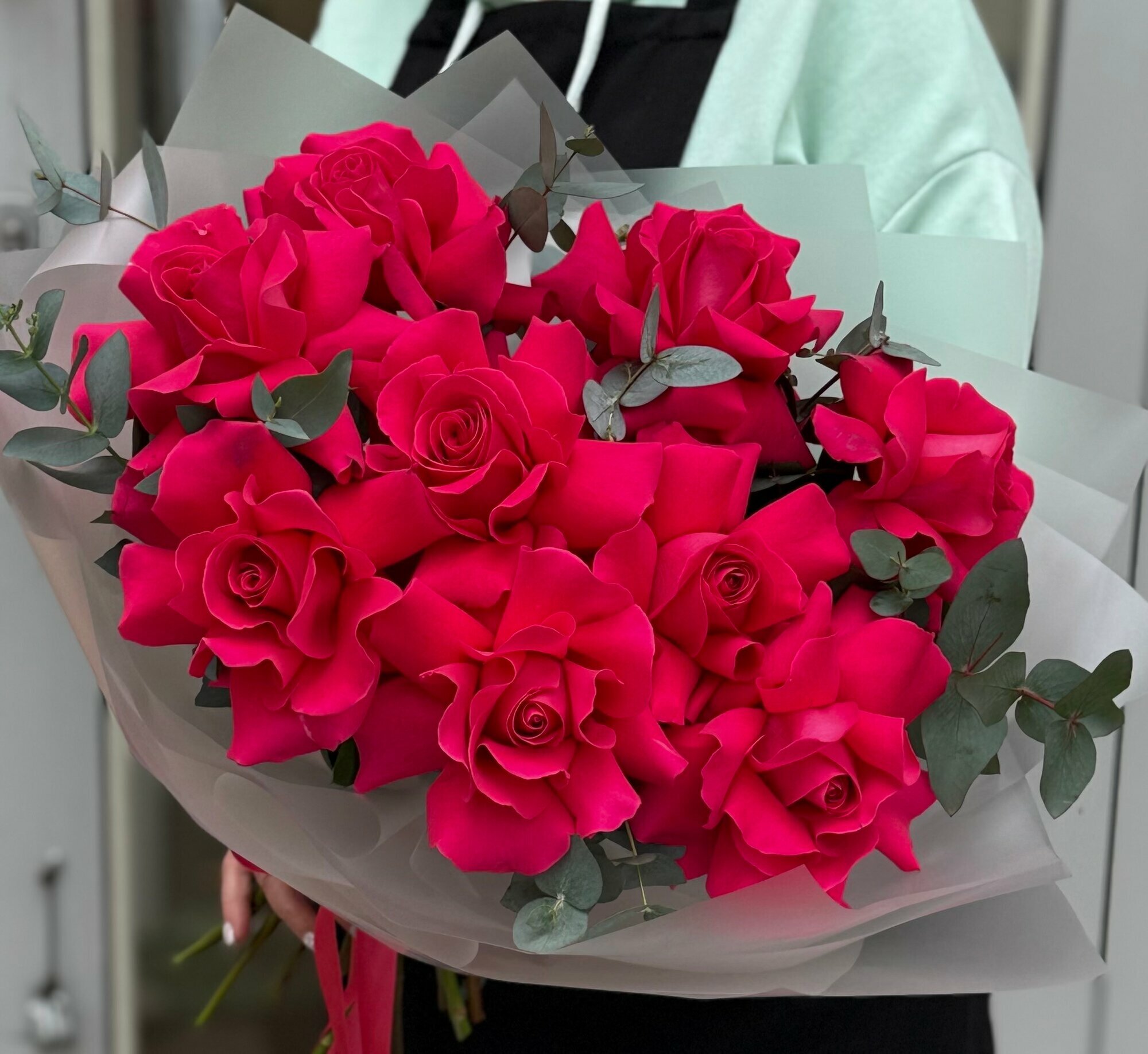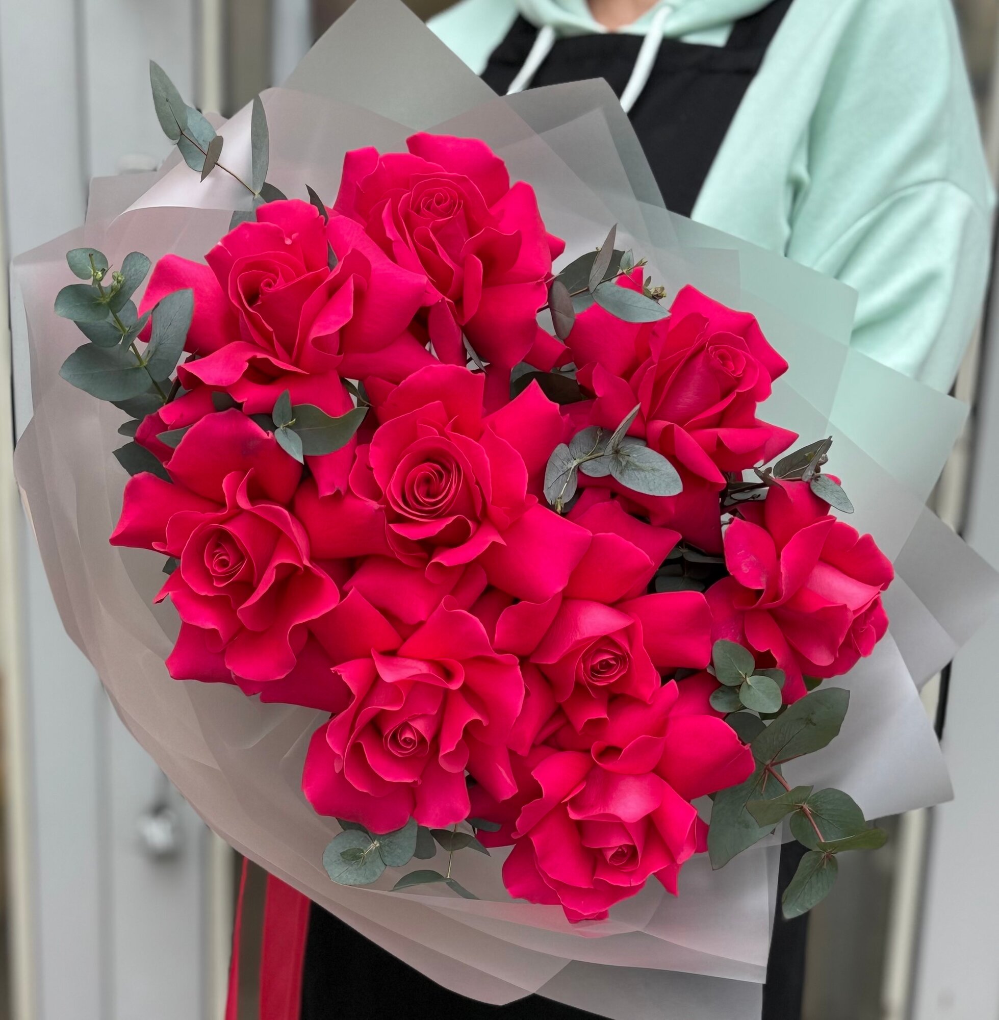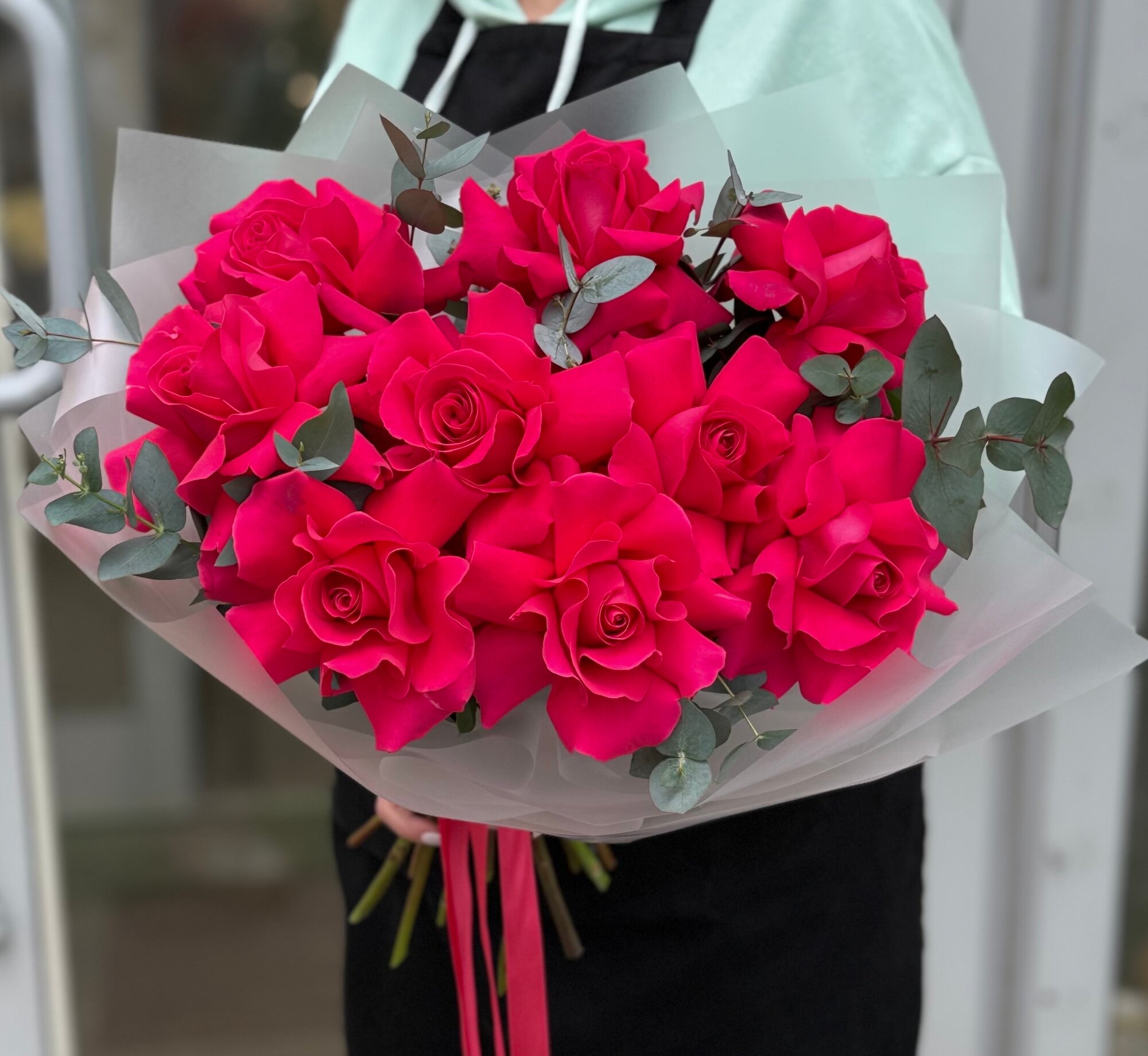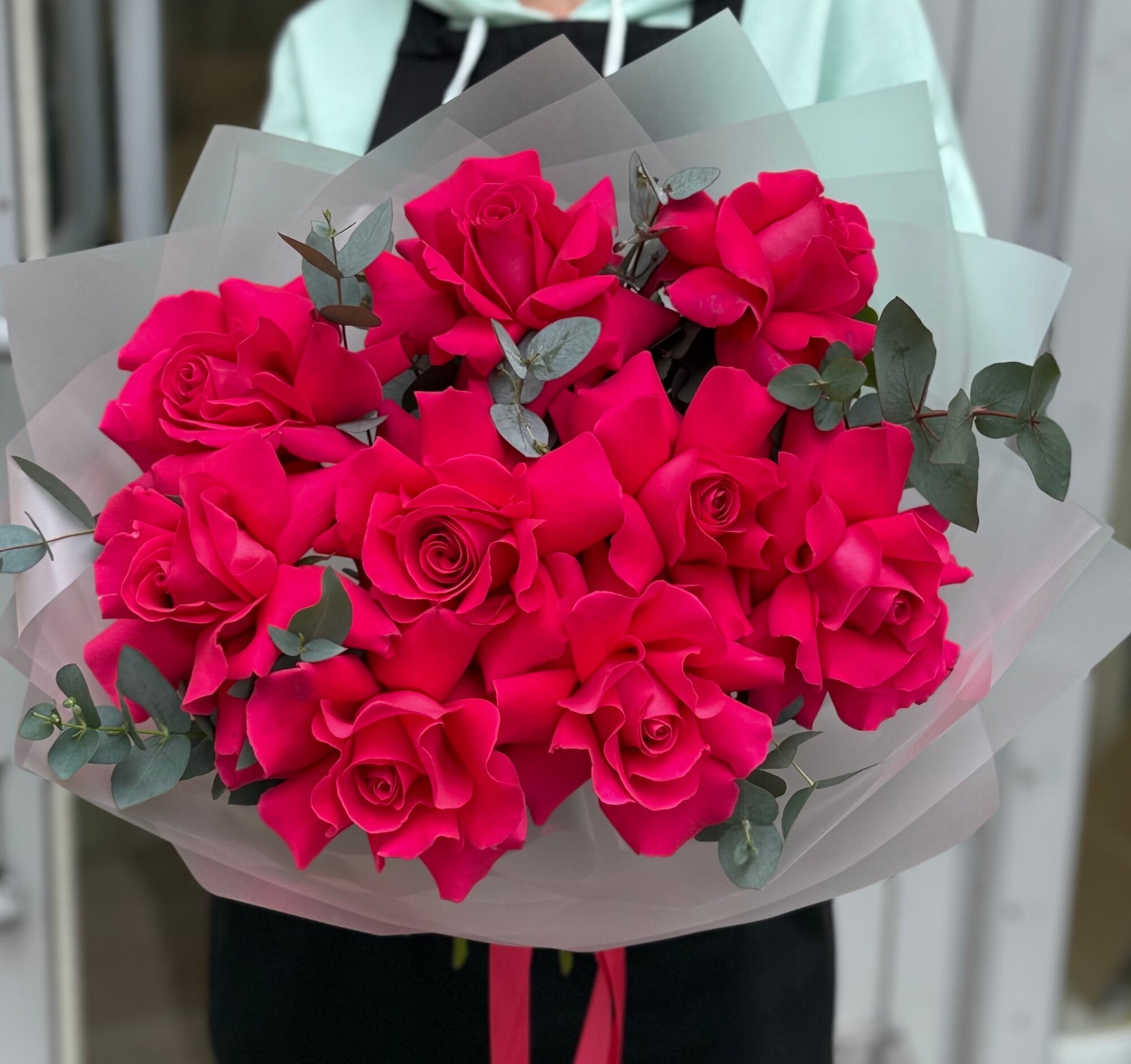 Букет ароматных малиновых французских роз с веточками эвкалипта в упаковке с атласными лентами, букет 45см, 7 шт