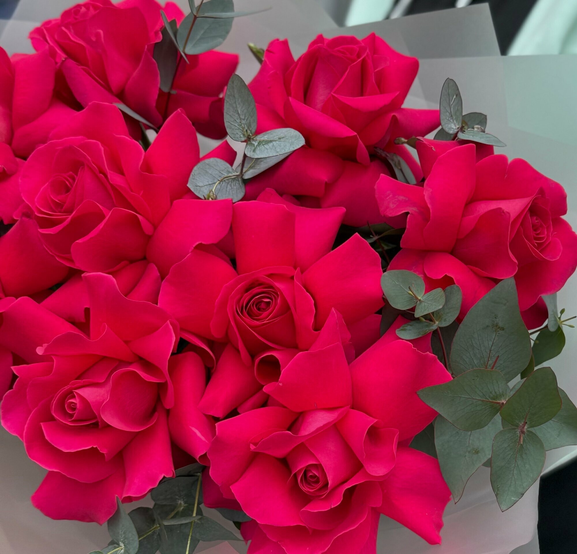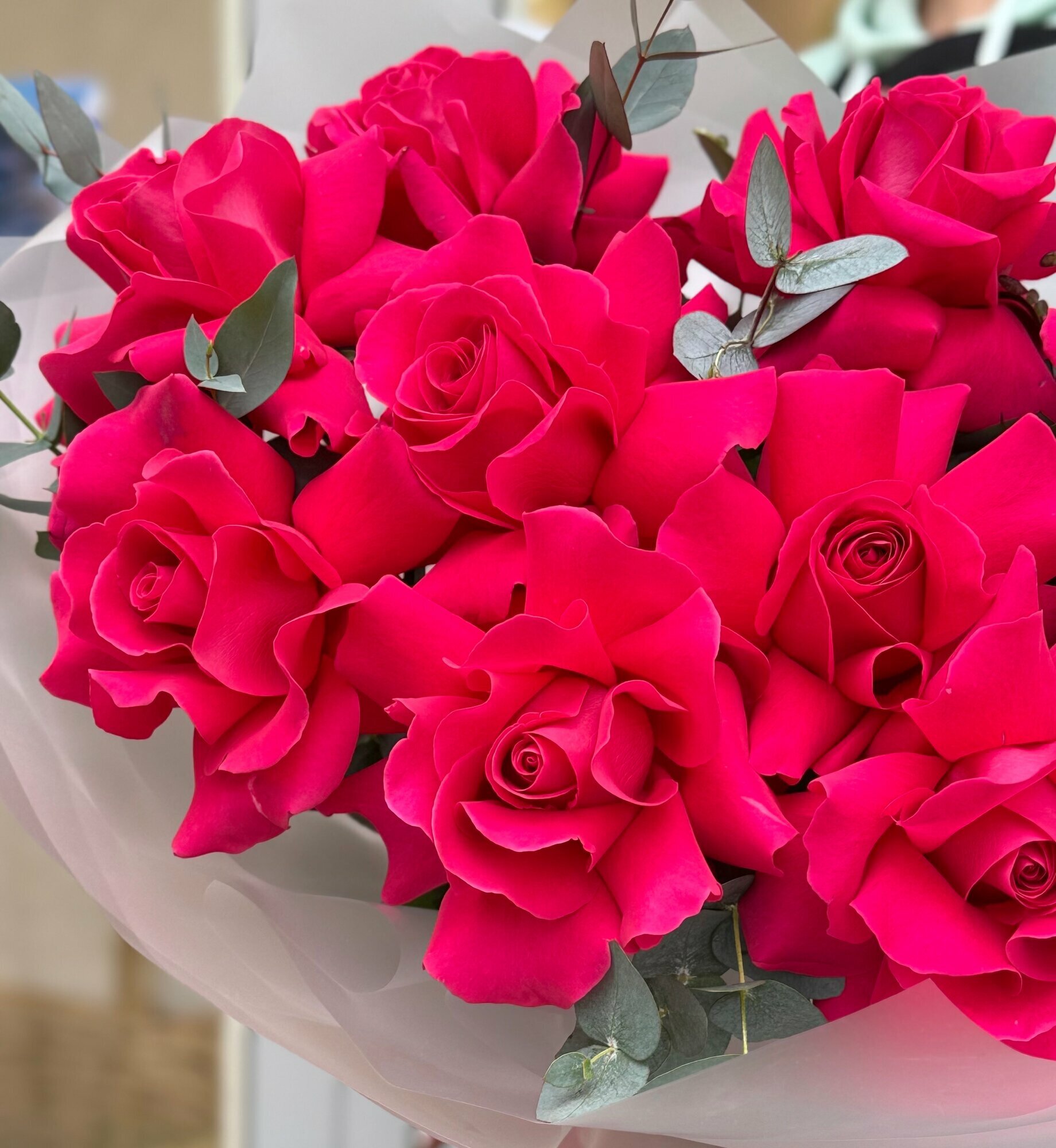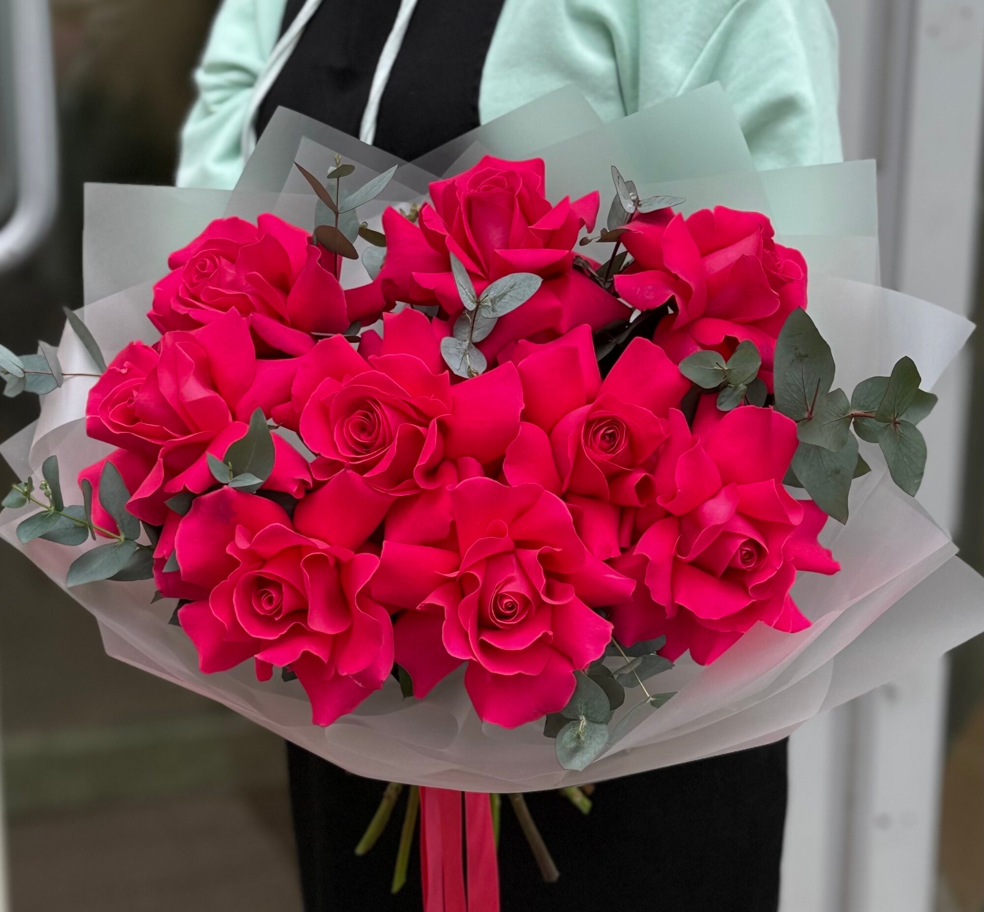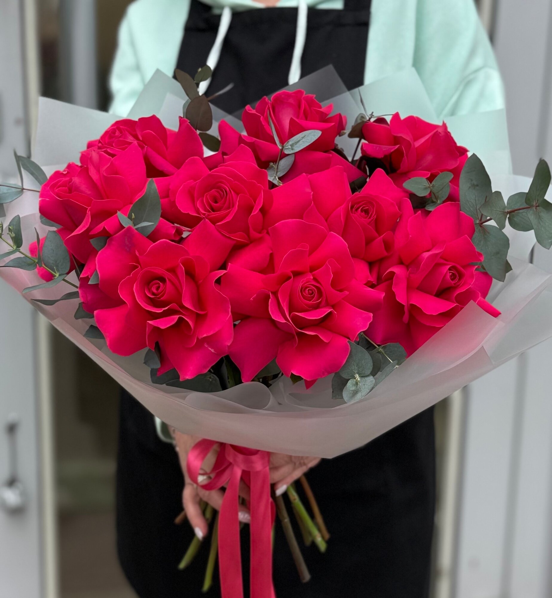 Букет ароматных малиновых французских роз с веточками эвкалипта в упаковке с атласными лентами, букет 45см, 7 шт