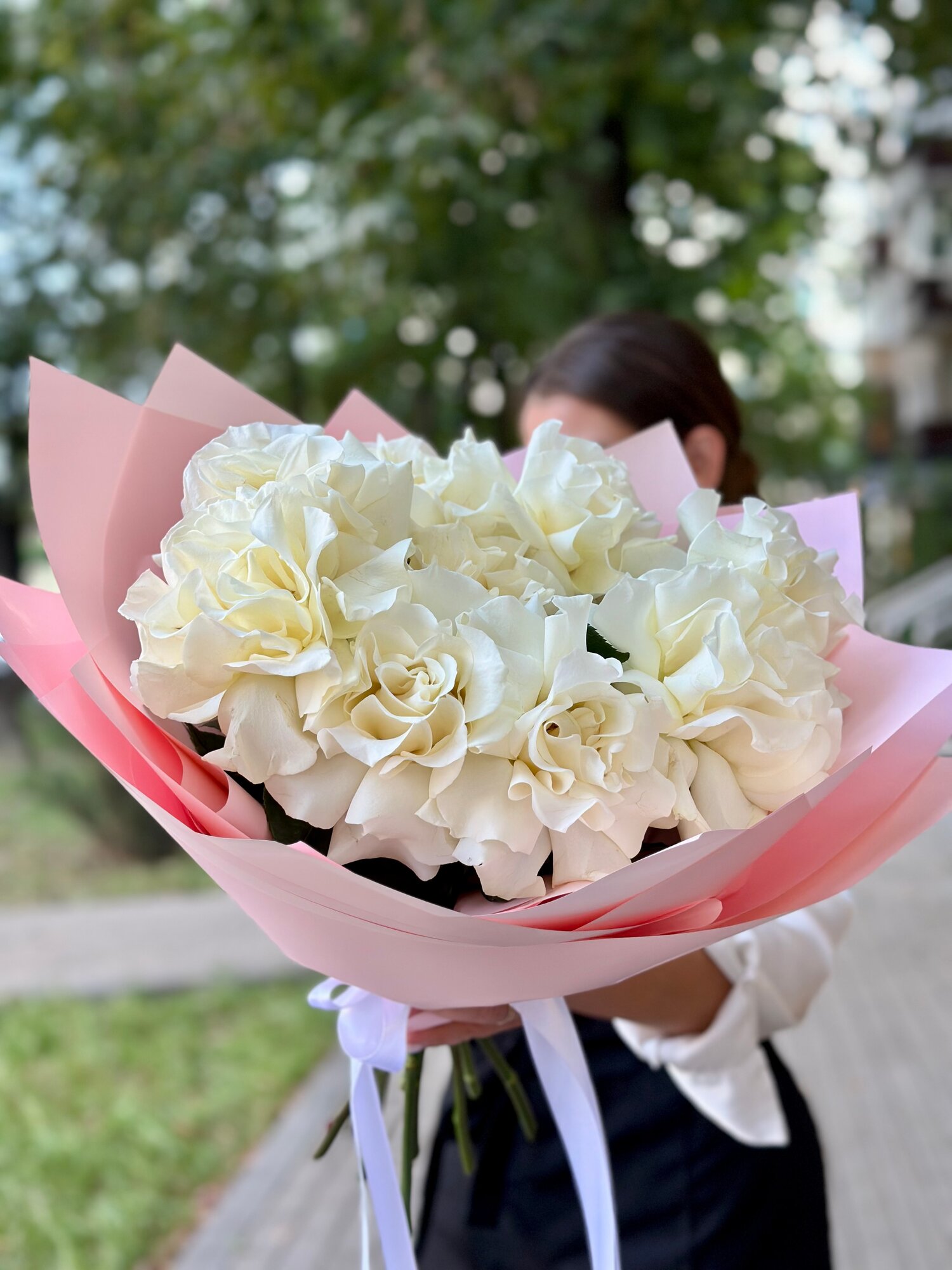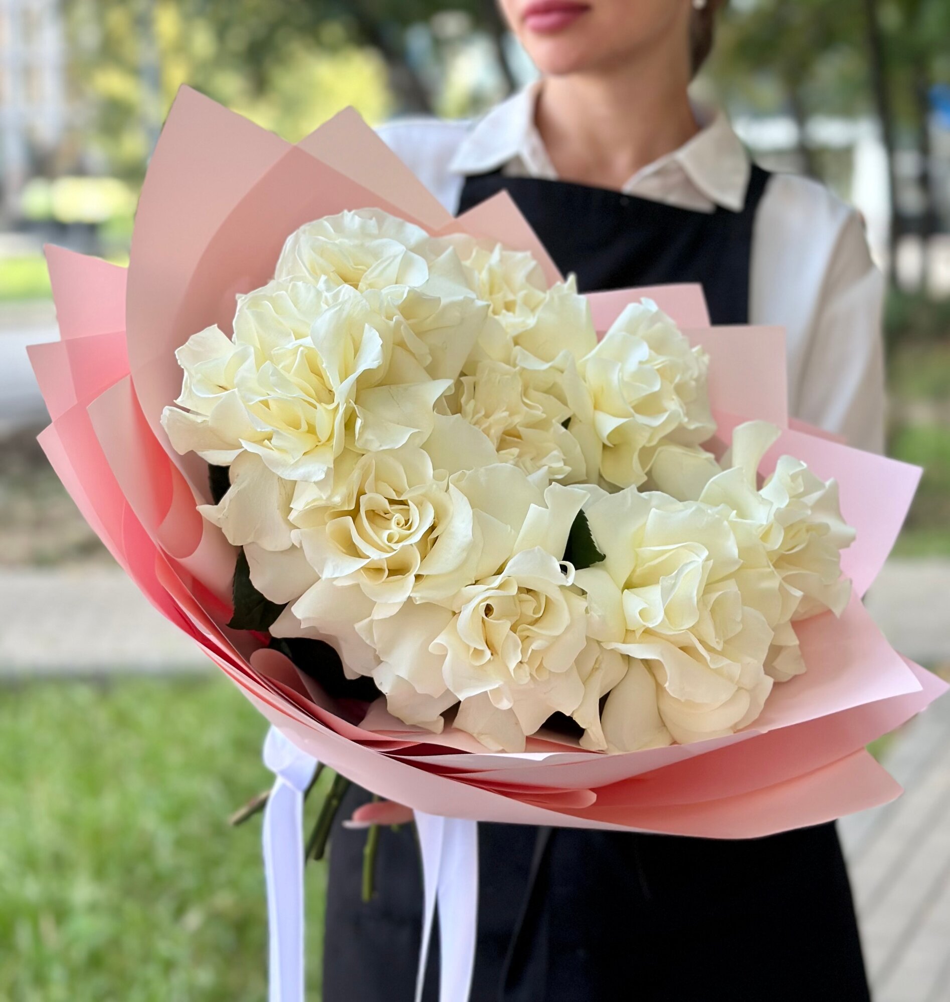 Купить Монобукет из белых французских роз в нежном оформлении с атласными лентами, букет с доставкой 50 см, 9 роз