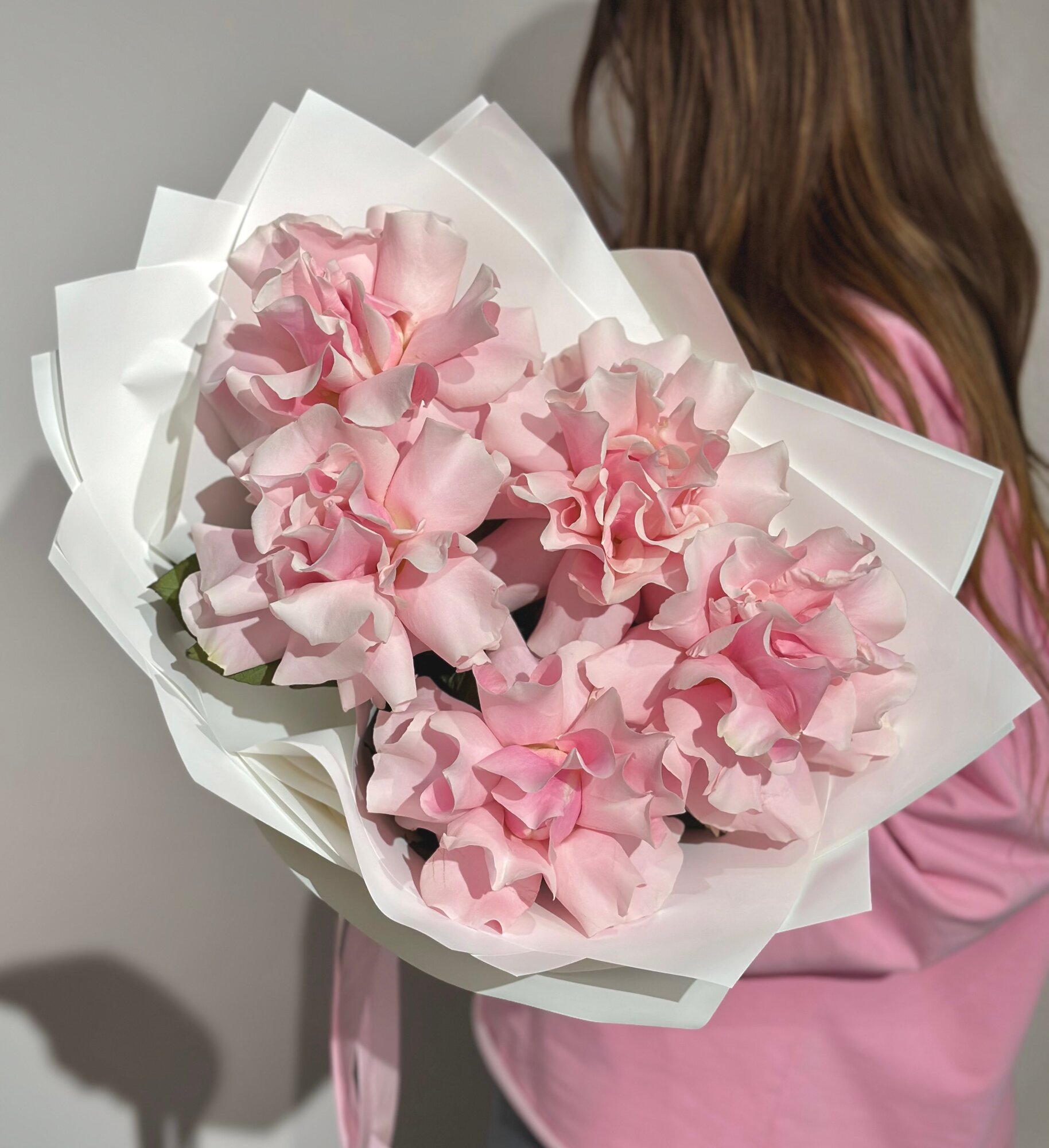 Сборный букет из розовых французских роз и эустомы c открыткой в нежной упаковке, высота 50см, живые цветы с доставкой