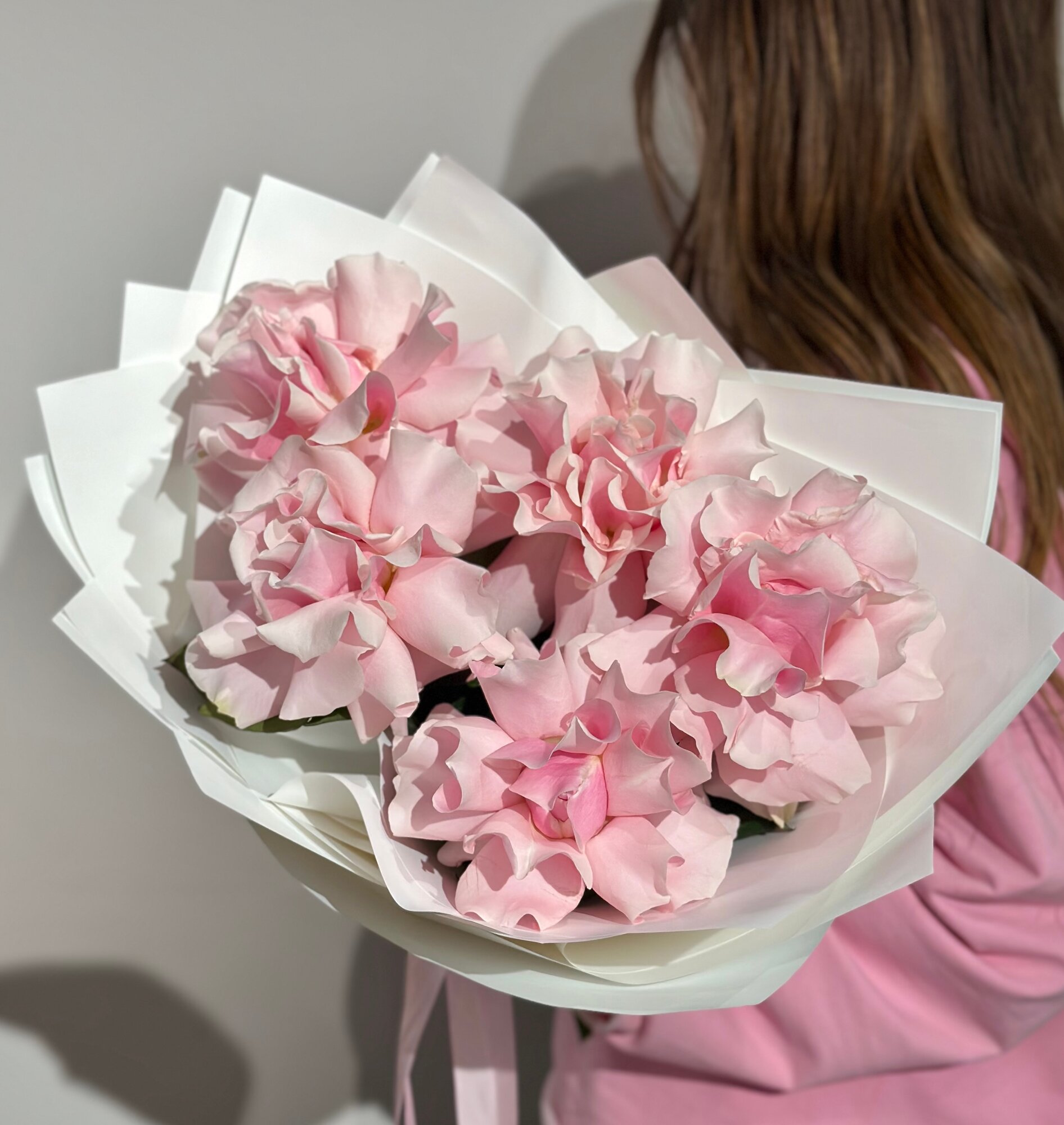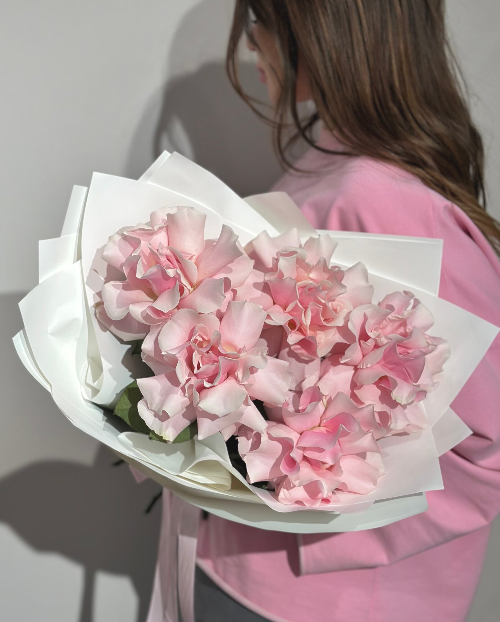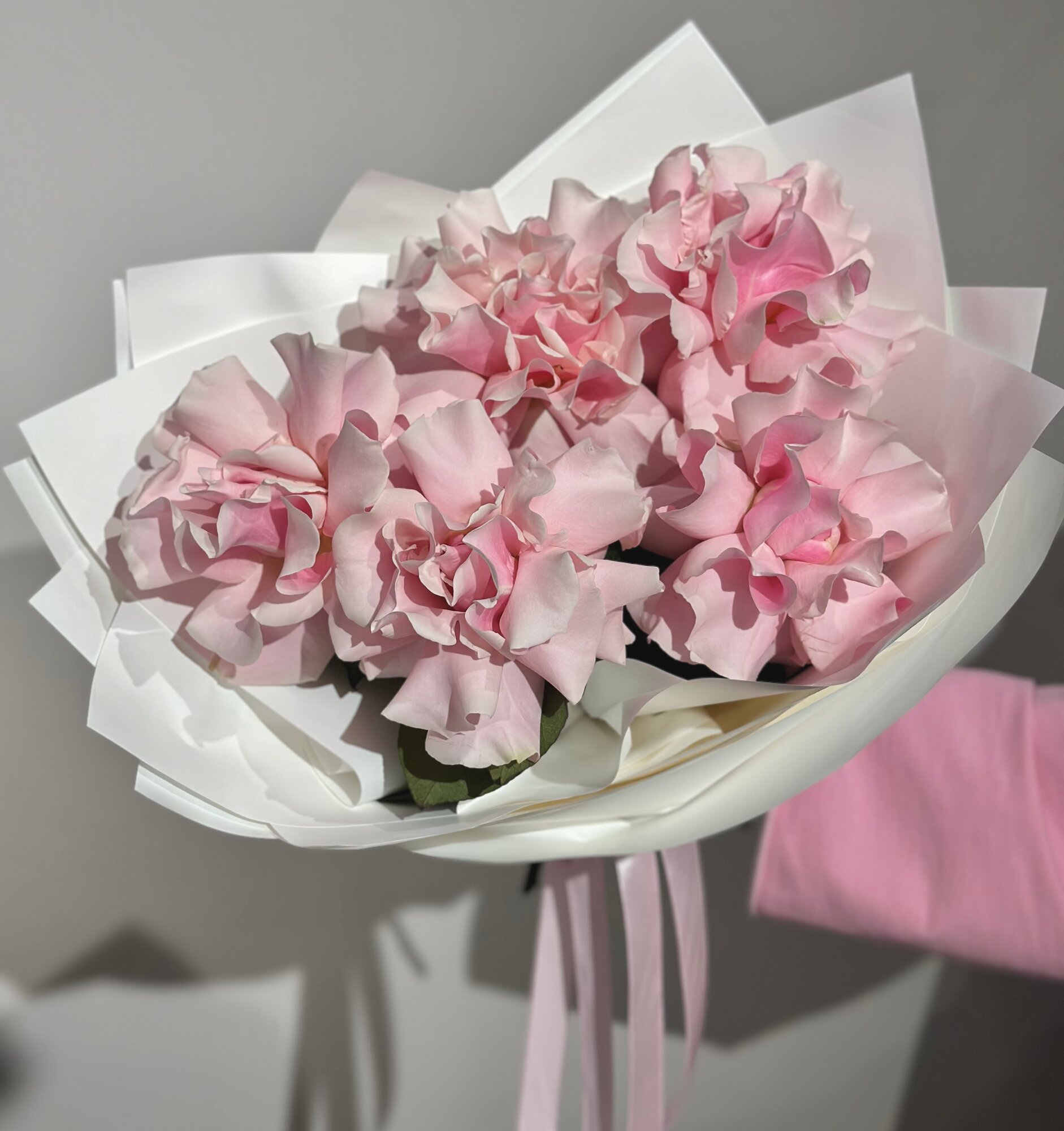 Букет из 11-ти розовых французских роз в стильной упаковке и атласными лентами с доставкой. Монобукет высота 60см