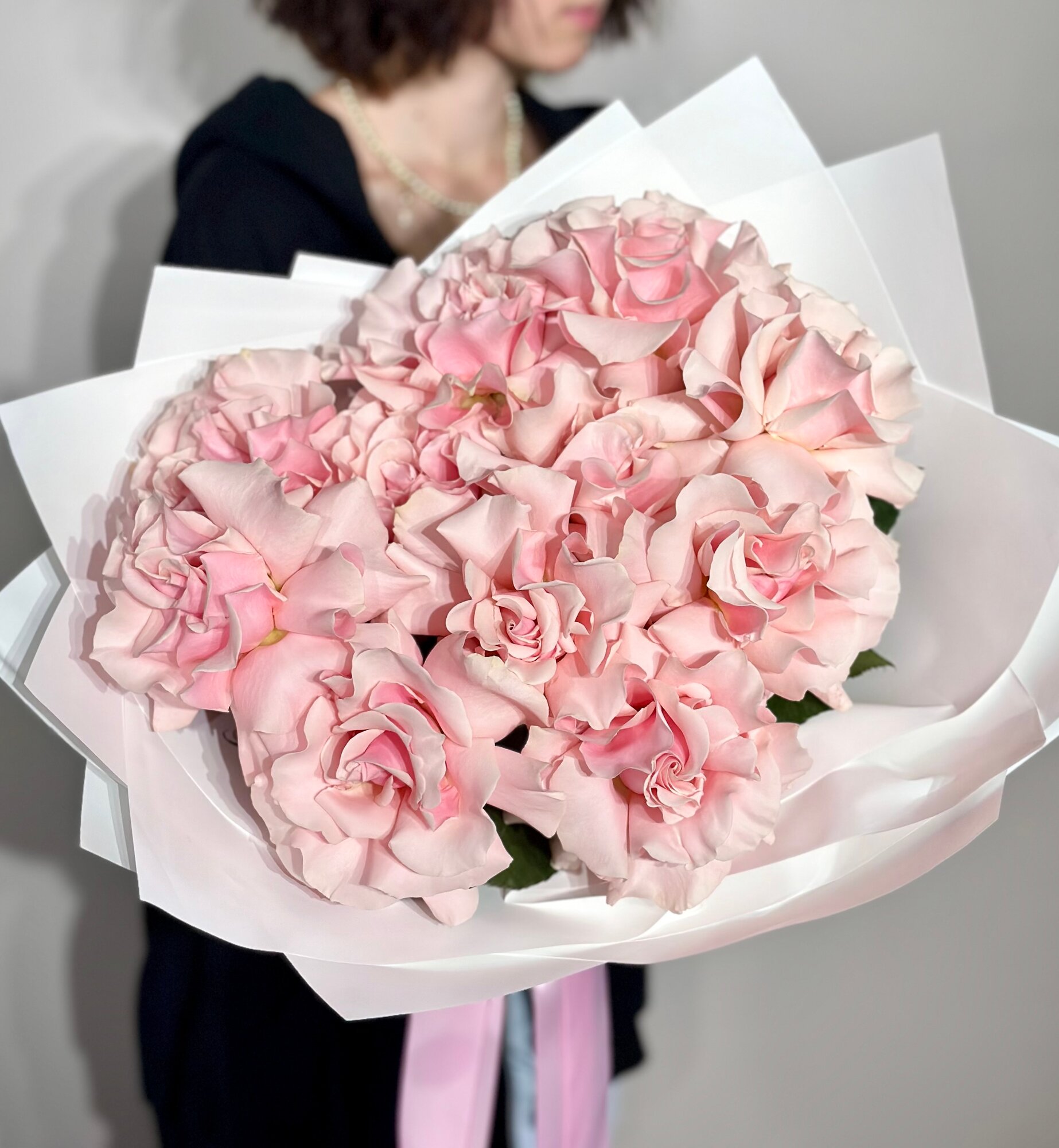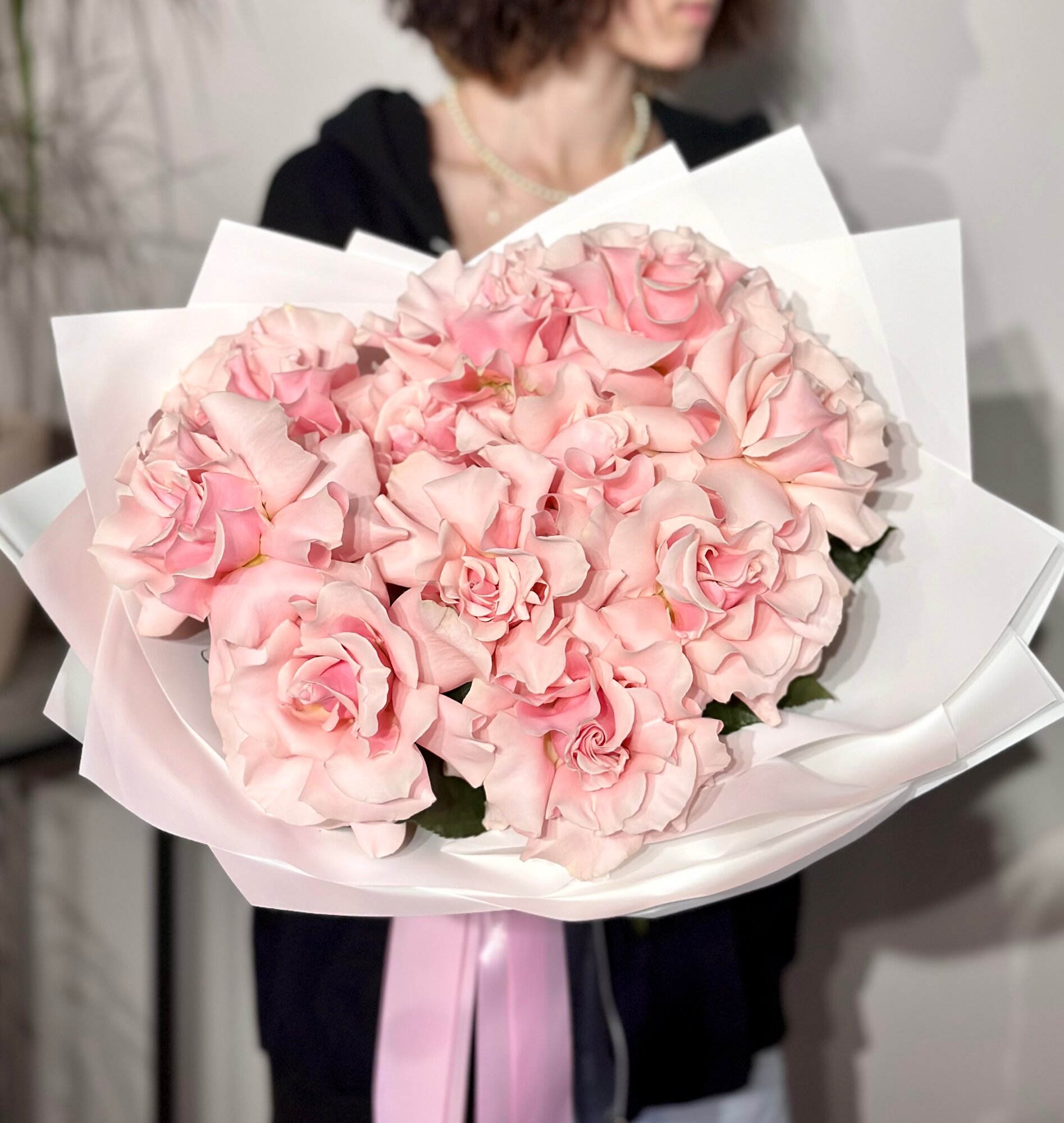 СохранитьБукет из 11-ти розовых французских роз в стильной упаковке и атласными лентами с доставкой. Монобукет высота 60см интересное: