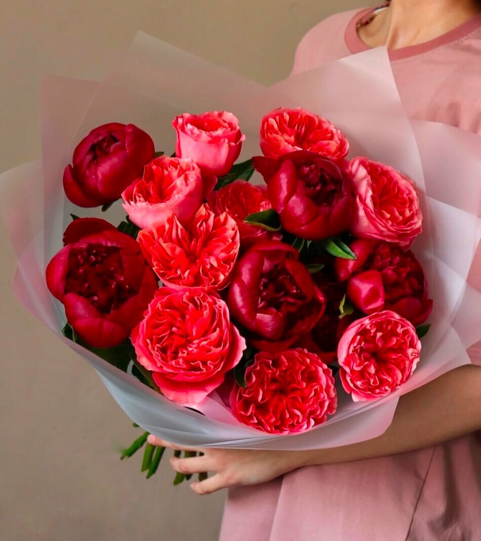 Букет «Романтичный комплимент» (пионы Ред Шарм, пионовидные розы Пинк Экспрешн) интересное: