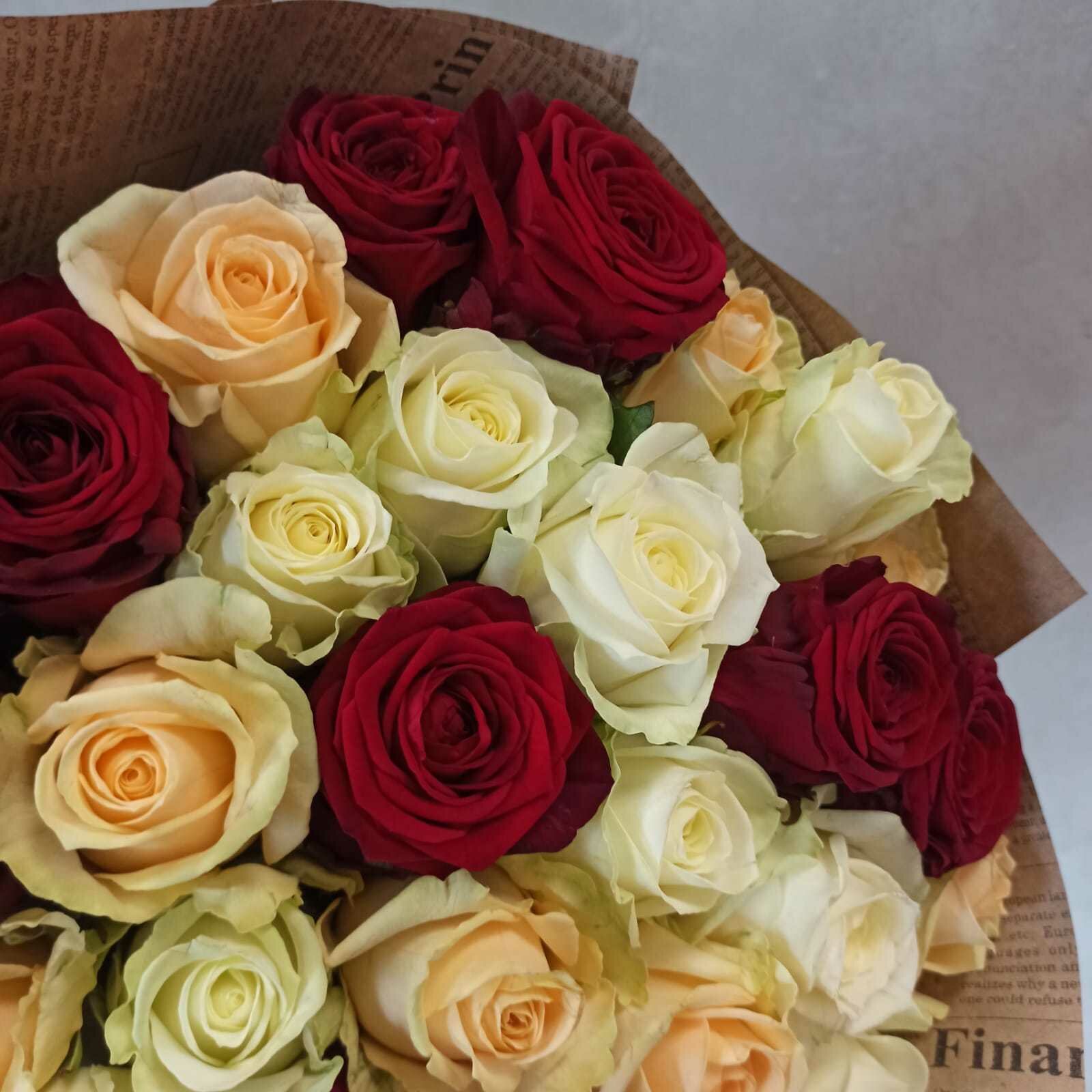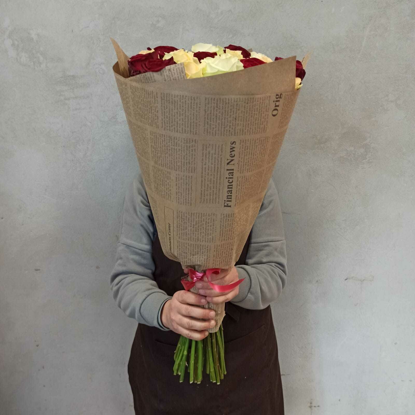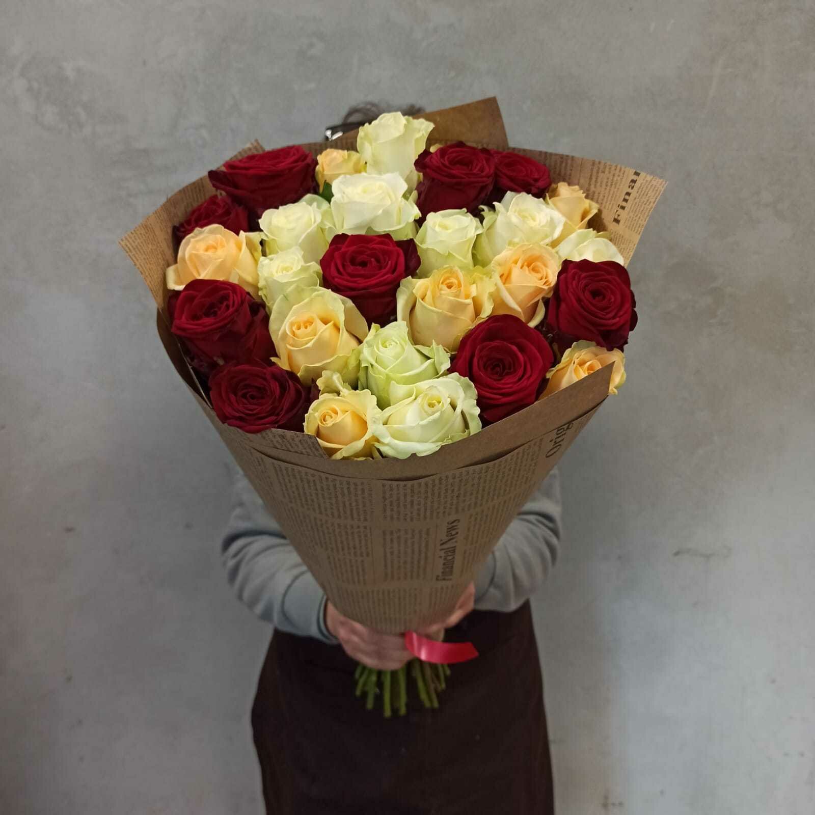 Живые цветы букет роз микс в крафте 27 шт. 60 см. "Вечность", сорта Аваланж, Пич Аваланж и Ред Наоми интересное: