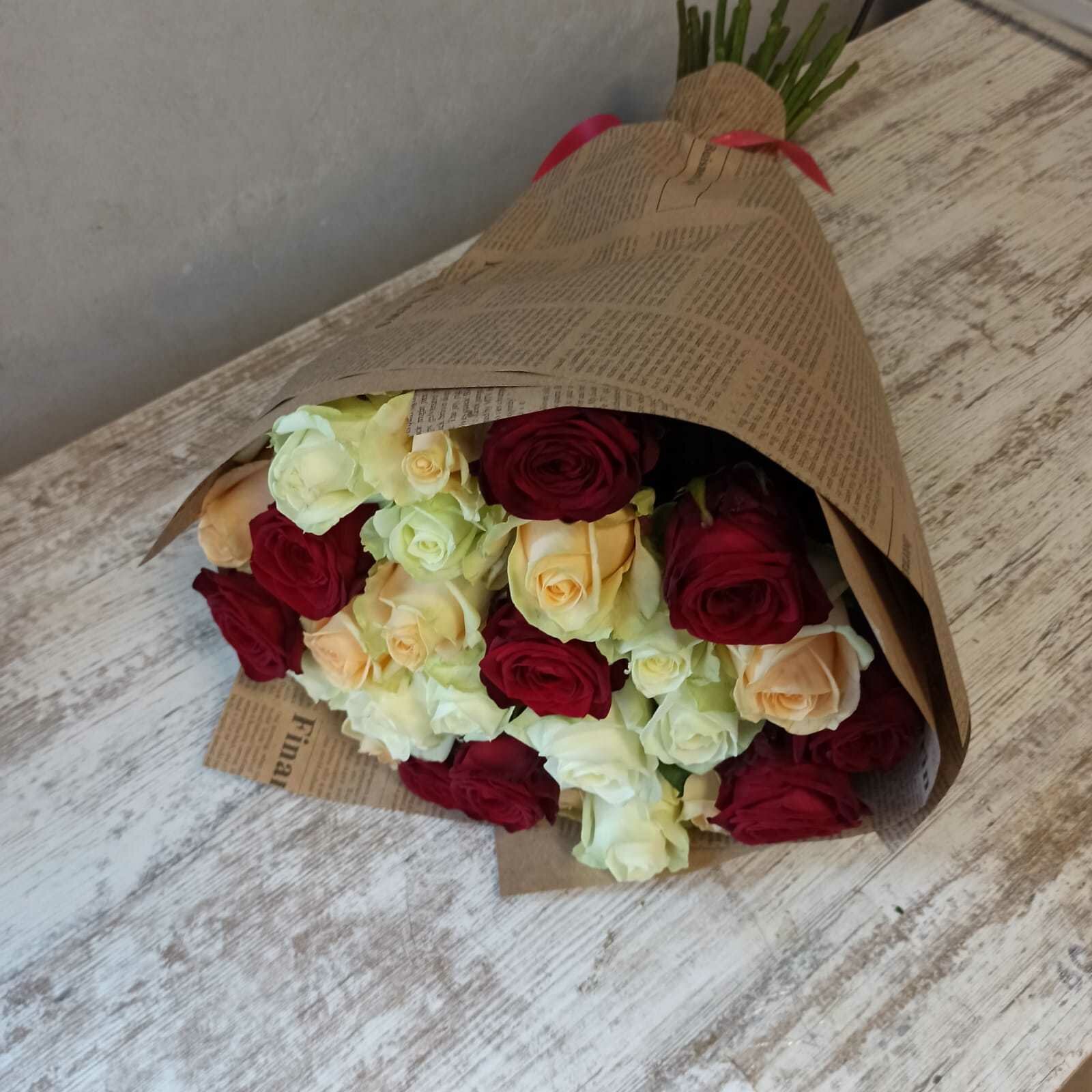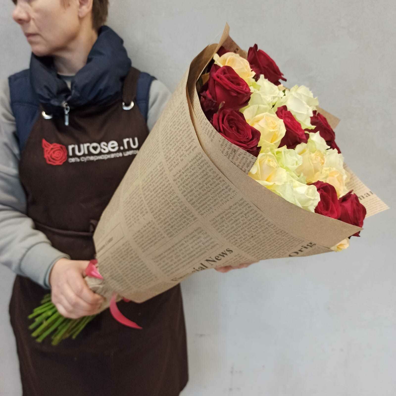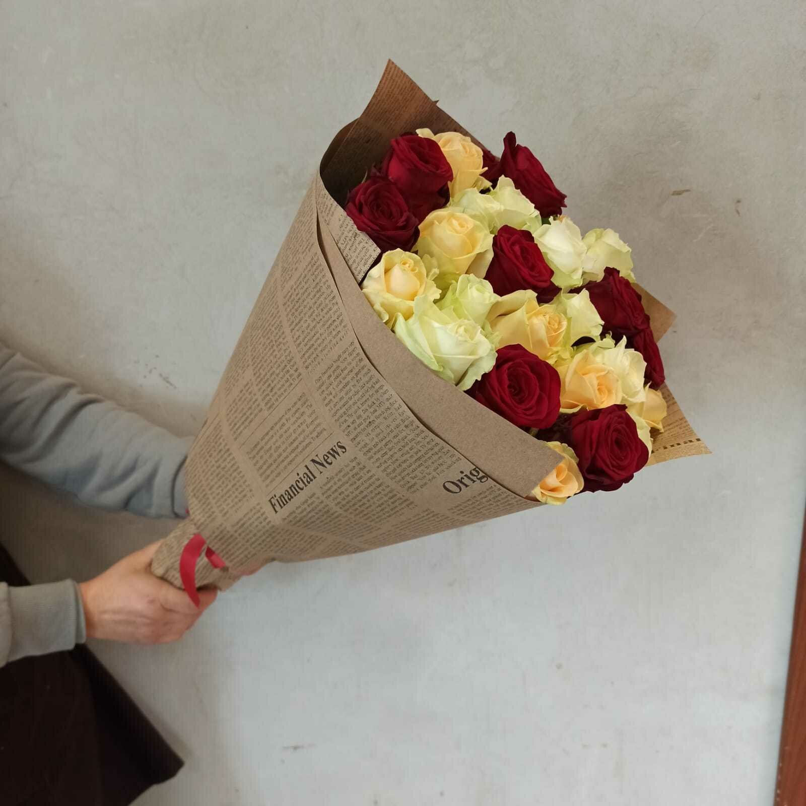Живые цветы букет роз микс в крафте 27 шт. 60 см. "Вечность", сорта Аваланж, Пич Аваланж и Ред Наоми интересное: