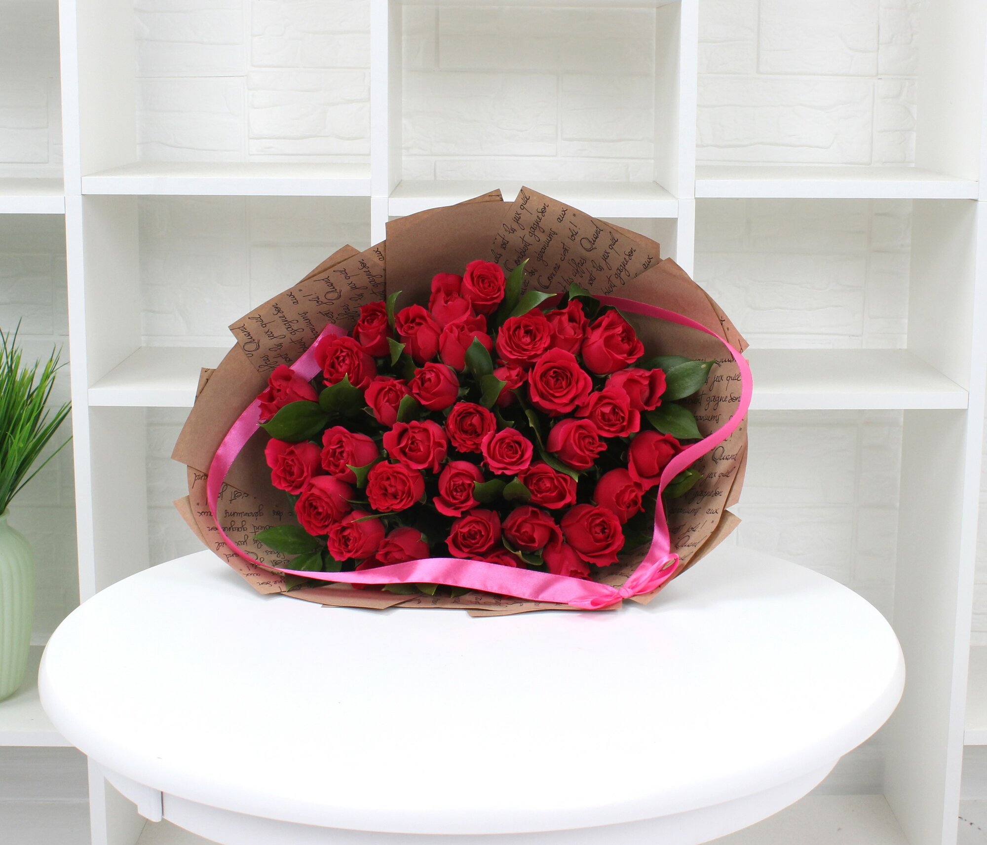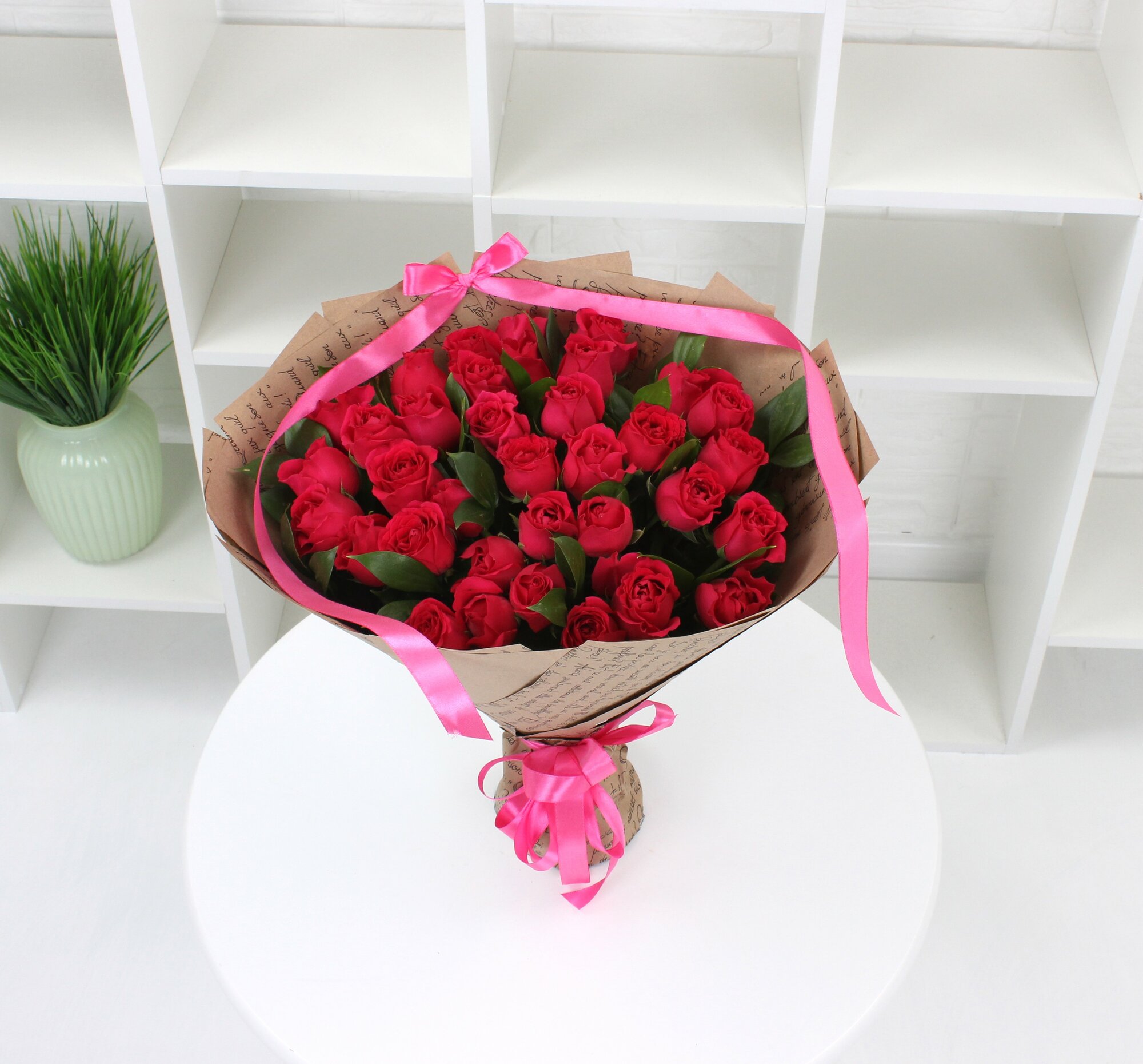 35 малиновых роз 40см с зеленью интересное: