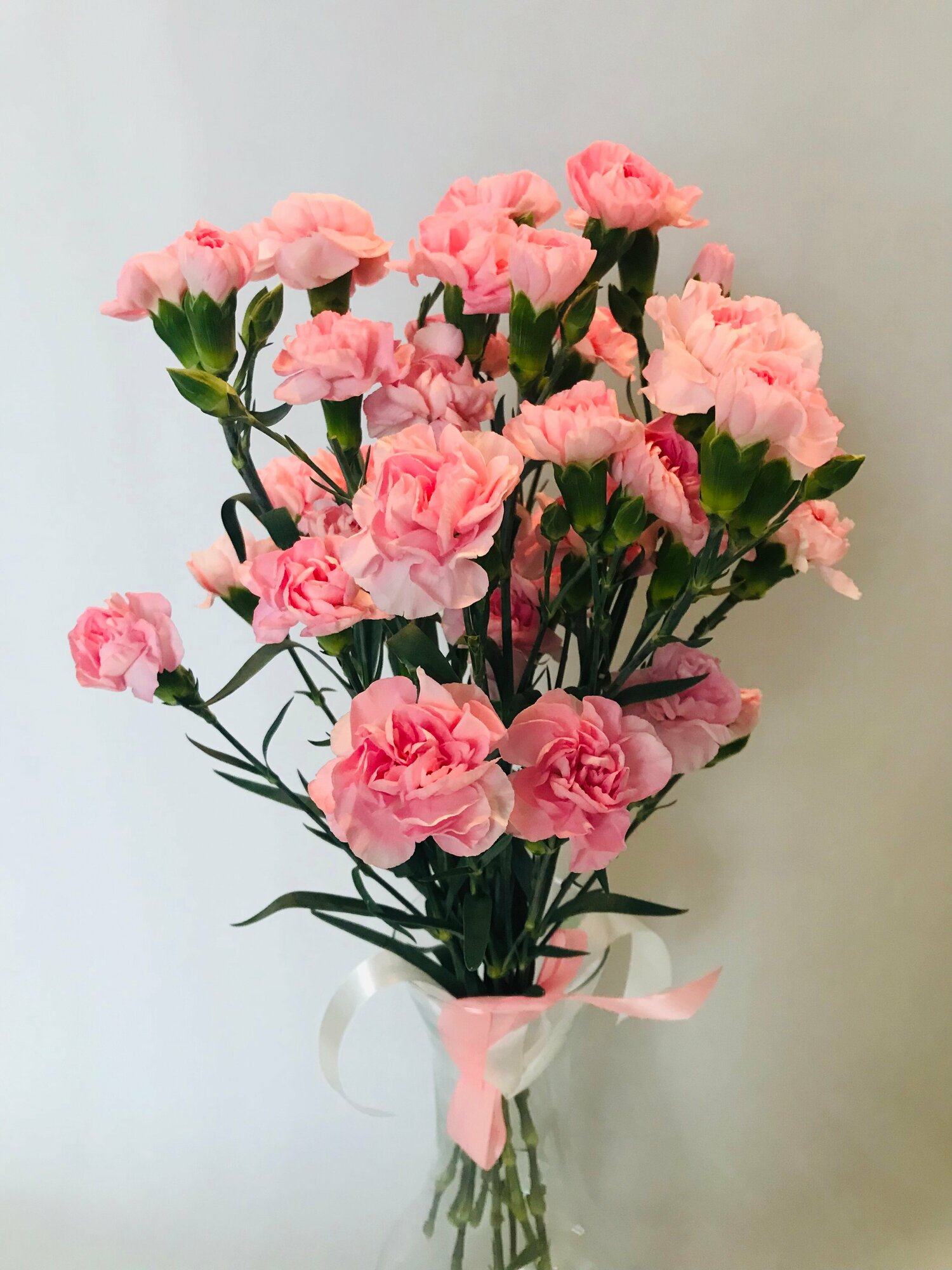 Купить Букет из 9 свежих, ароматных, розовых кустовых гвоздик, 55 см, под атласный бант
