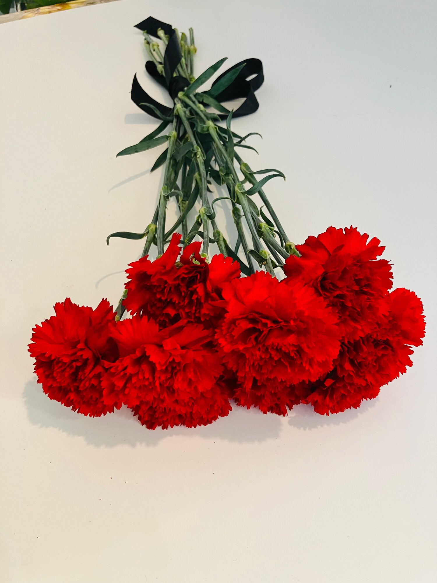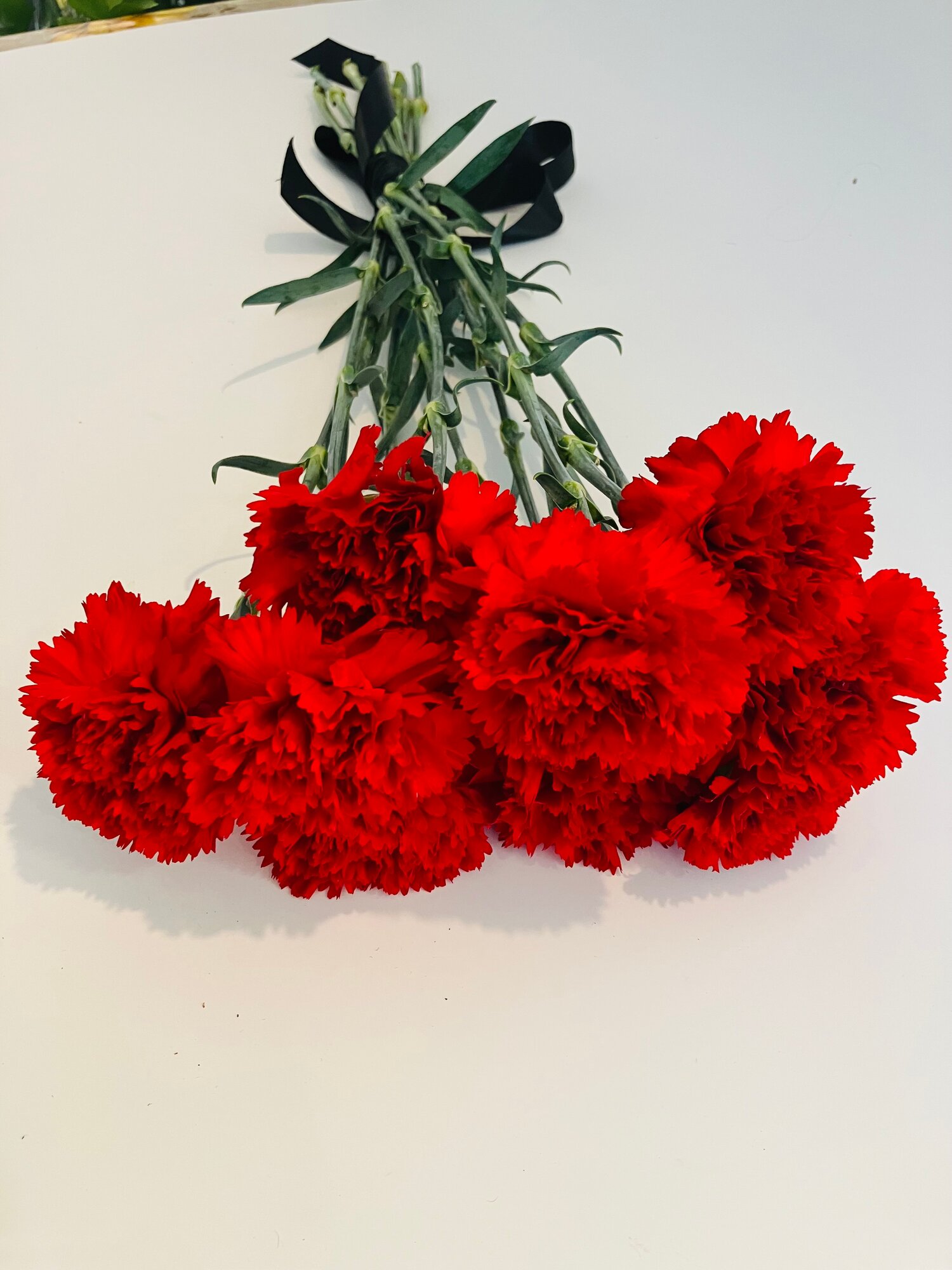 Букет гвоздик, красная гвоздика, 10 шт, свежая, 55 см+, под чёрный , атласный бант. интересное: