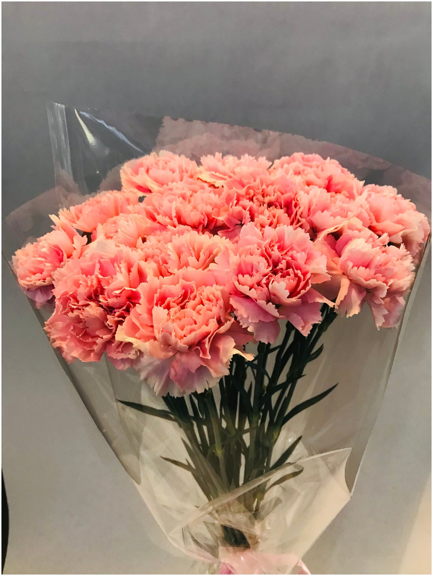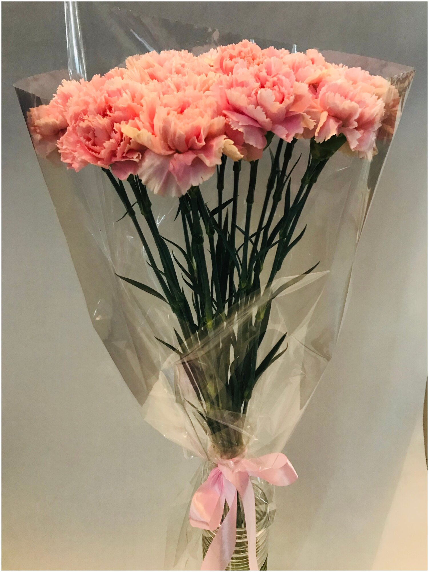 Букет из 11 свежих, розовых гвоздик , 55 см+, в прозрачном целофане, атласный бант. интересное: