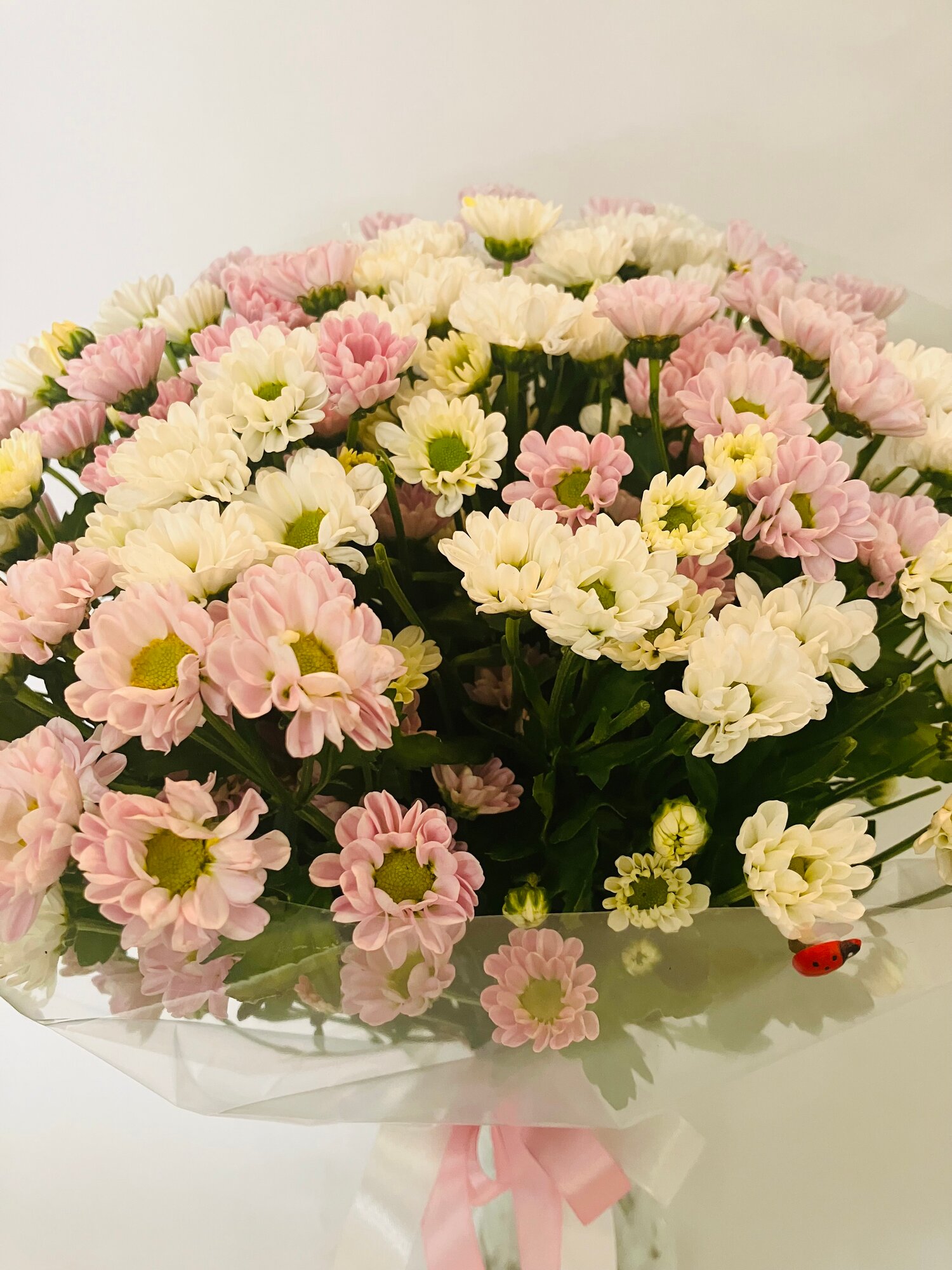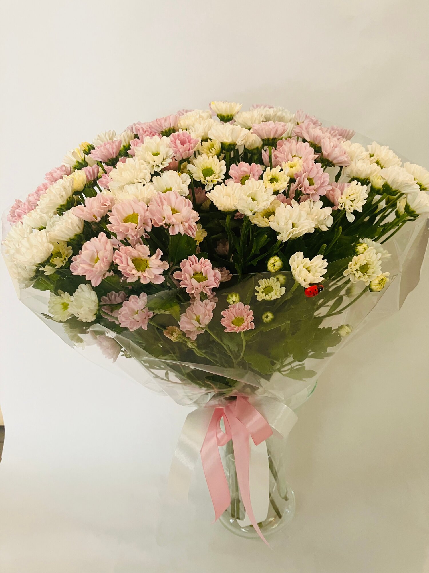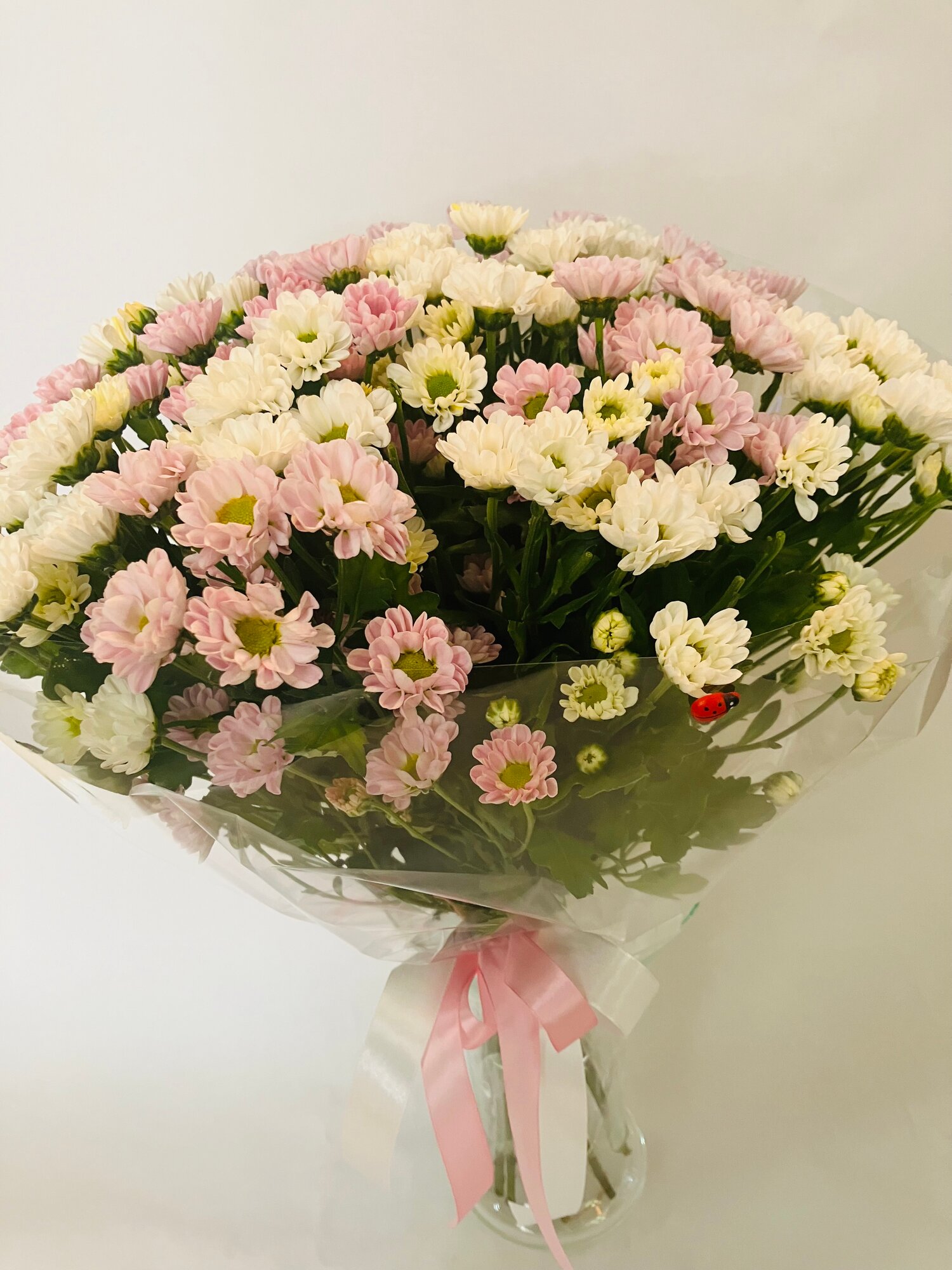 Букет из 15 белых и розовых хризантем сантини Росси в упаковке прозрачный целлофан, атласный бант. интересное: