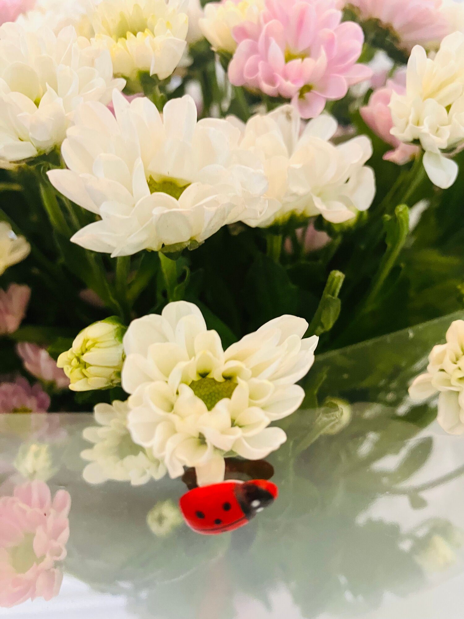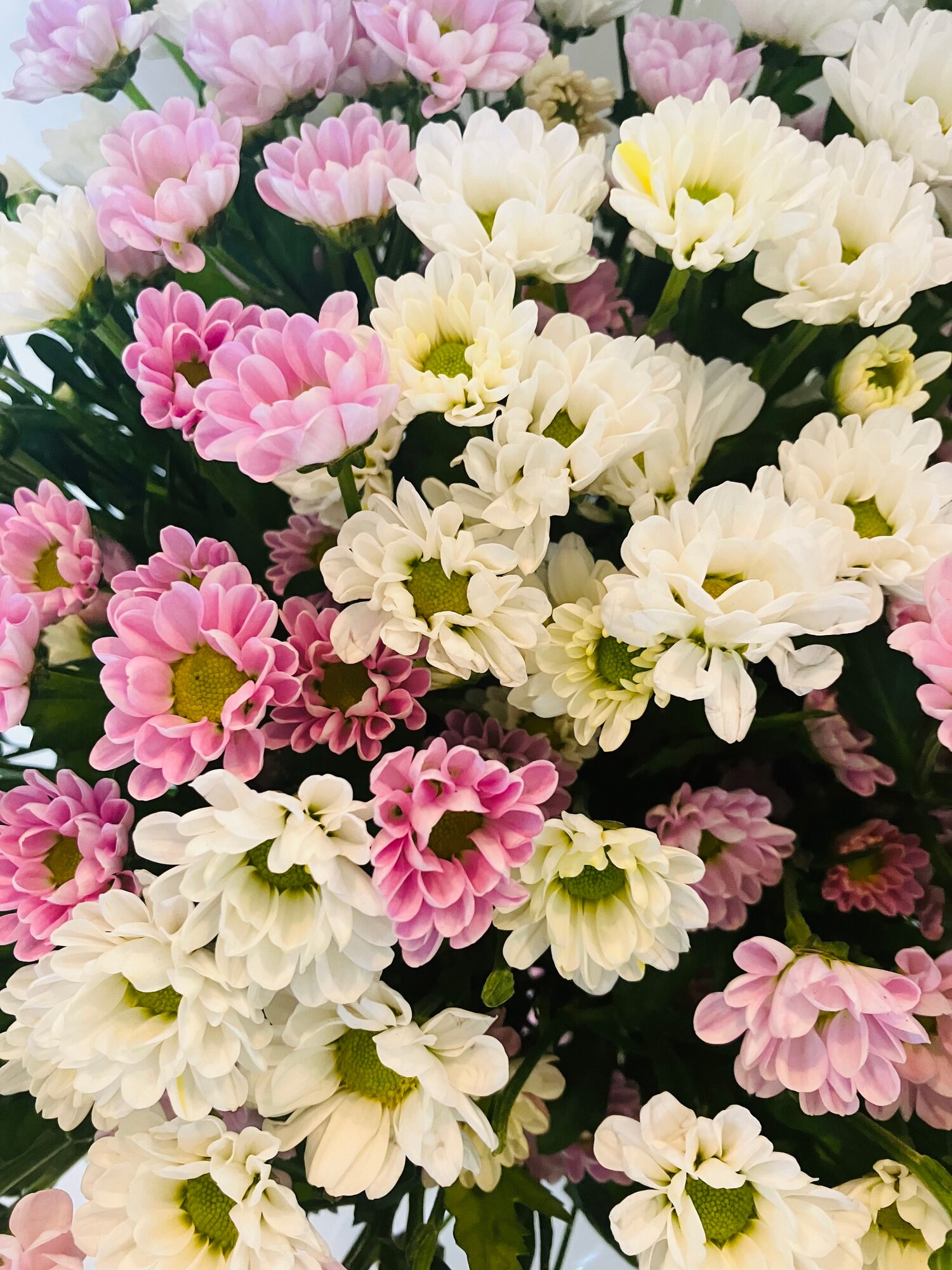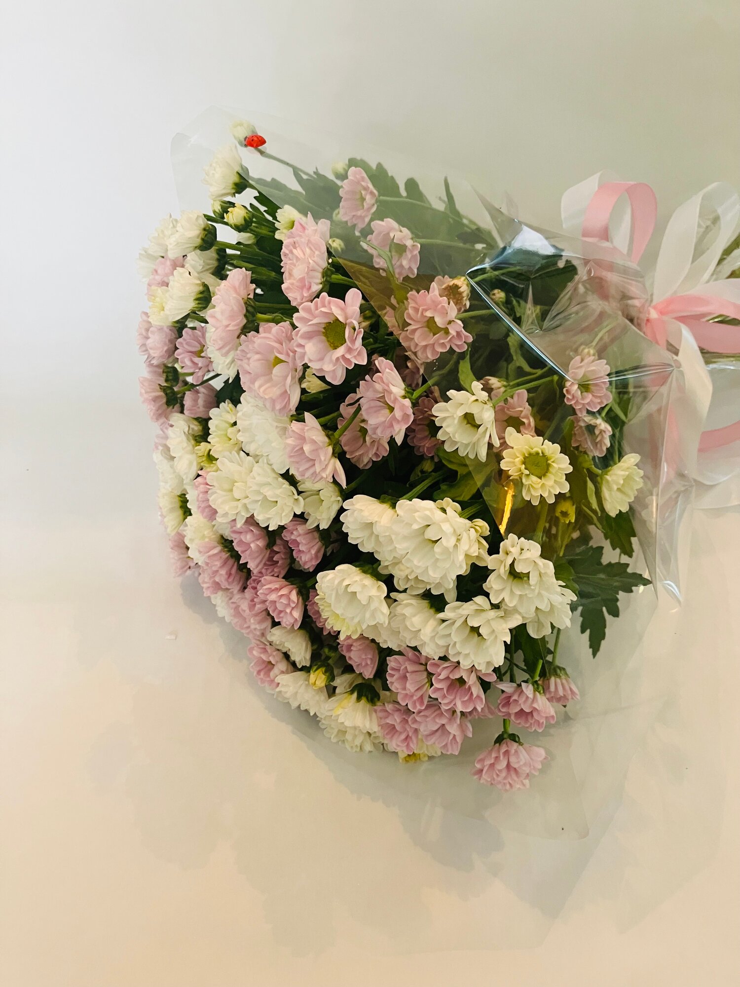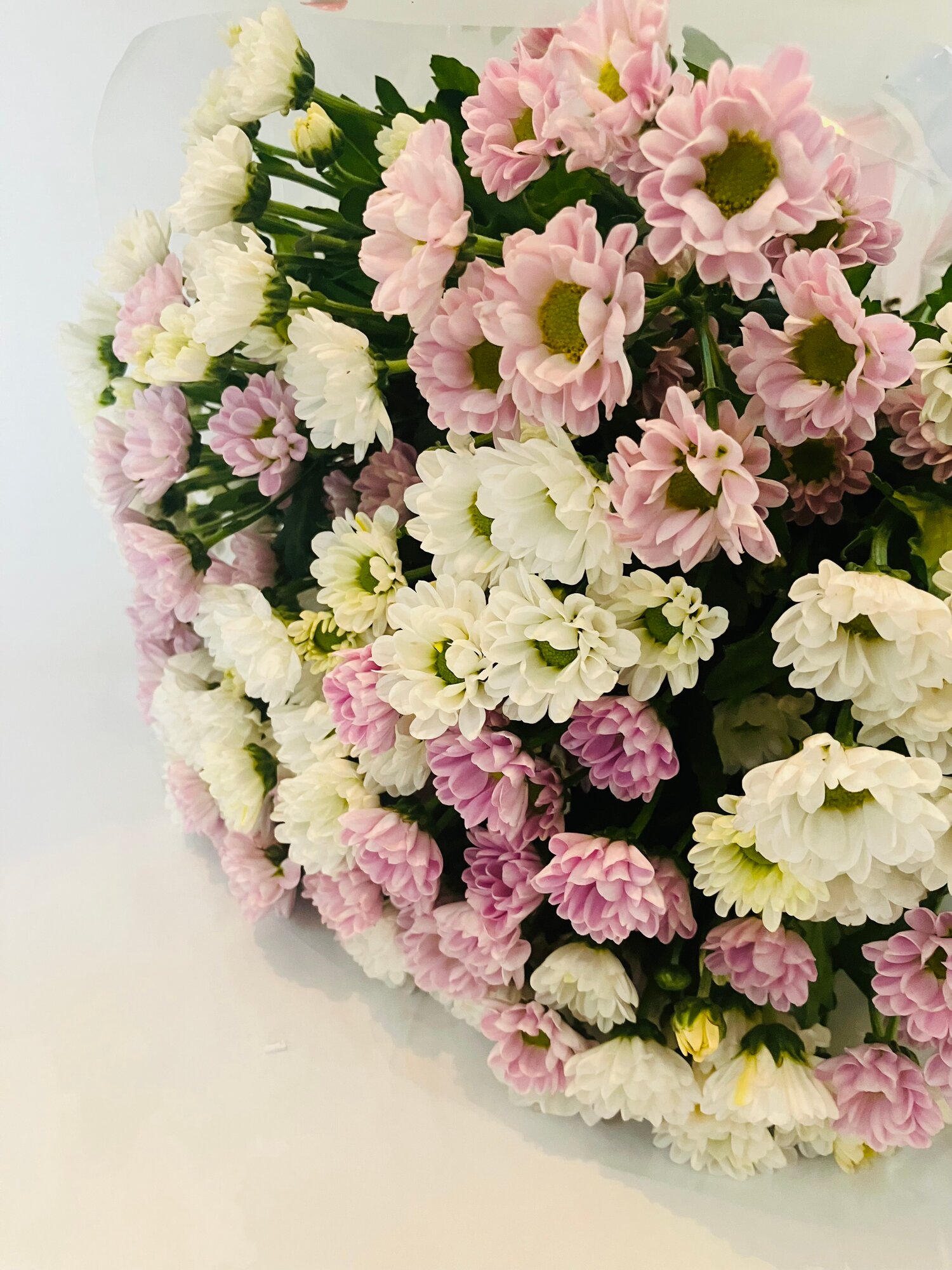 Букет из 15 белых и розовых хризантем сантини Росси в упаковке прозрачный целлофан, атласный бант. интересное: