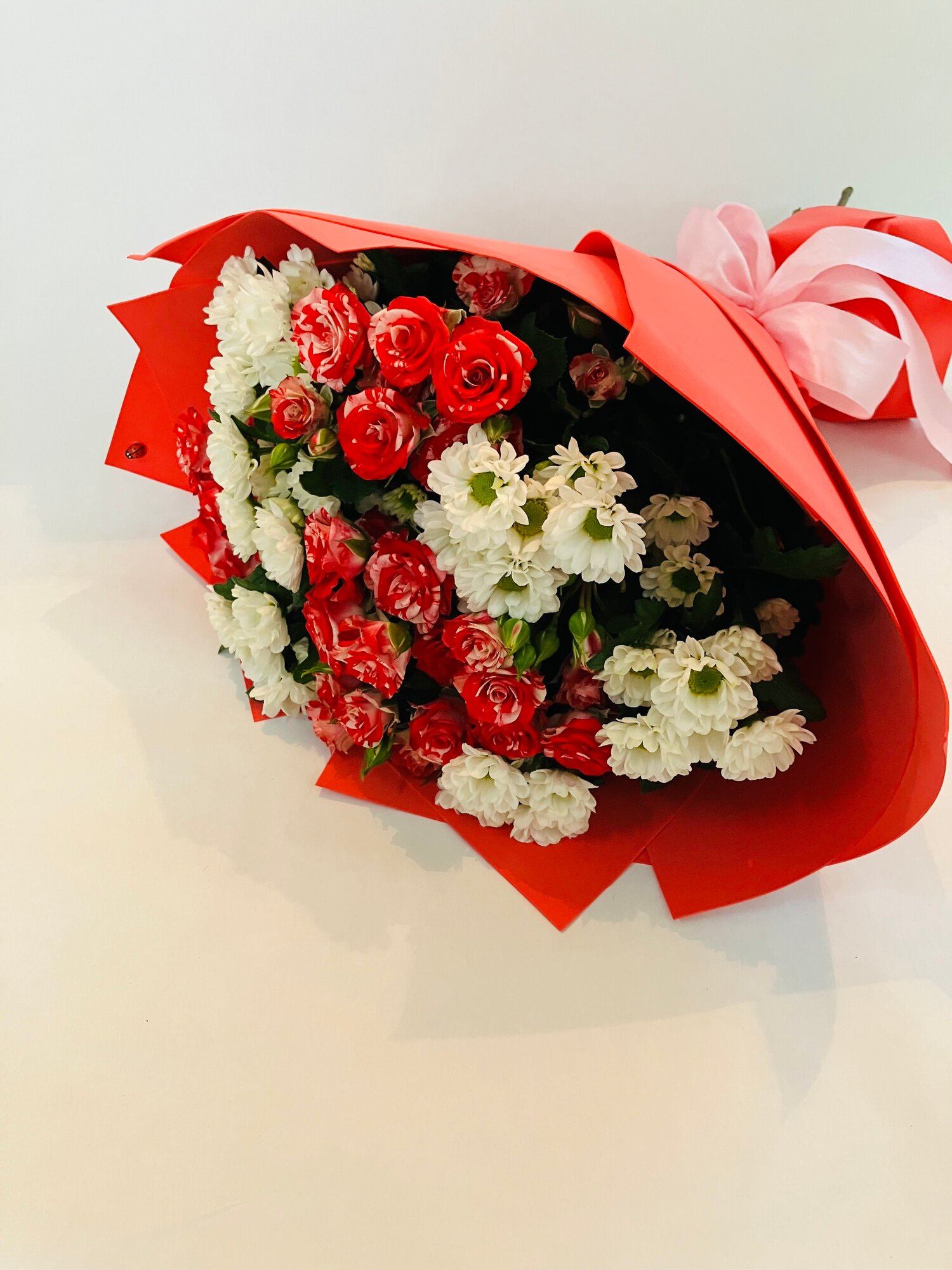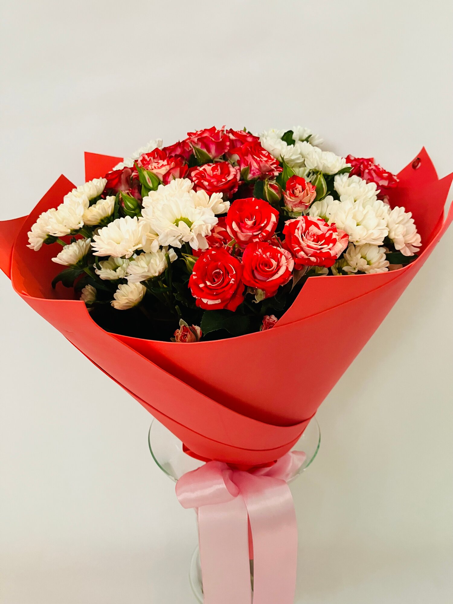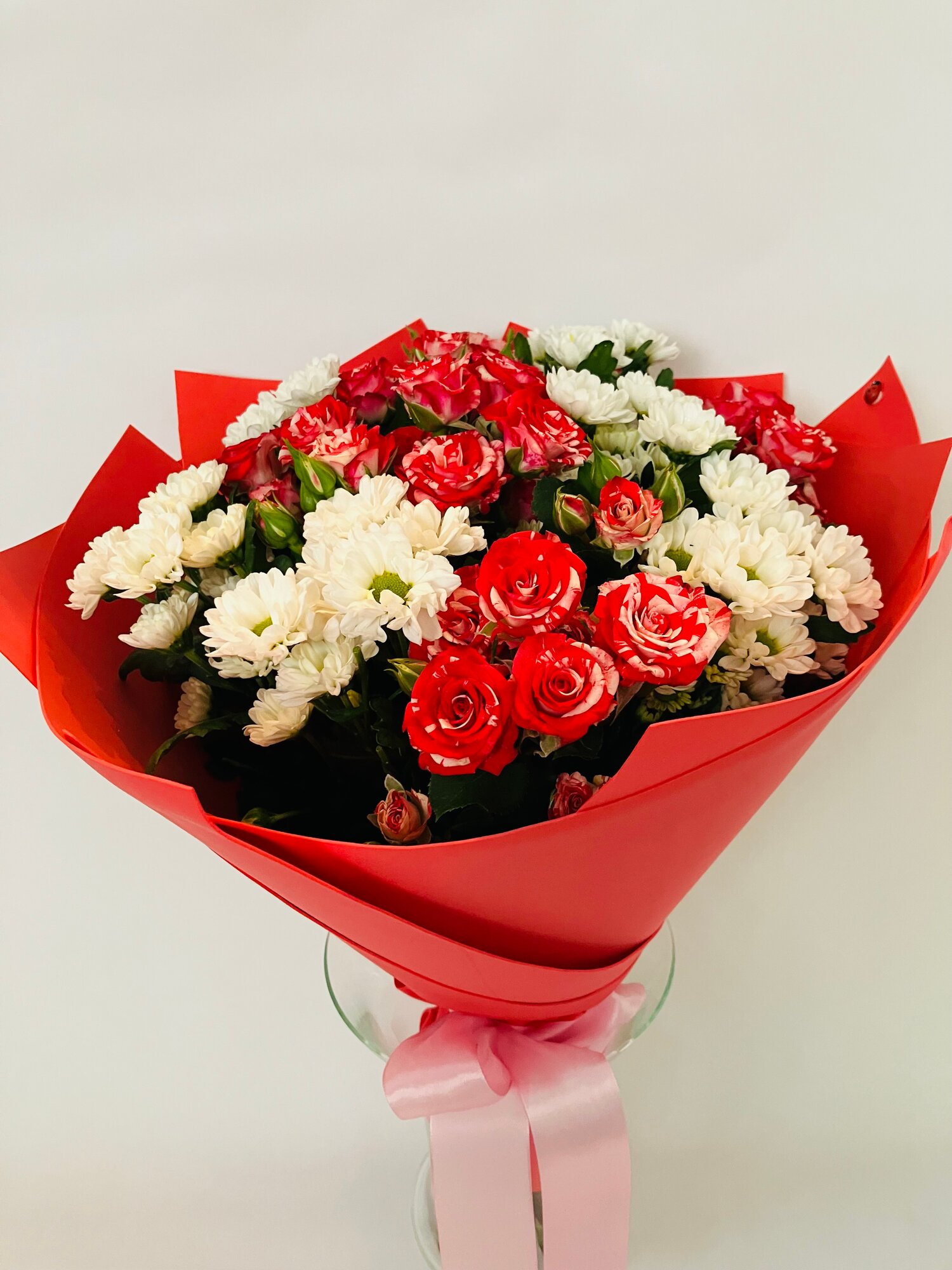 Купить Букет из кустовых роз Фейерверк и белой хризантемы сантини в красной, дизайнерской упаковке, атласный бант.