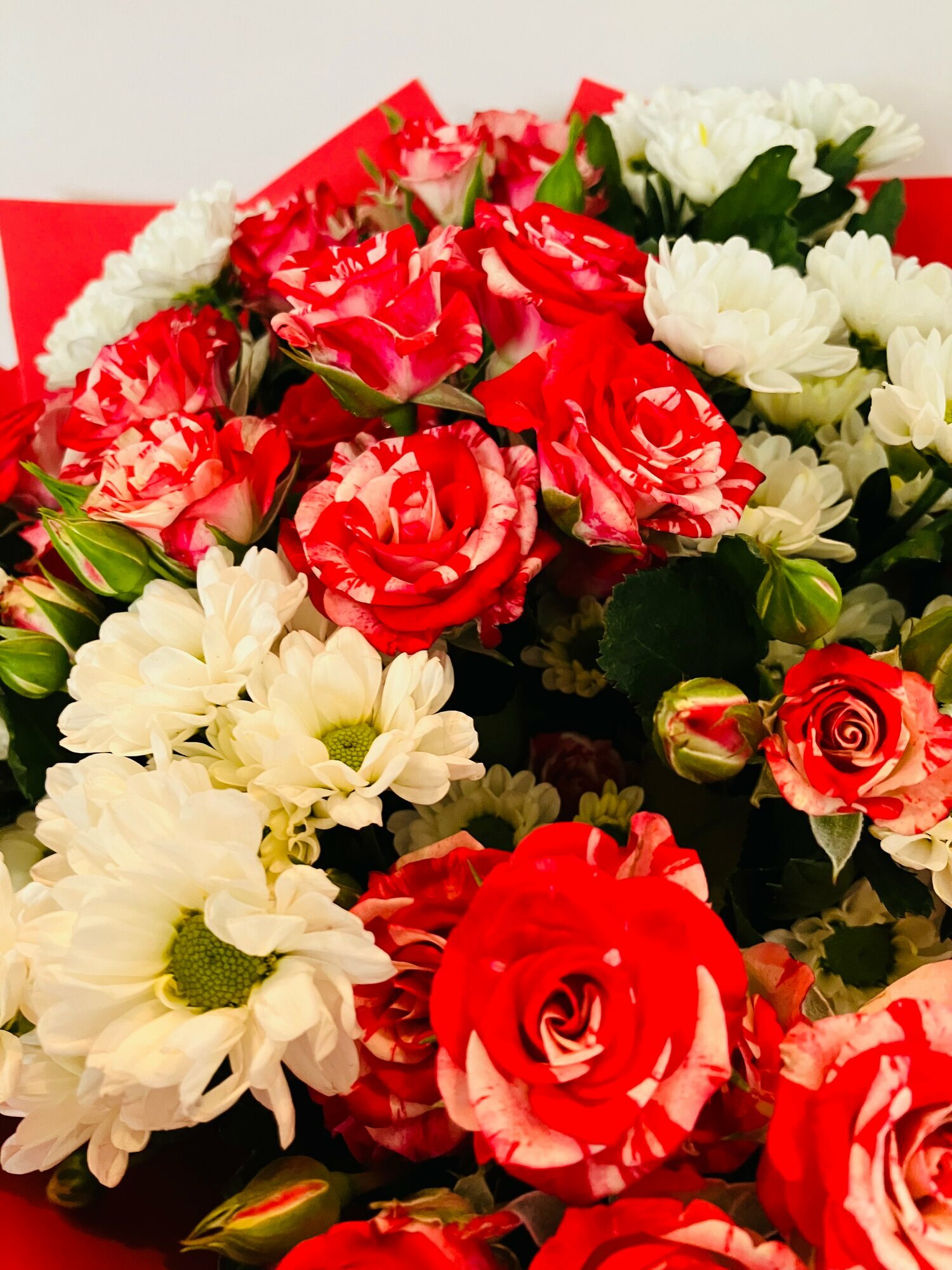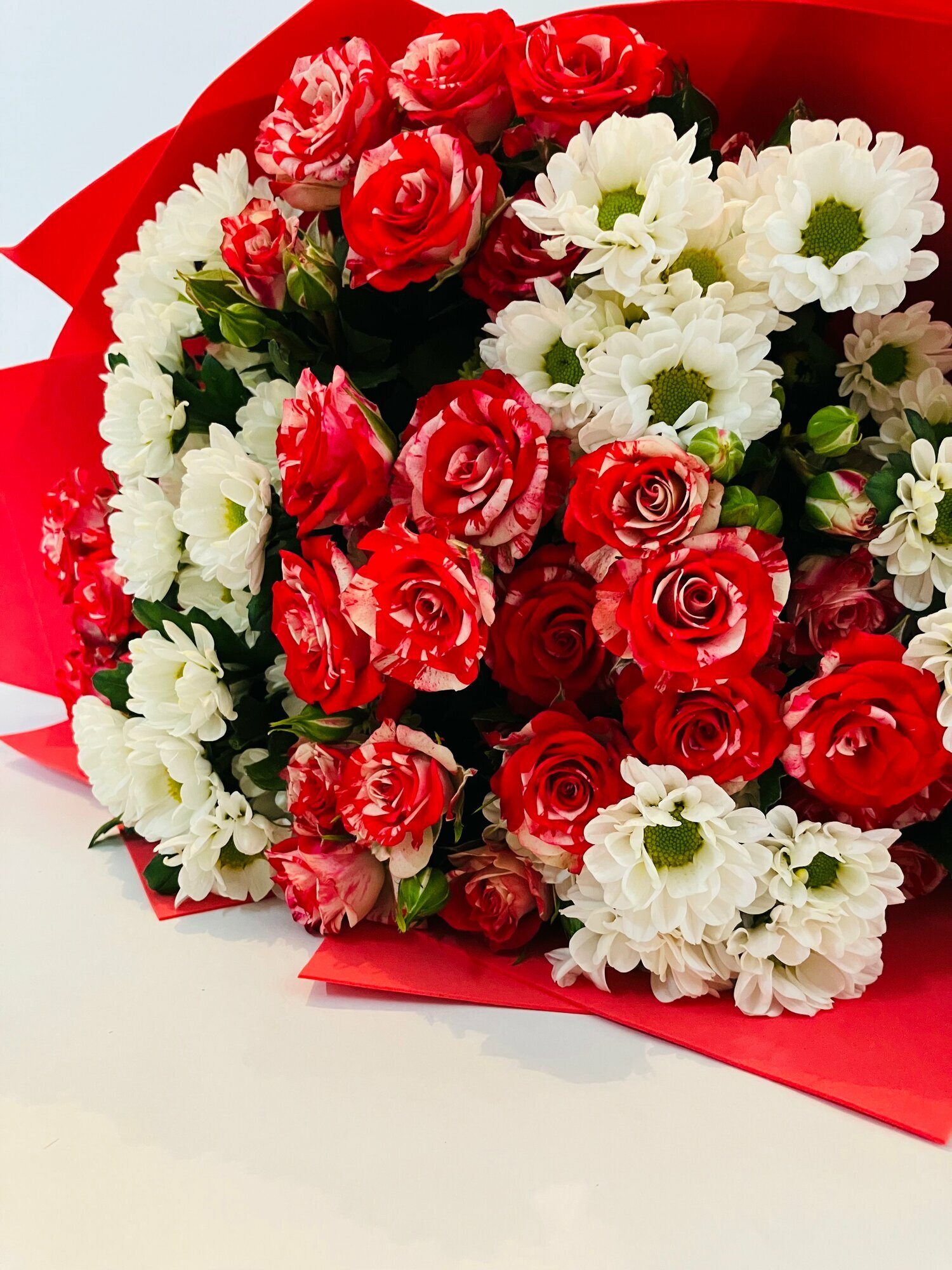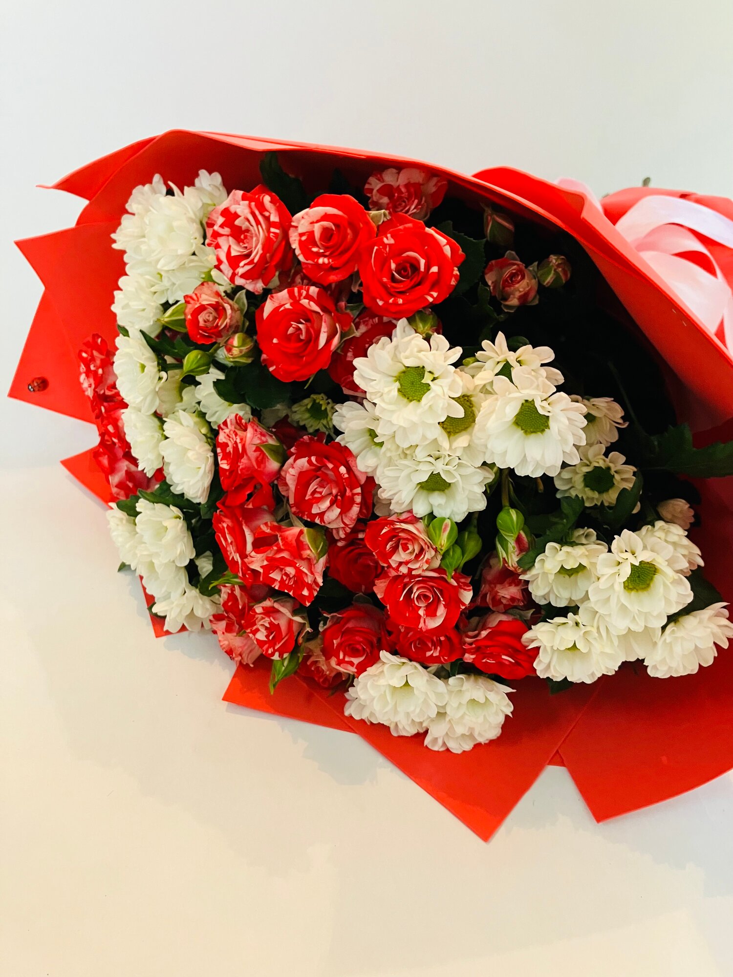Купить Букет из кустовых роз Фейерверк и белой хризантемы сантини в красной, дизайнерской упаковке, атласный бант.
