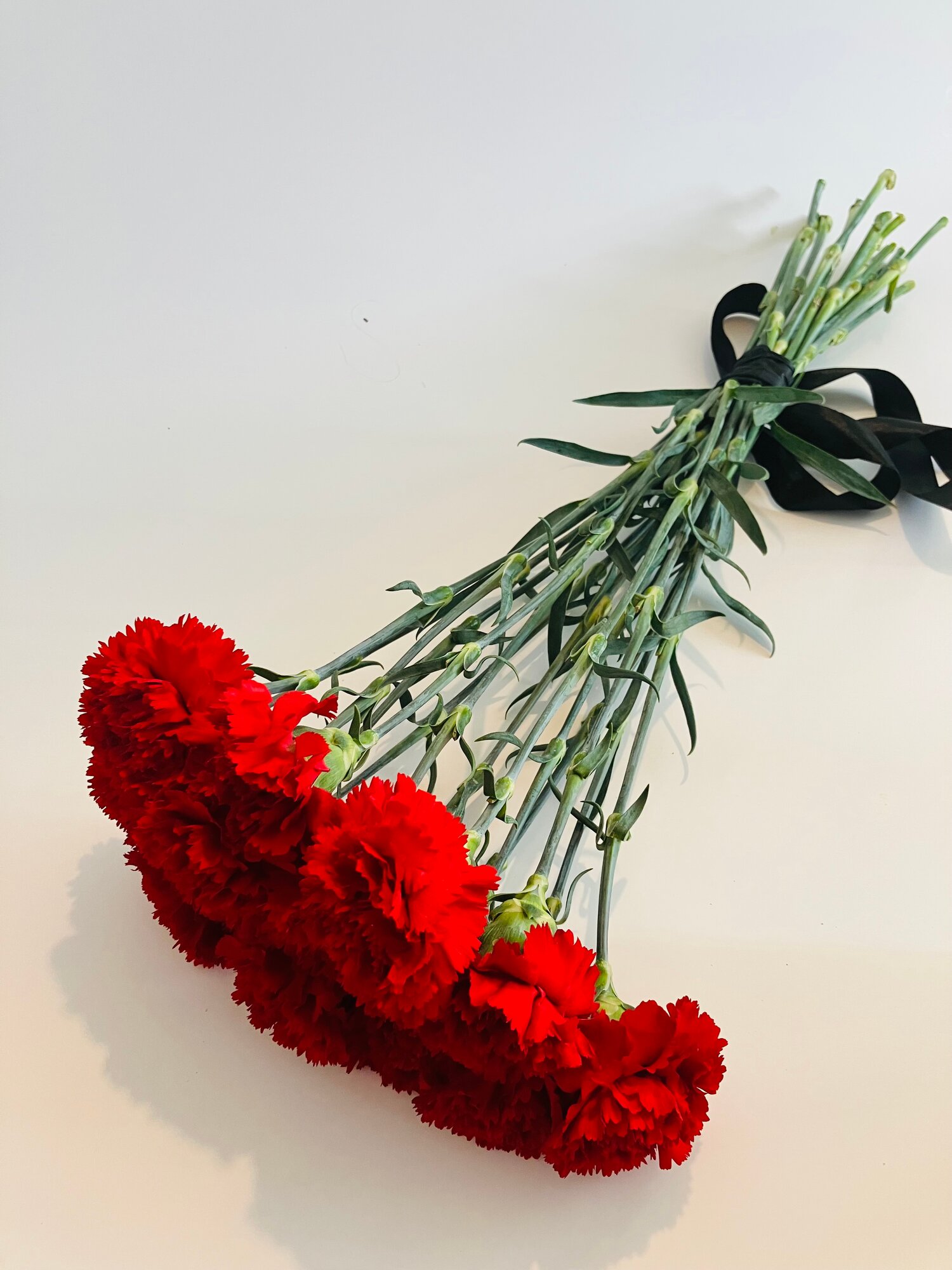 Букет гвоздик, красная гвоздика, свежий, 55 см+, 12 шт, под черный, атласный бант интересное: