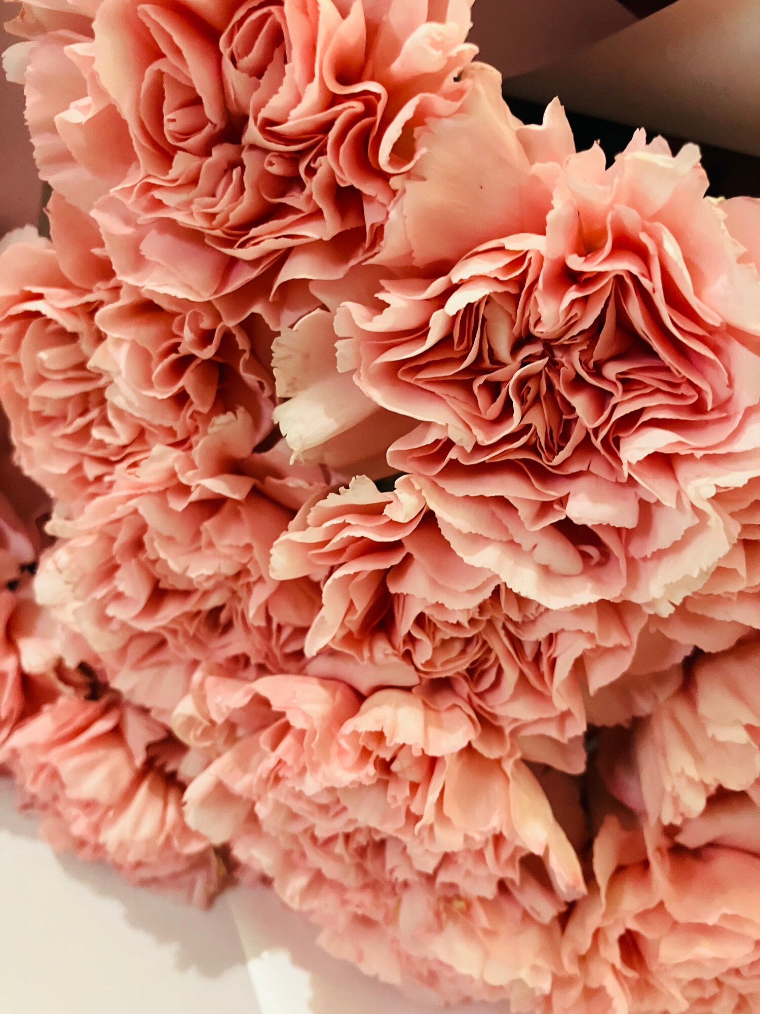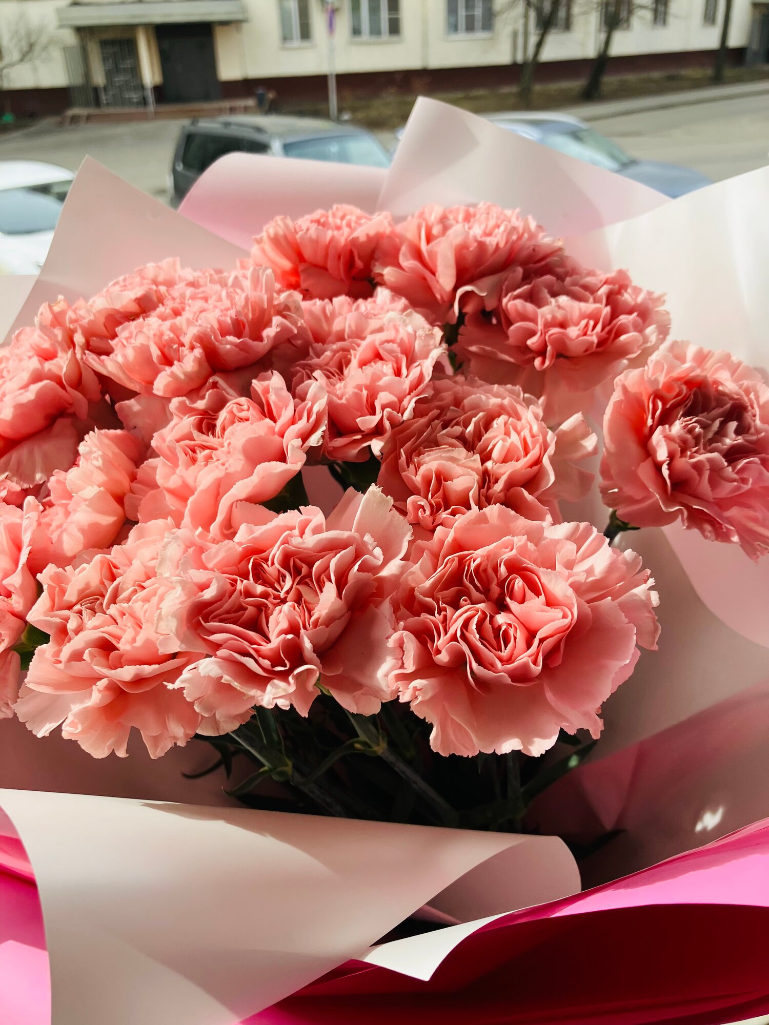 Букет из 19 свежих, розовых, сортовых гвоздик, 55 см+, в дизайнерской упаковке, атласный бант. интересное: