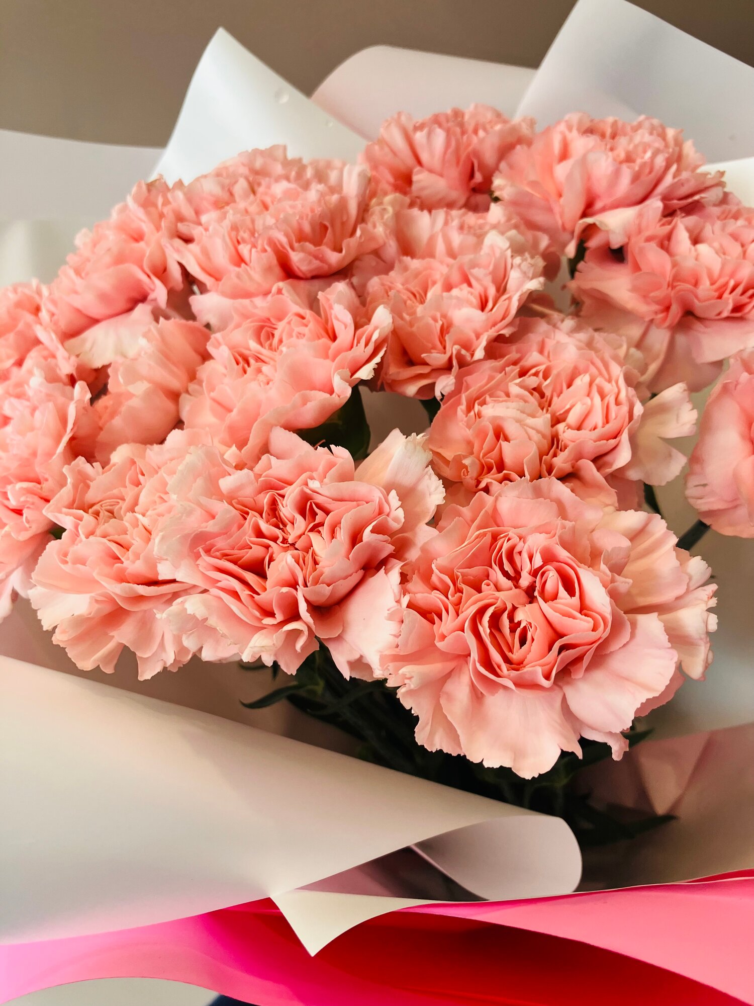 Купить Букет из 19 свежих, розовых, сортовых гвоздик, 55 см+, в дизайнерской упаковке, атласный бант.