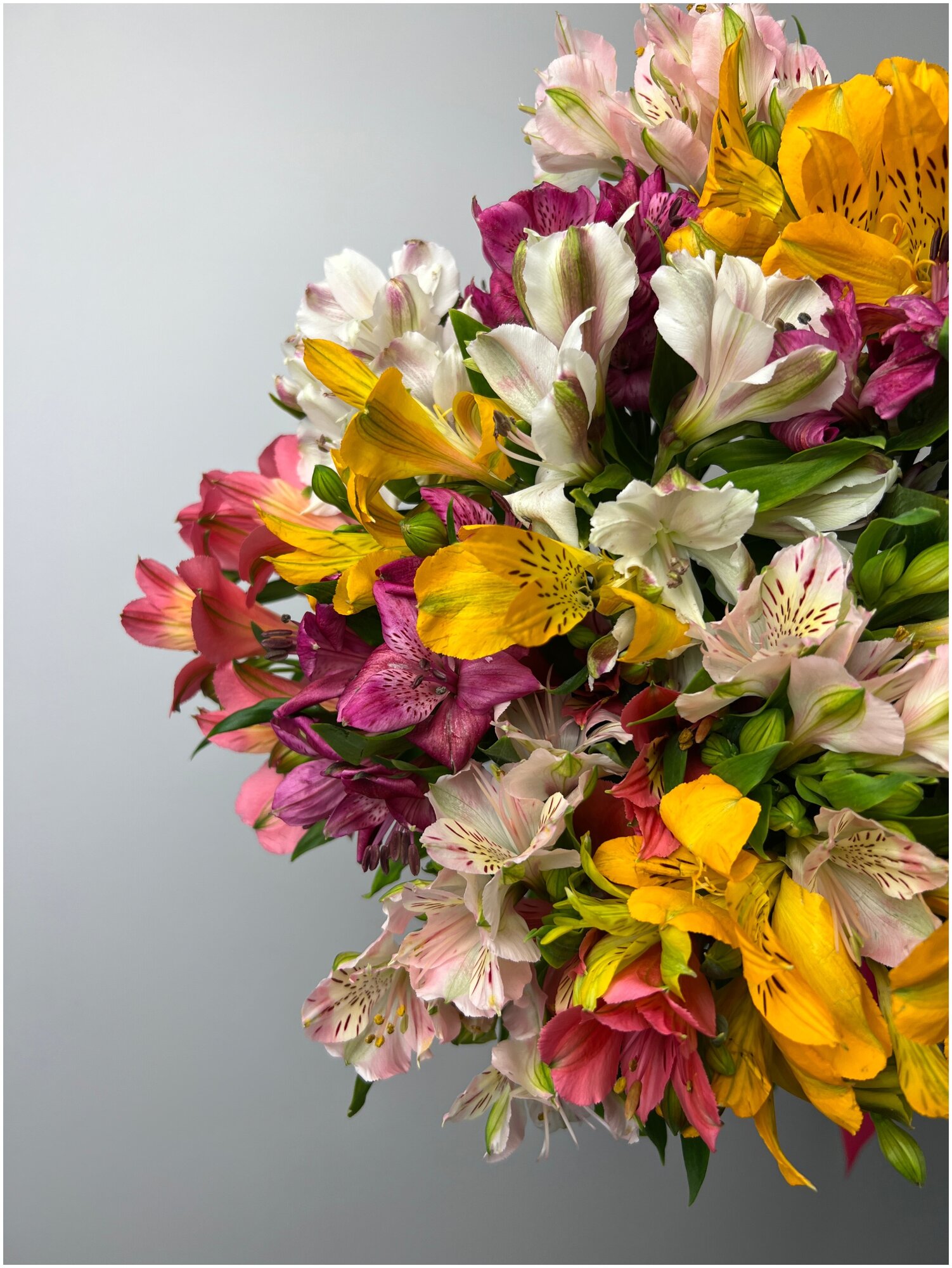 Купить Букет из альстромерии микс, 13 шт, высота 60 см+, атласный бант.