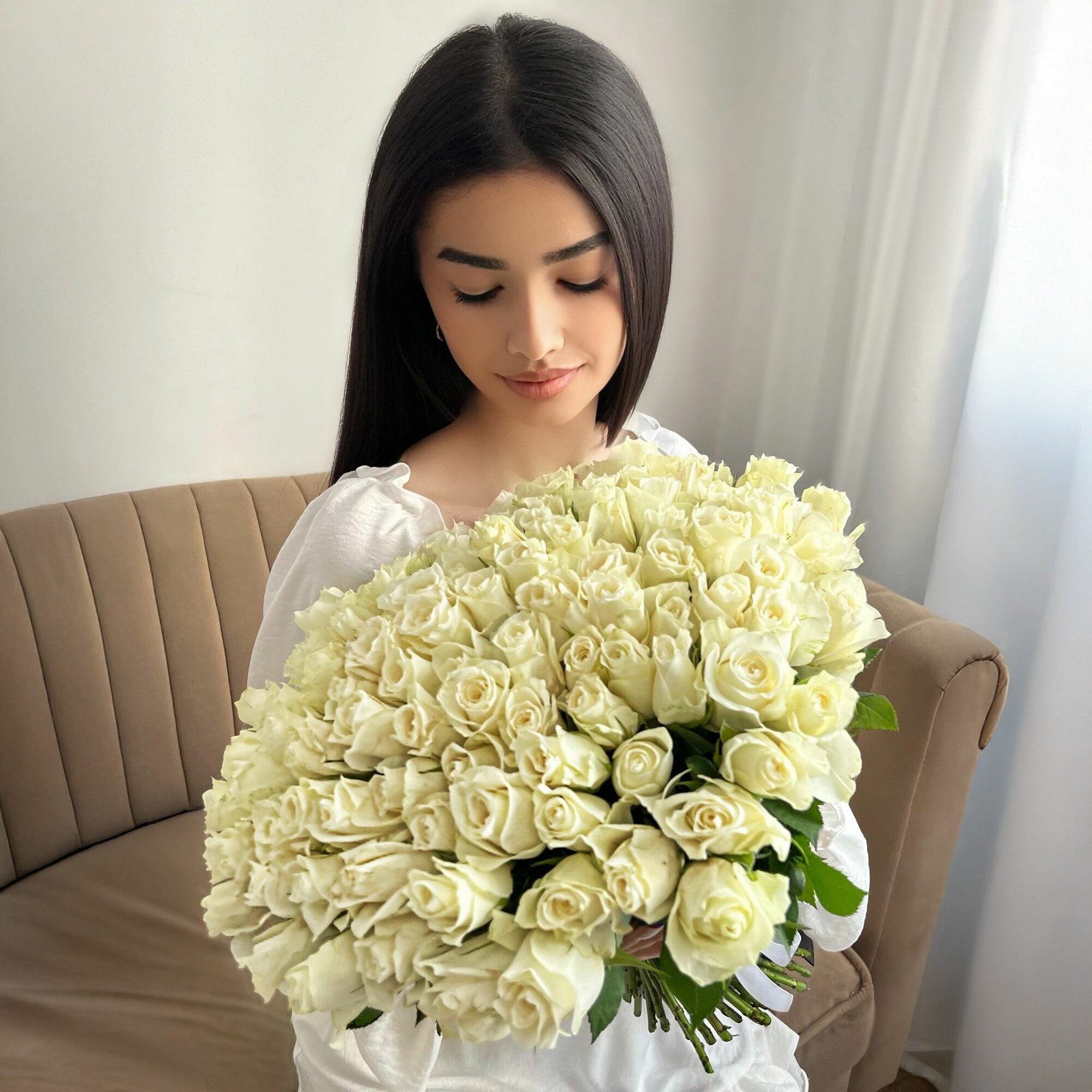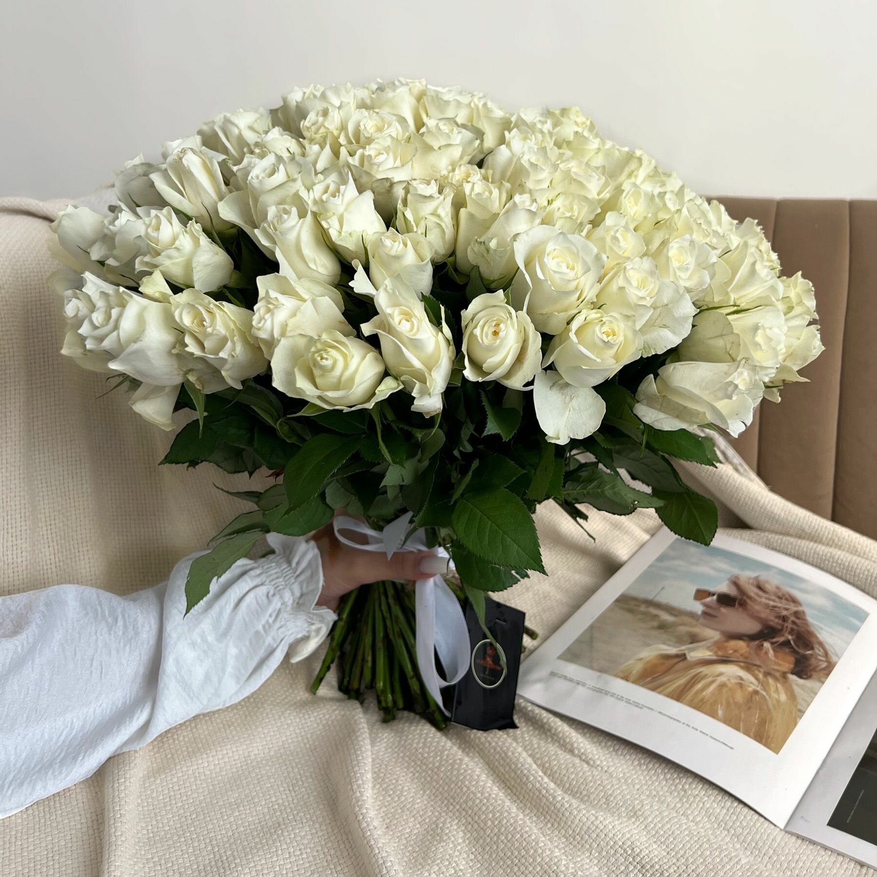 Купить Букет живых цветов из Белых роз 101 шт. высота 42 см. Luxus Flowers