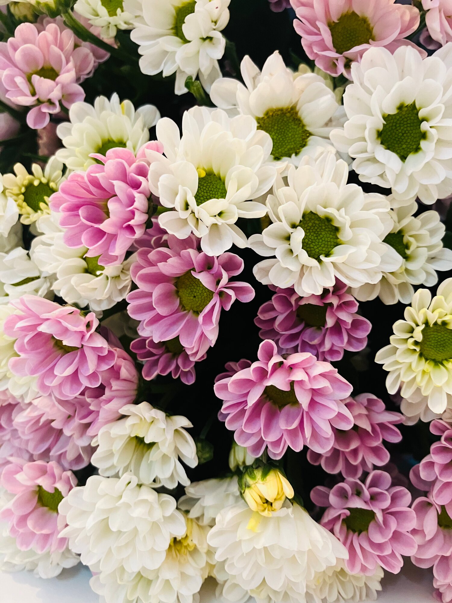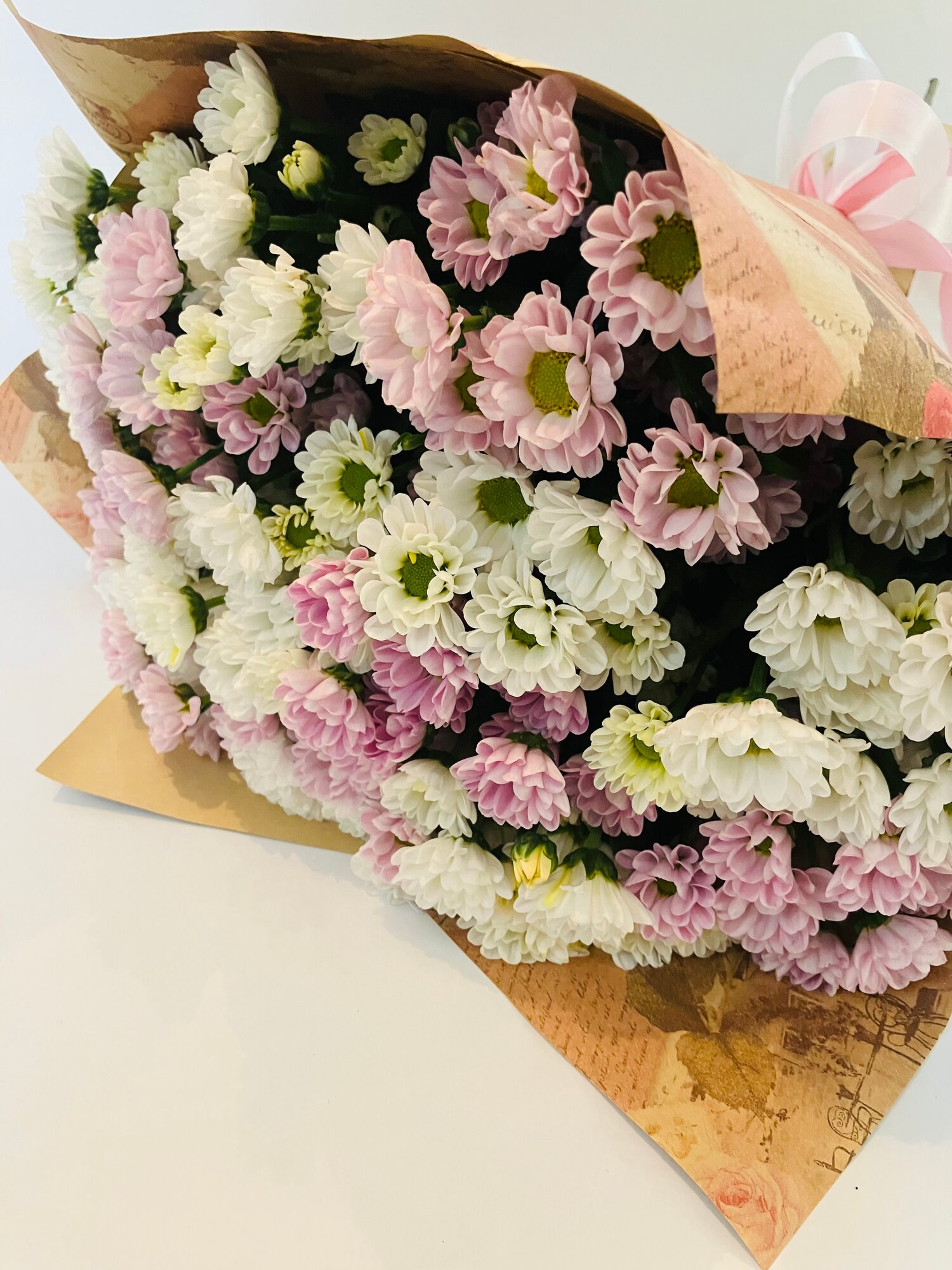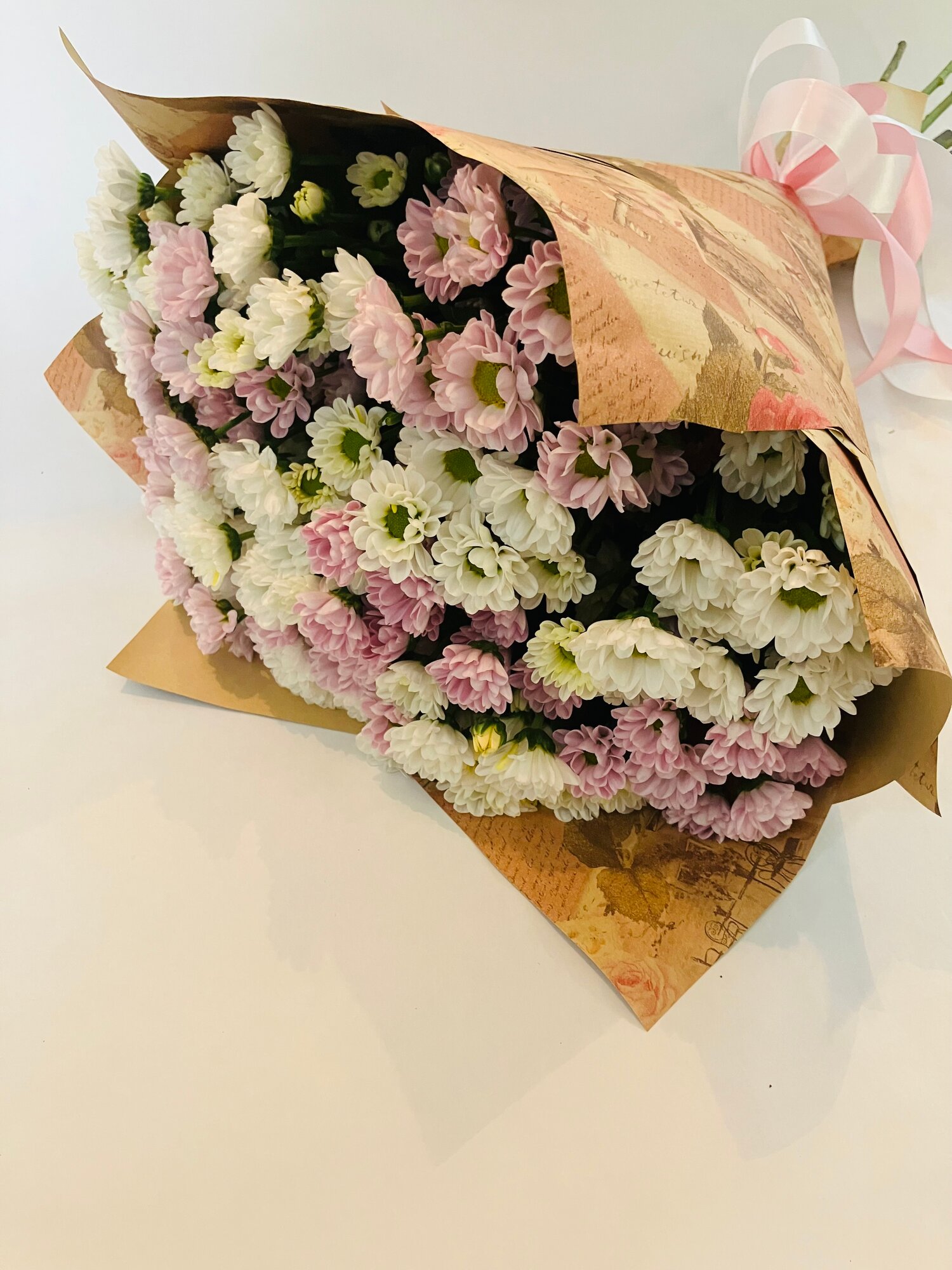 Букет из 13 хризантем сантини Росси белая и сантини Росси розовая, 55 см+, в упаковке крафт, атласный бант. интересное: