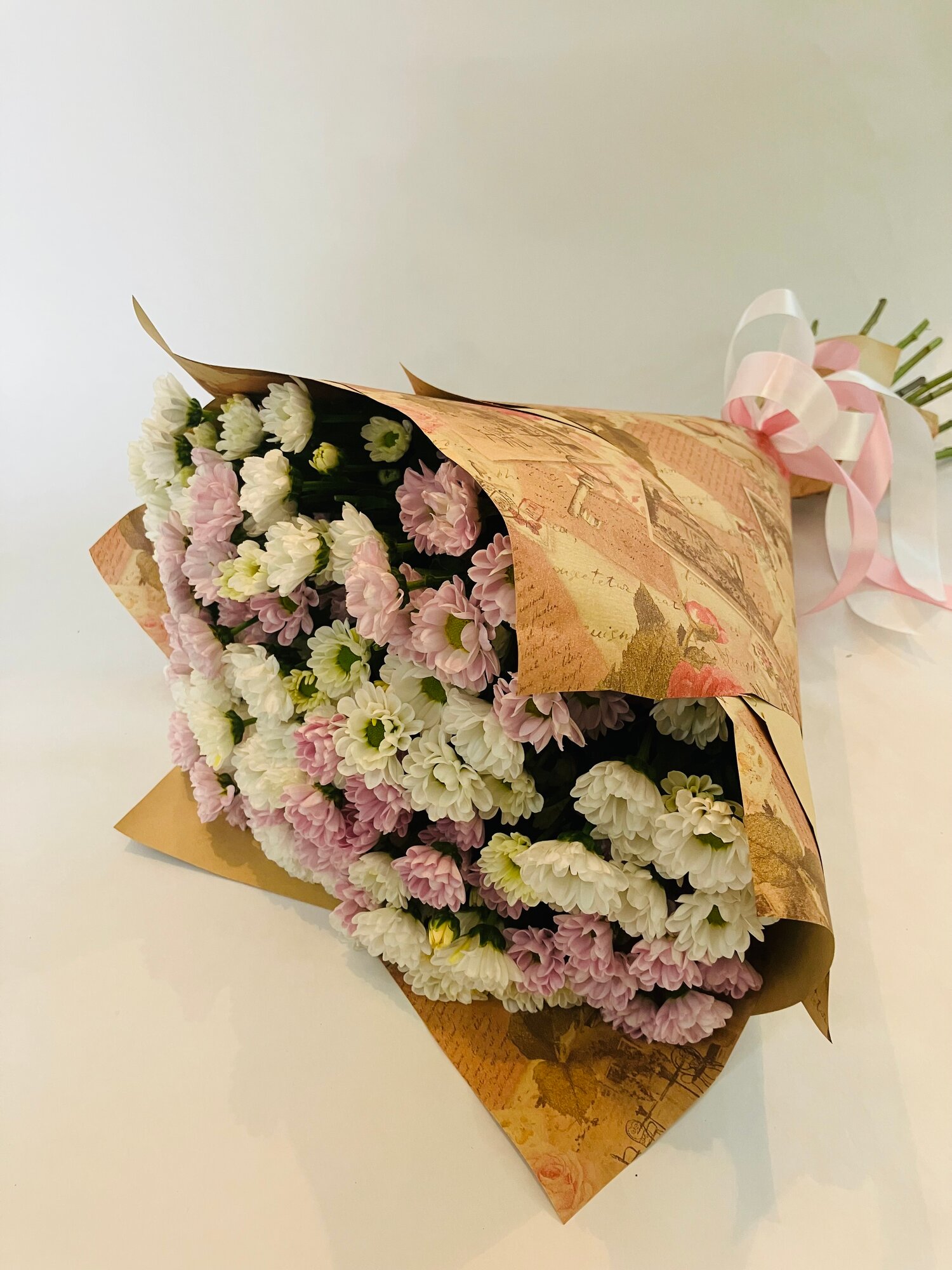 Купить Букет из 13 хризантем сантини Росси белая и сантини Росси розовая, 55 см+, в упаковке крафт, атласный бант.