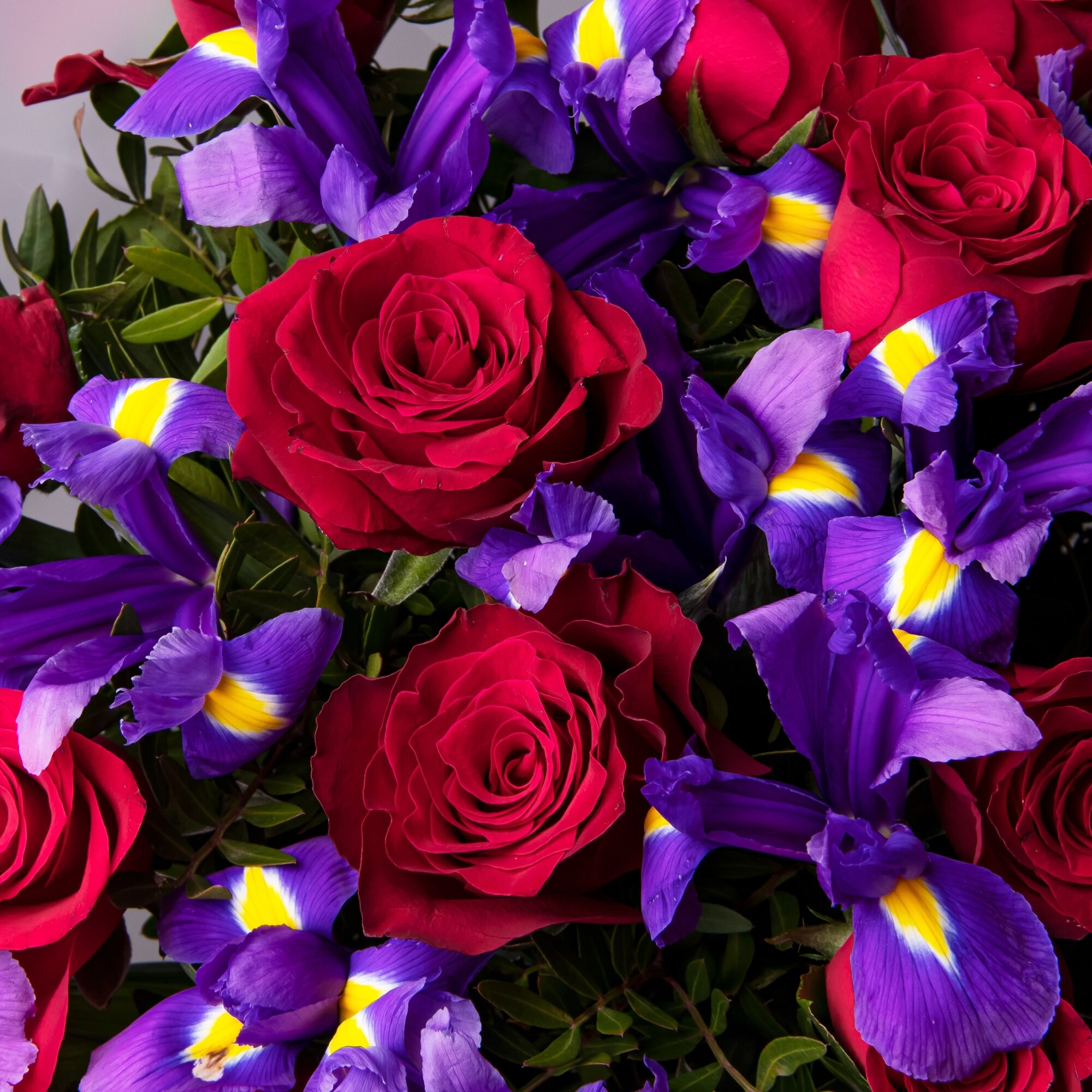 Купить Дуобукет из красной розы и синего ириса в коробке и аквабоксе от Простоцветы