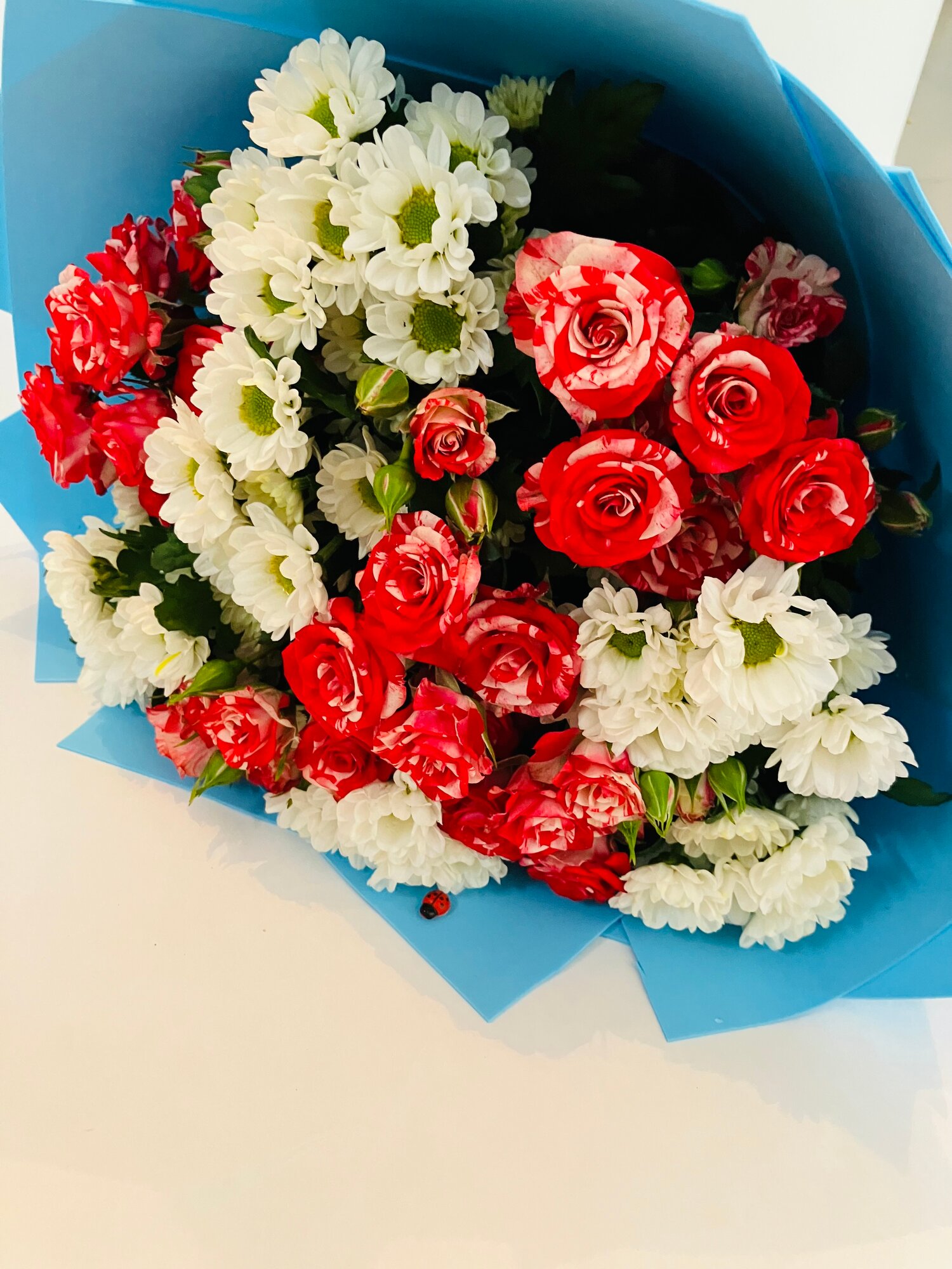 Купить Букет из кустовой розы Фейерверк и белой хризантемы сантини, в голубой, дизайнерской упаковке, атласный бант.
