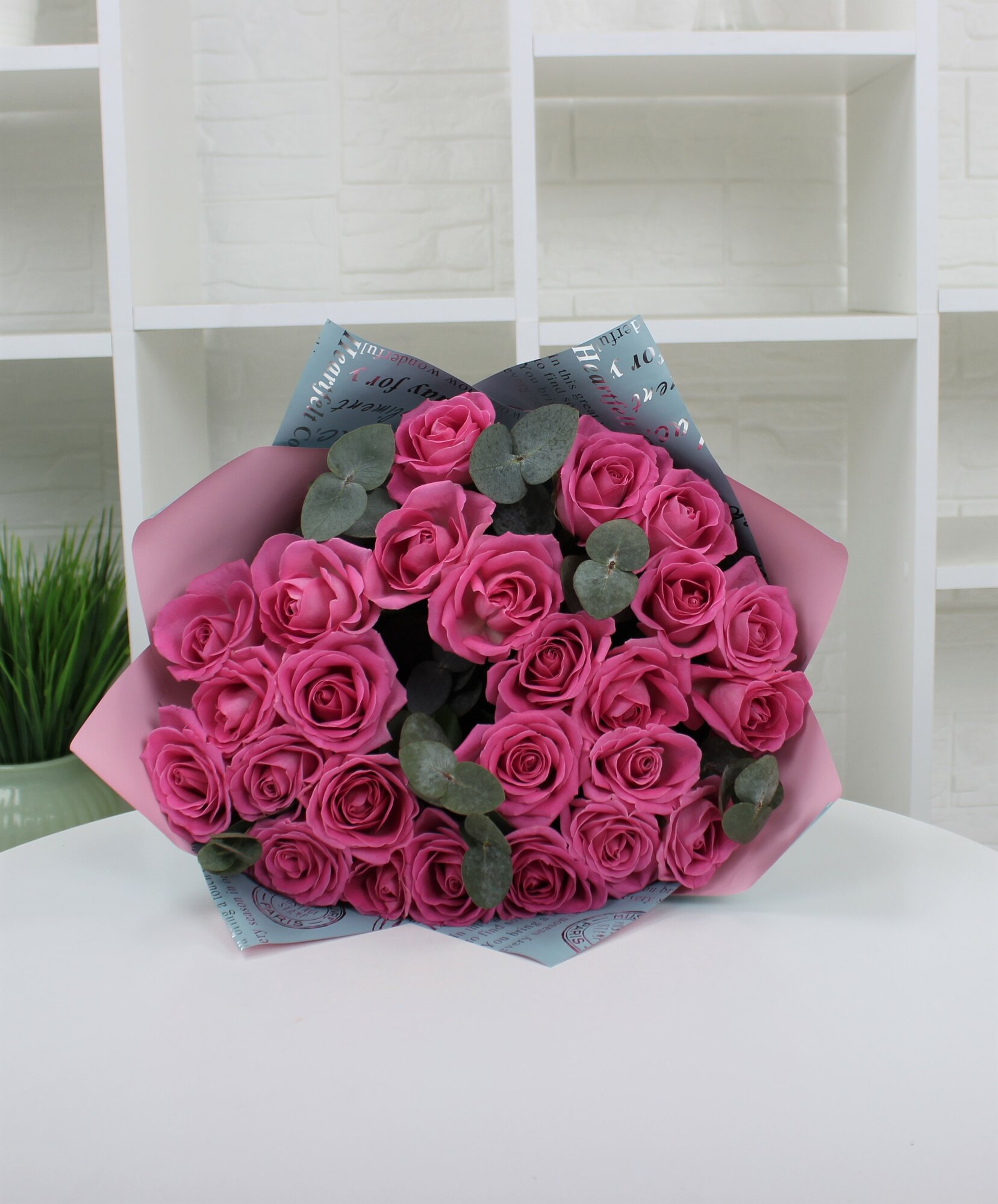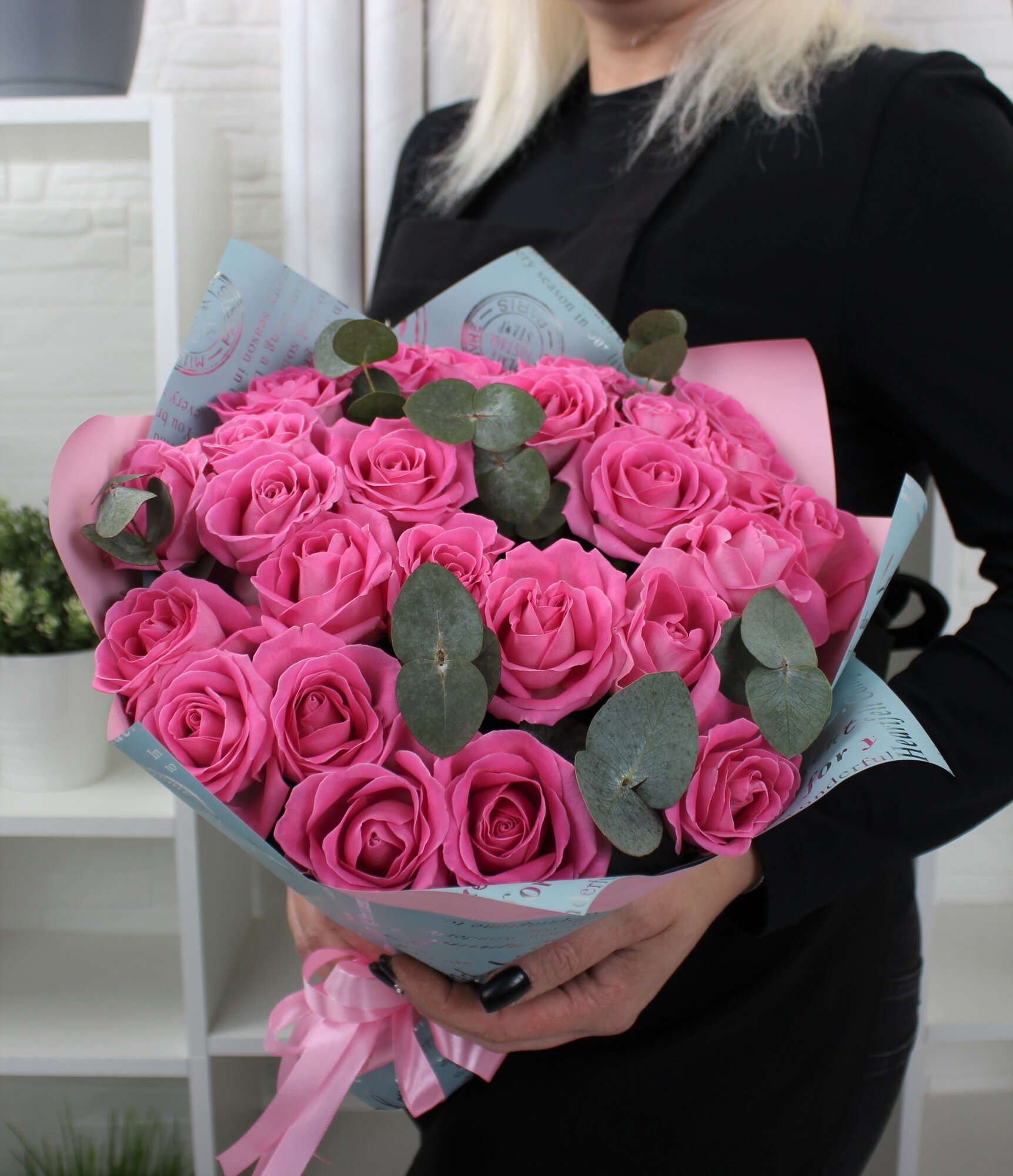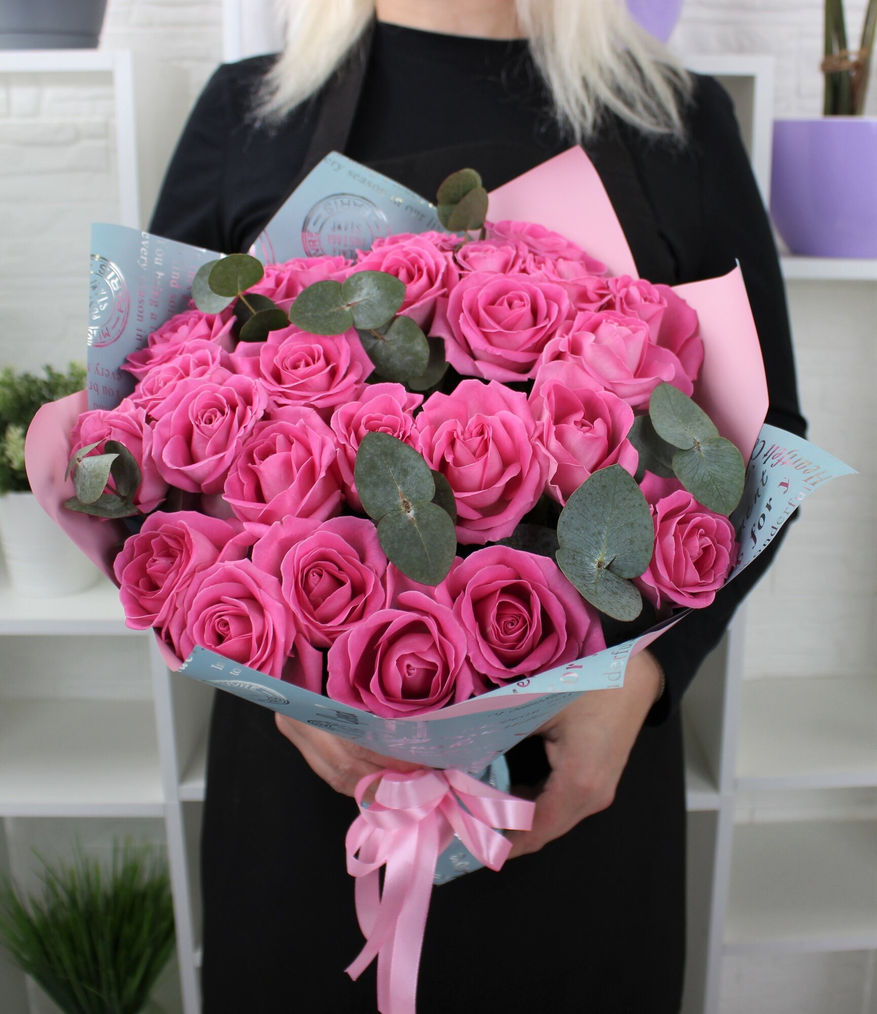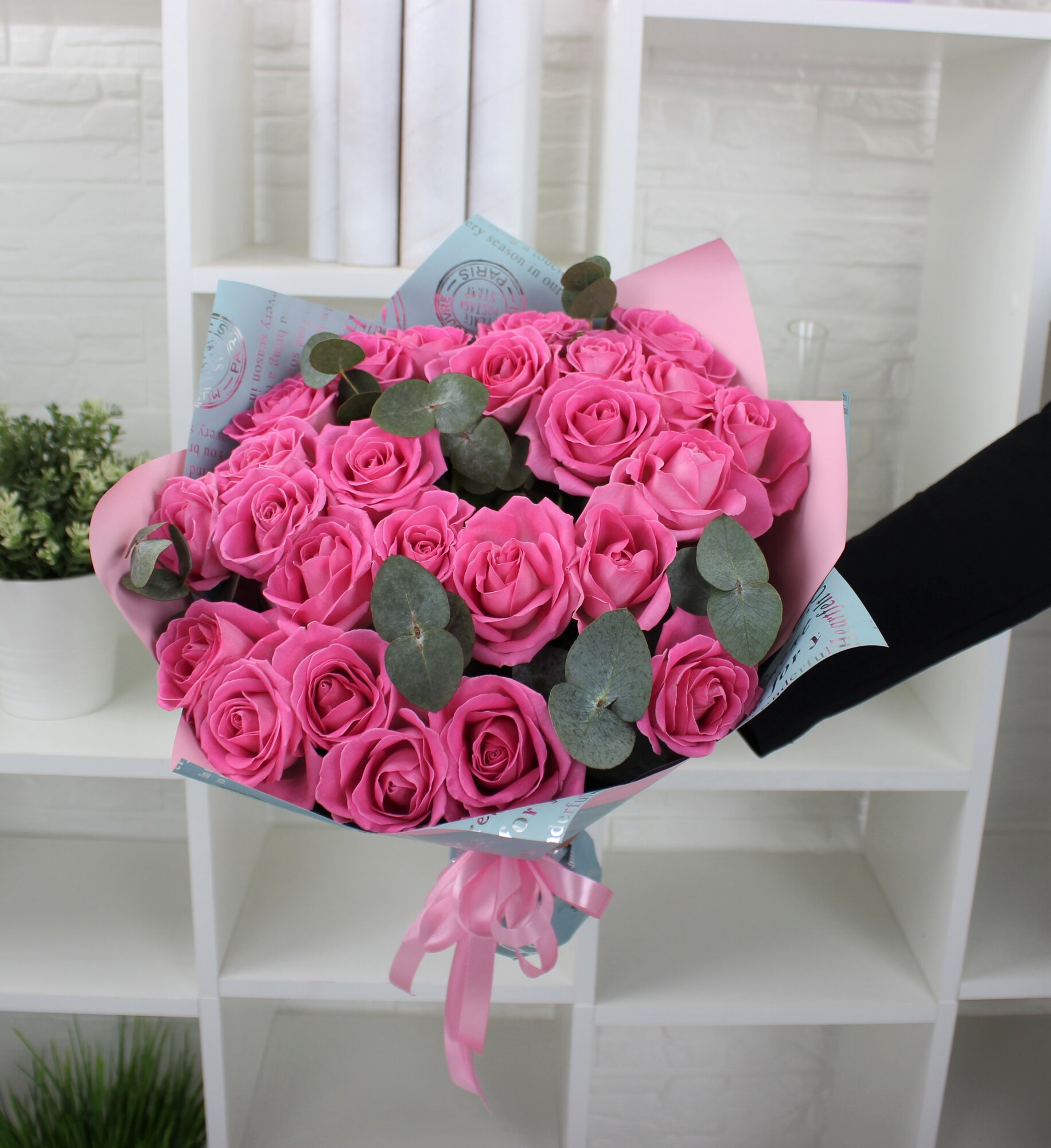 25 розовая роза 40см с эвкалиптом интересное: