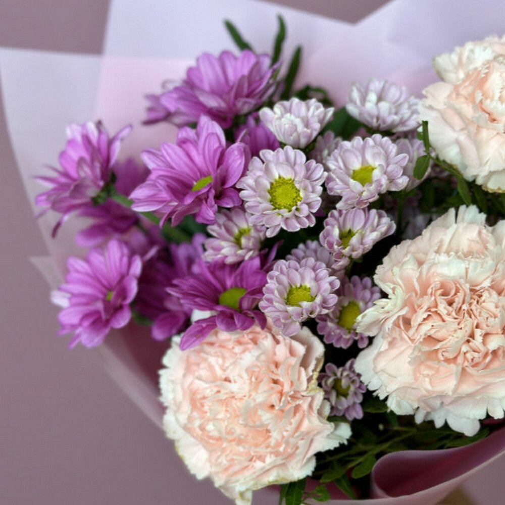 Цветы живые букет из гвоздик и хризантем в упаковке с лентой "Ласковый миг" Flor2u интересное: