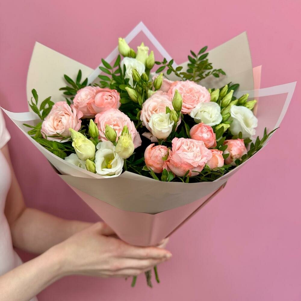 Букет из кустовой пионовидной розы, эустомы и зелени фисташки от Bestflo купить с доставкой интересное: