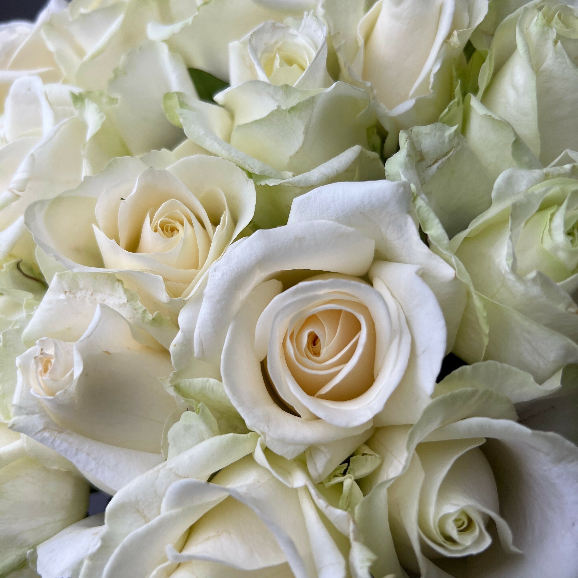 Живые цветы букет белых роз 51 шт 60 см "Шепот ангелов", сорт "Аваланж"