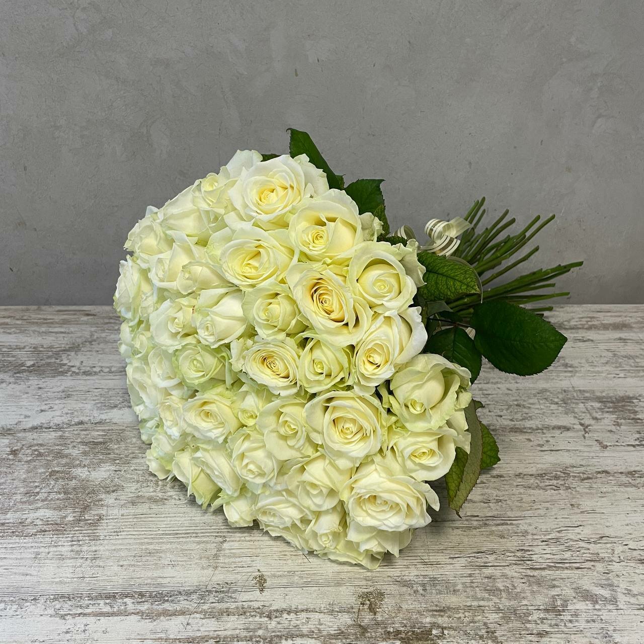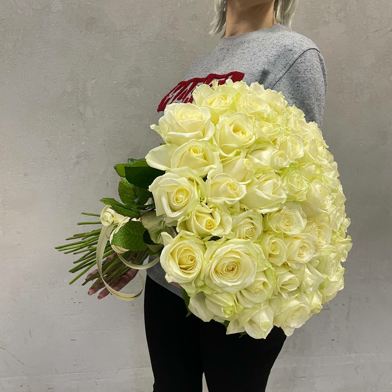 Купить Живые цветы букет белых роз 51 шт 60 см "Шепот ангелов", сорт "Аваланж"