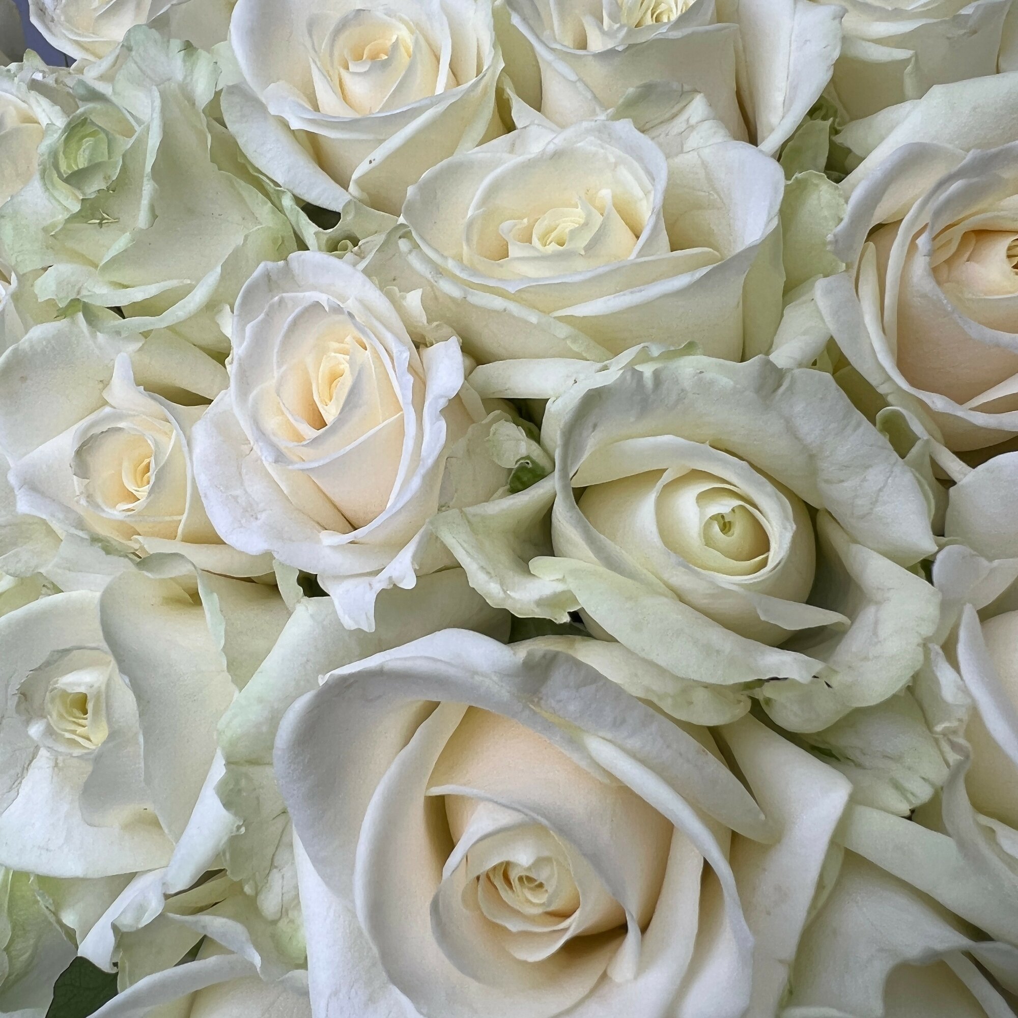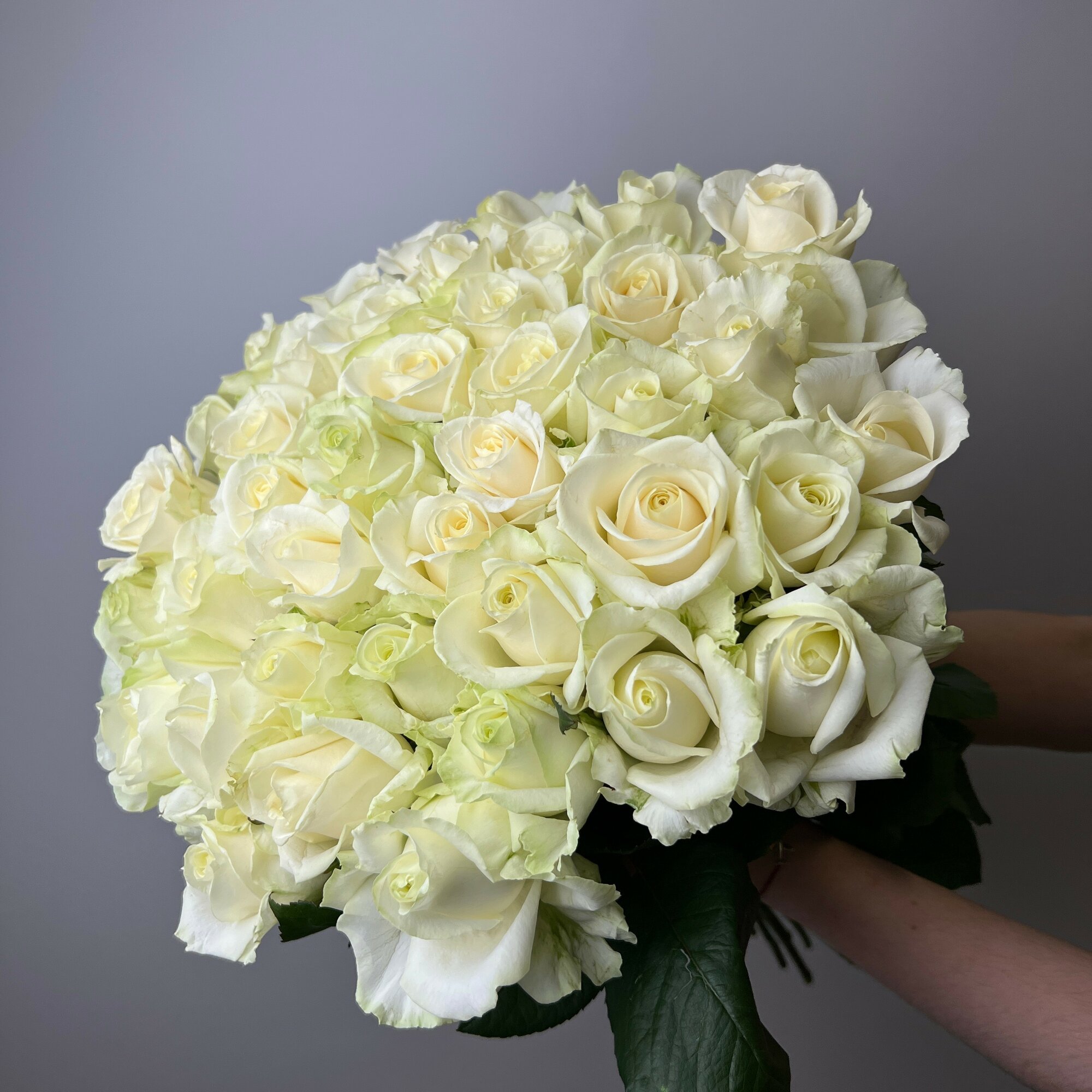 Живые цветы букет белых роз 51 шт 60 см "Шепот ангелов", сорт "Аваланж"
