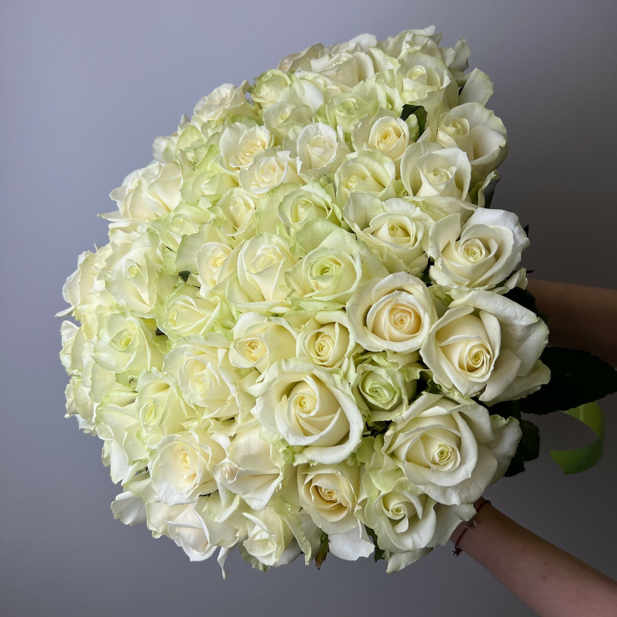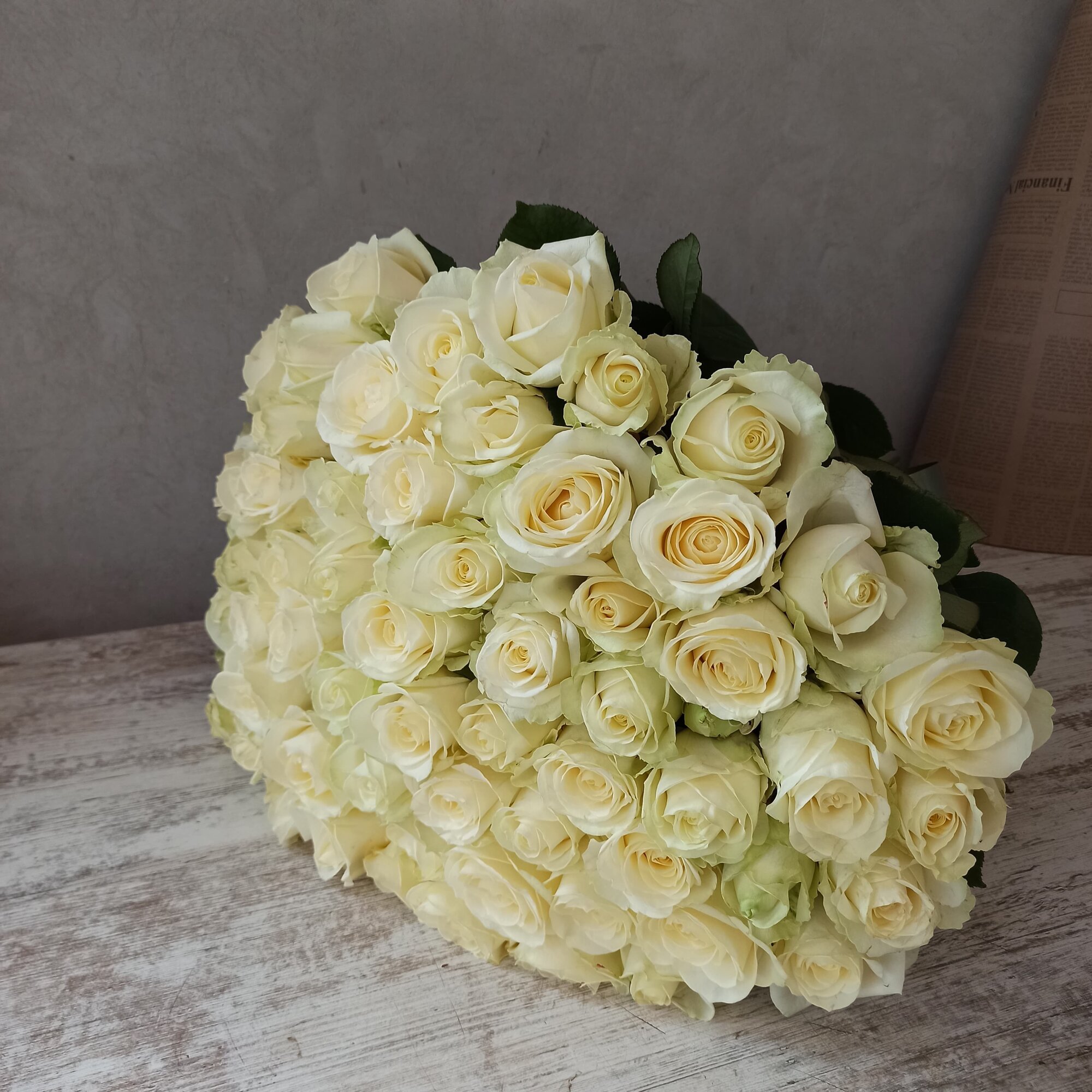 Живые цветы букет из 81 белой розы высотой 60 см "Листопад Ангела", сорт - "Аваланж"