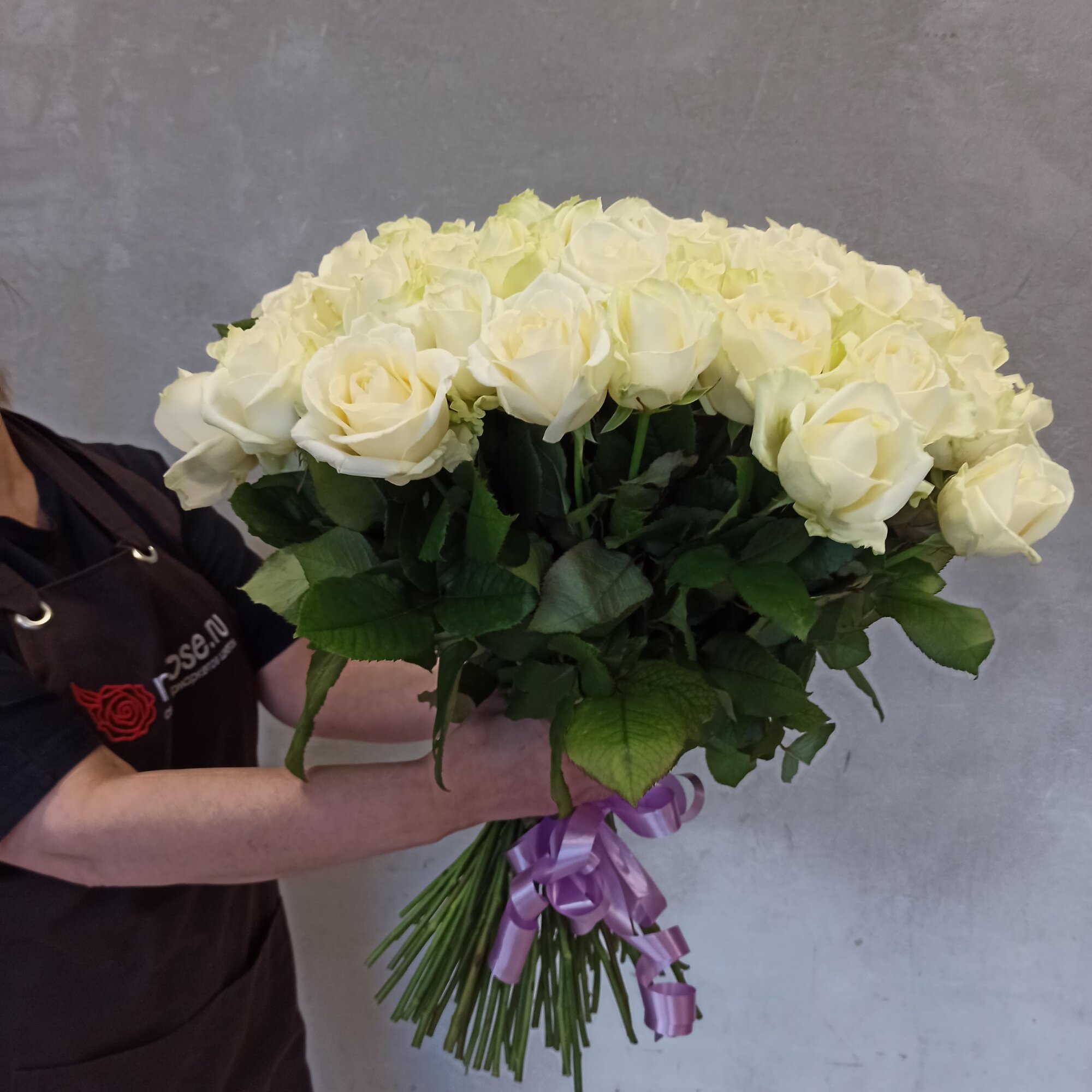 Живые цветы букет белых роз 51 шт 60 см "Шепот ангелов", сорт "Аваланж"