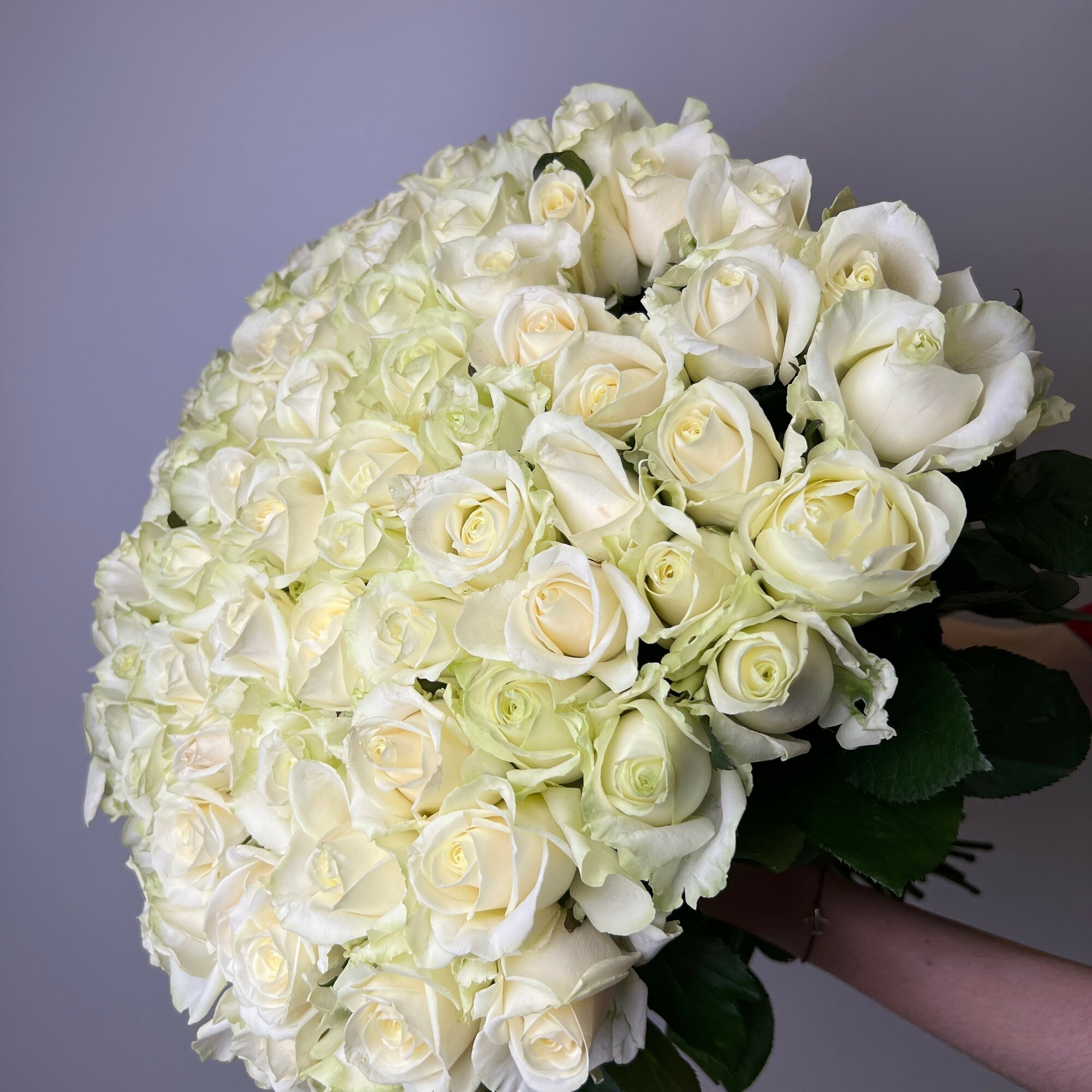 Купить Живые цветы букет из 81 белой розы высотой 60 см "Листопад Ангела", сорт - "Аваланж"