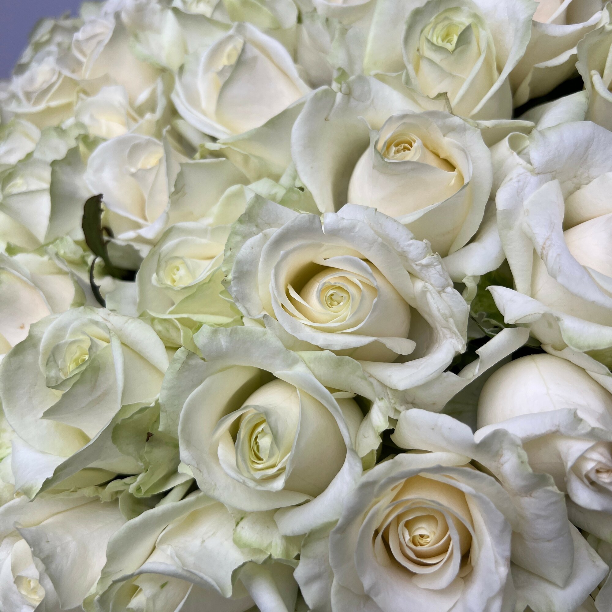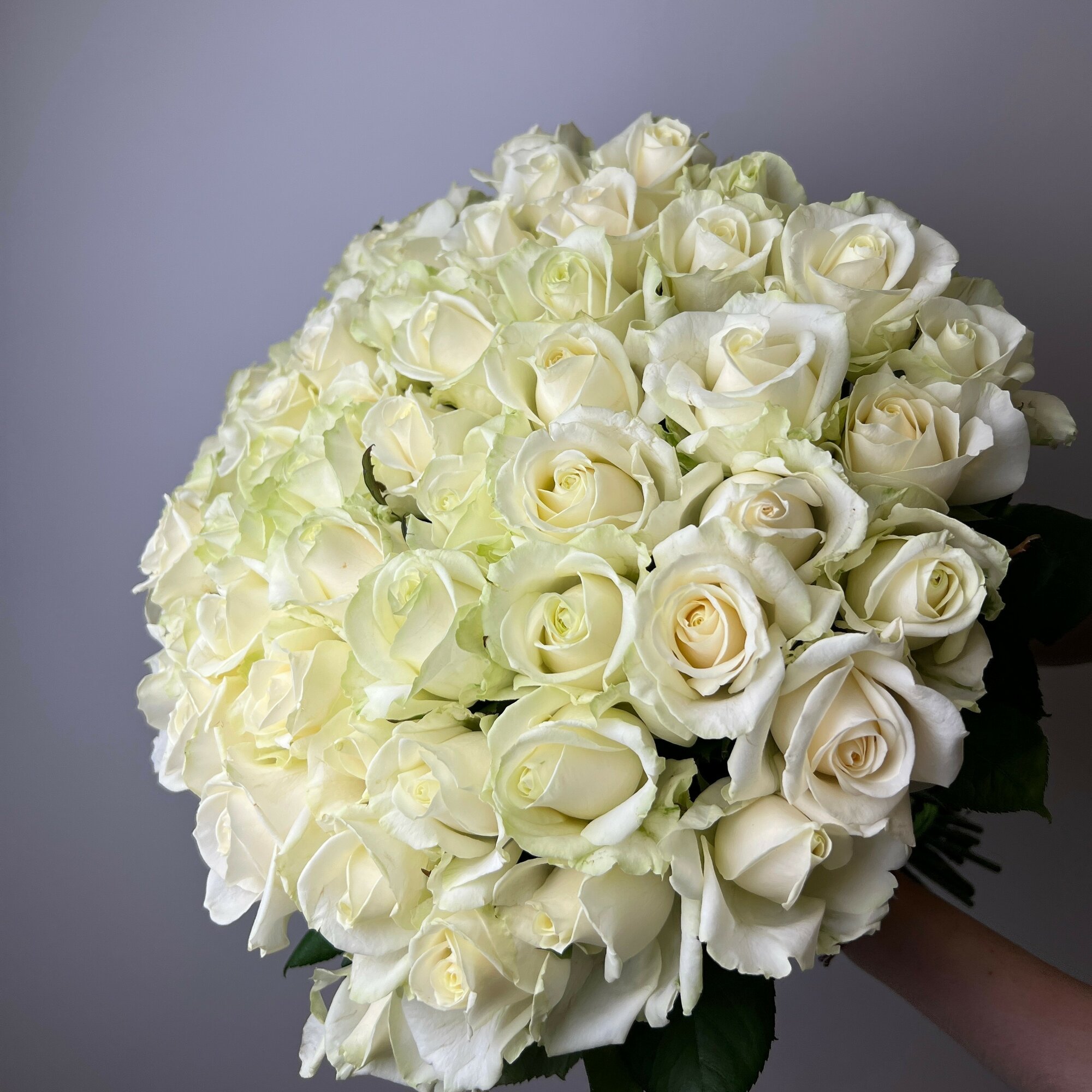 Живые цветы букет белых роз 51 шт 60 см "Шепот ангелов", сорт "Аваланж"
