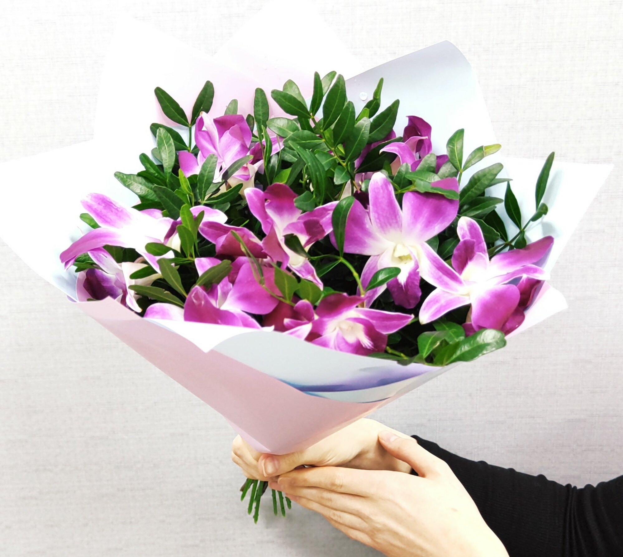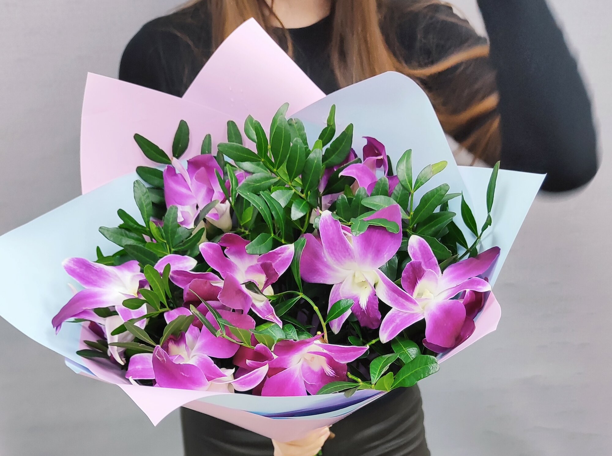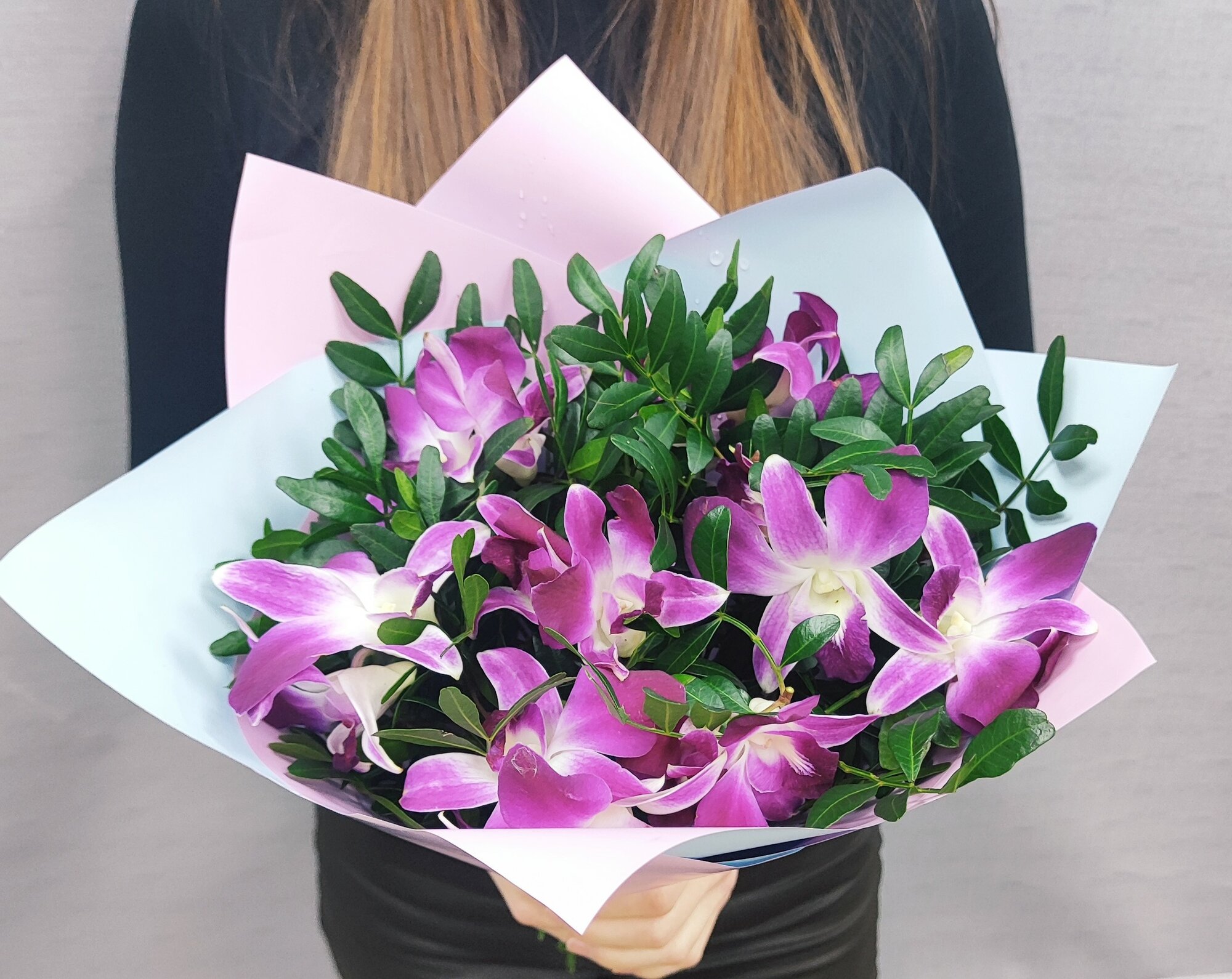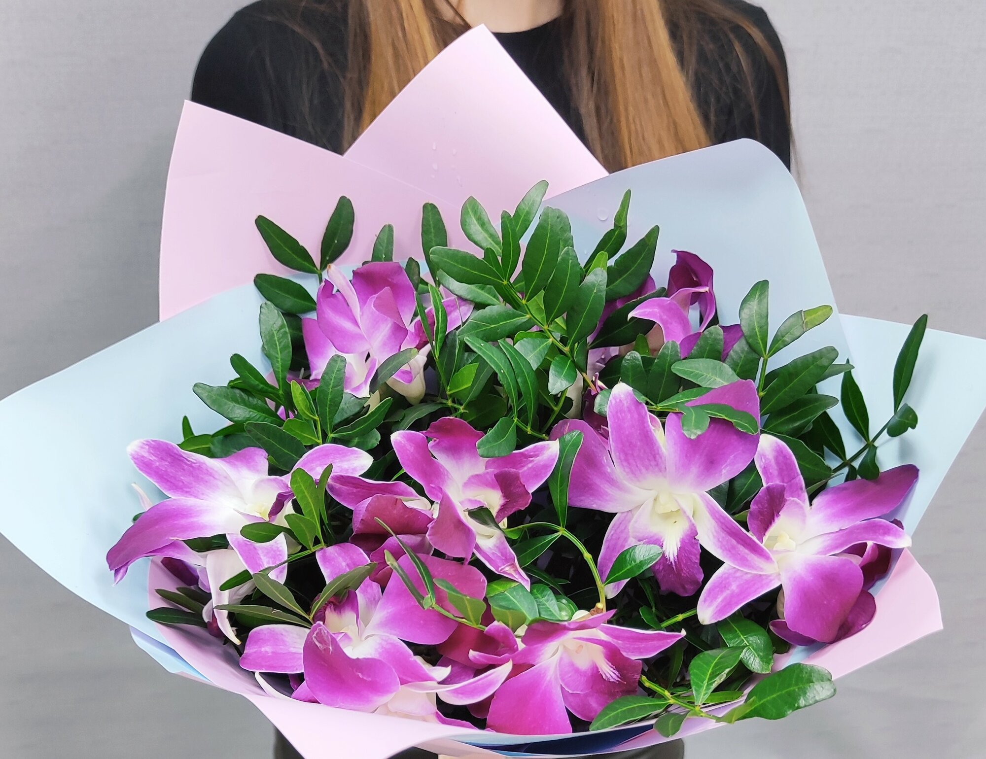 Купить Букет с Розовой Орхидеи дендробиум в сочетании с зеленью фисташки