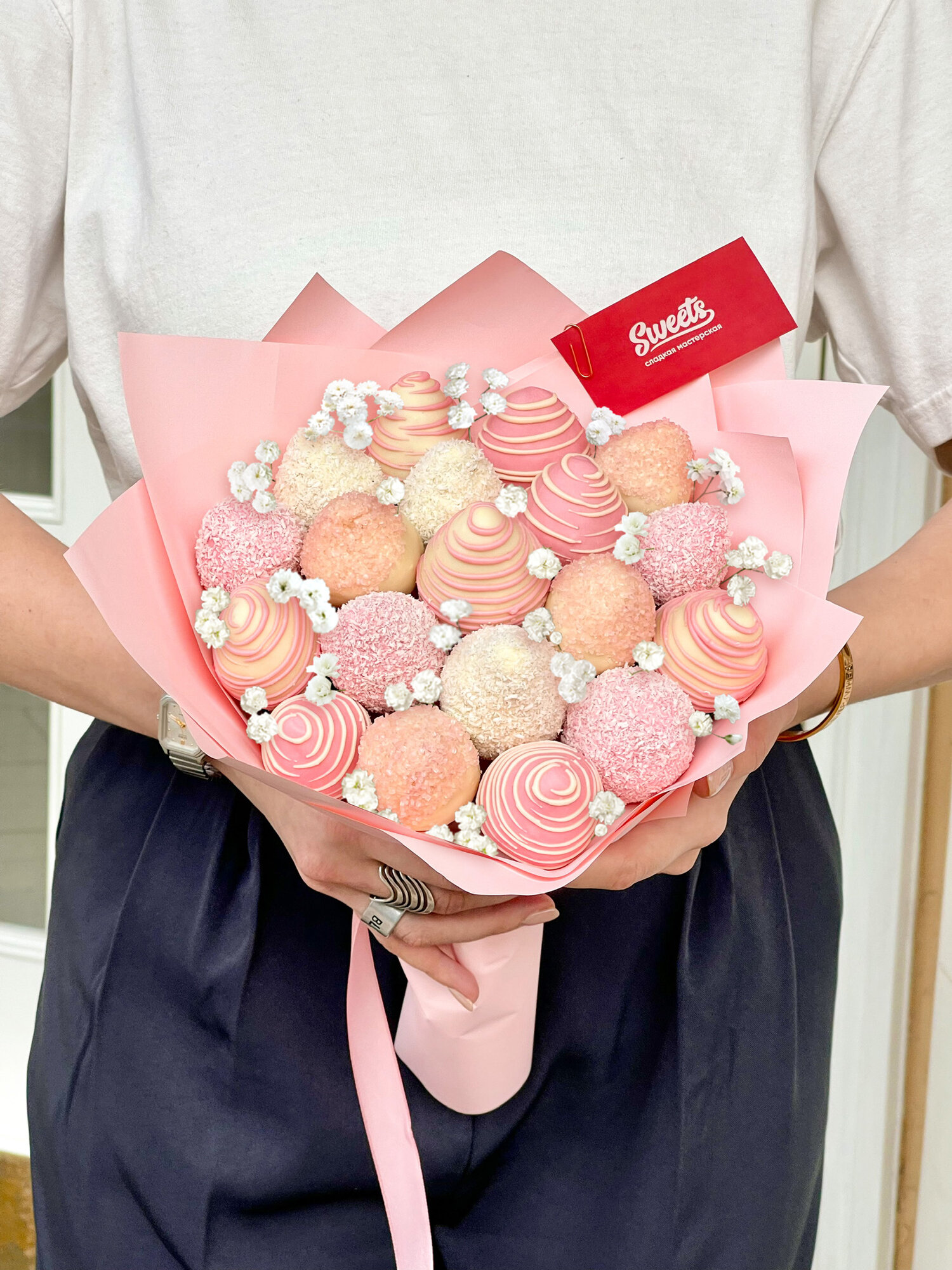 Букет Sweets "Spring", гипсофила и клубника в шоколаде, размер S, высота 25 см интересное: