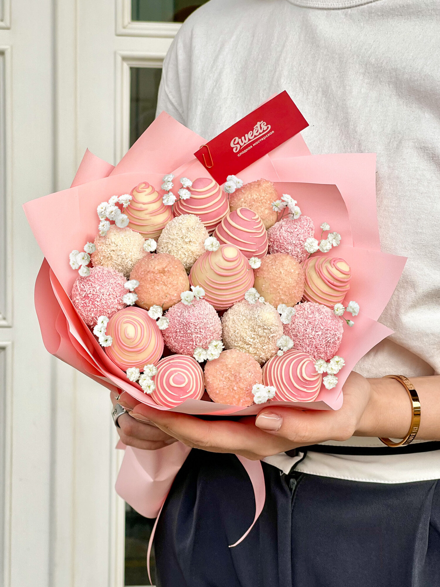 Купить Букет Sweets "Spring", гипсофила и клубника в шоколаде, размер S, высота 25 см