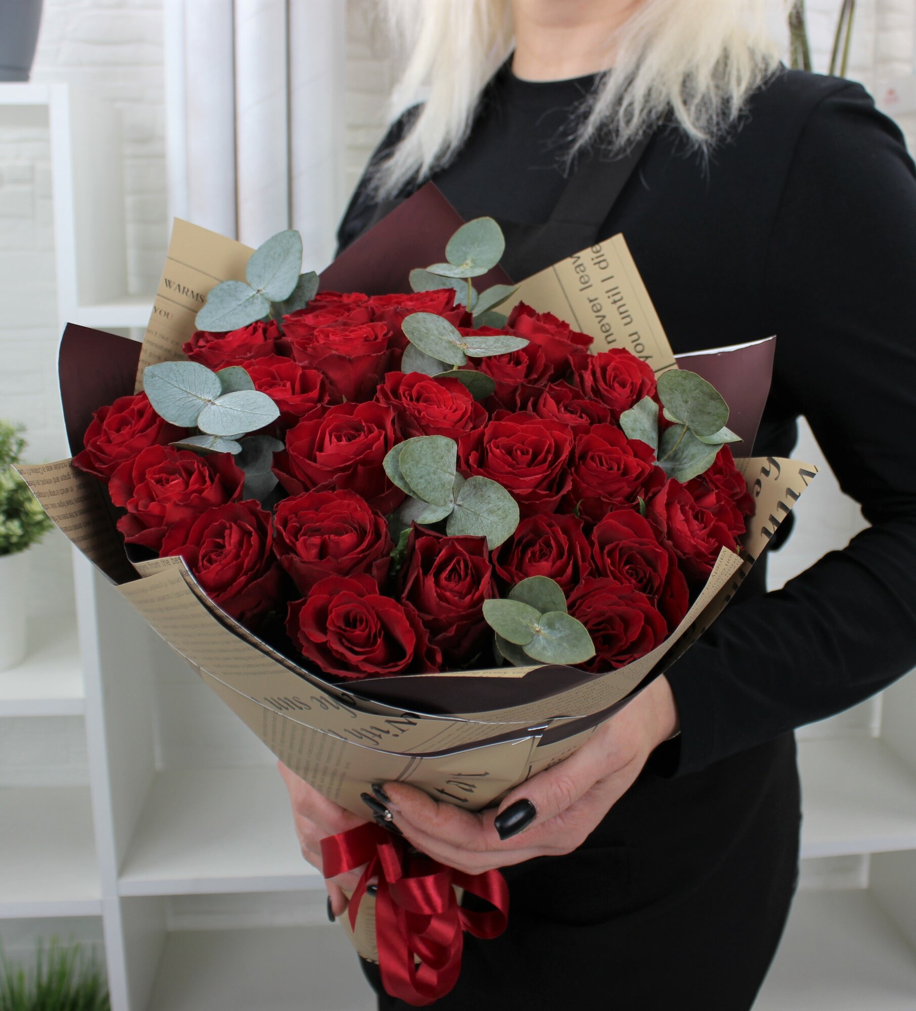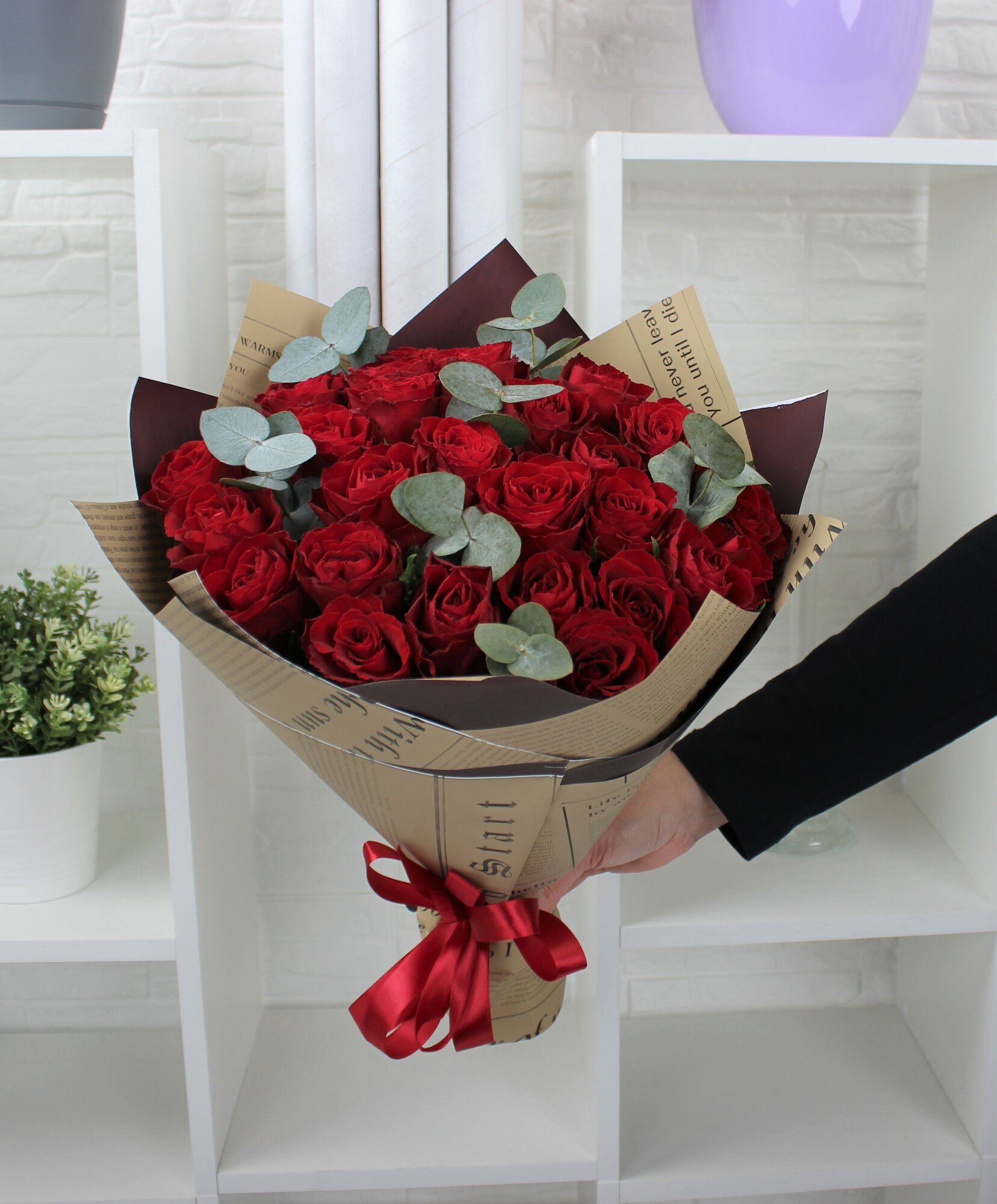 25 красных роз 40см с эвкалиптом интересное: